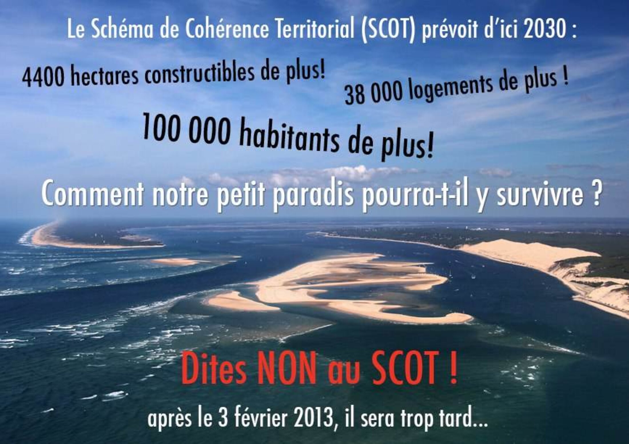 - la situation est encore pire que ce que nous imaginions : en réalité ce n'est pas 70 000 ni même 100 000 habitants de plus que nous pourrions avoir d'ici 2030 mais beaucoup plus ! ... l'Etat a en effet estimé que sur les seules "extensions" de zones urbanisables, il y aurait de quoi construire assez de logements pour... 200 000 habitants supplémentaires !!! Il nous a été confirmé que les élus du Bassin se sont mis d'accord pour construire d'emblée 38 000 logements répartis sur 4400 hectares voués au bétonnage ! il y aura bien des zones industrielles et commerciales gigantesques en périphérie des villes et des morceaux de forêts ravagés. Il nous a été confirmé que RIEN, absolument RIEN n'a été anticipé quant aux problèmes d'assainissement des eaux usées et de traitement des déchets ! En résumé, nos élus n'ont, pour certains, aucune vision d'avenir du Bassin et du Val de l'Eyre, pour d'autres sont corrompus directement ou indirectement par le lobby de l'immobilier. La situation est catastrophique et nous devons nous mobiliser massivement avant le 4 février pour convaincre les enquêteurs public de donner un avis défavorable au SCOT ! l'Etat est de notre côté donc il faut le solliciter ! nous publierons une pétition ce soir ainsi qu'un modèle de lettre. Mobilisons nous pour sauver le Bassin d'Arcachon !