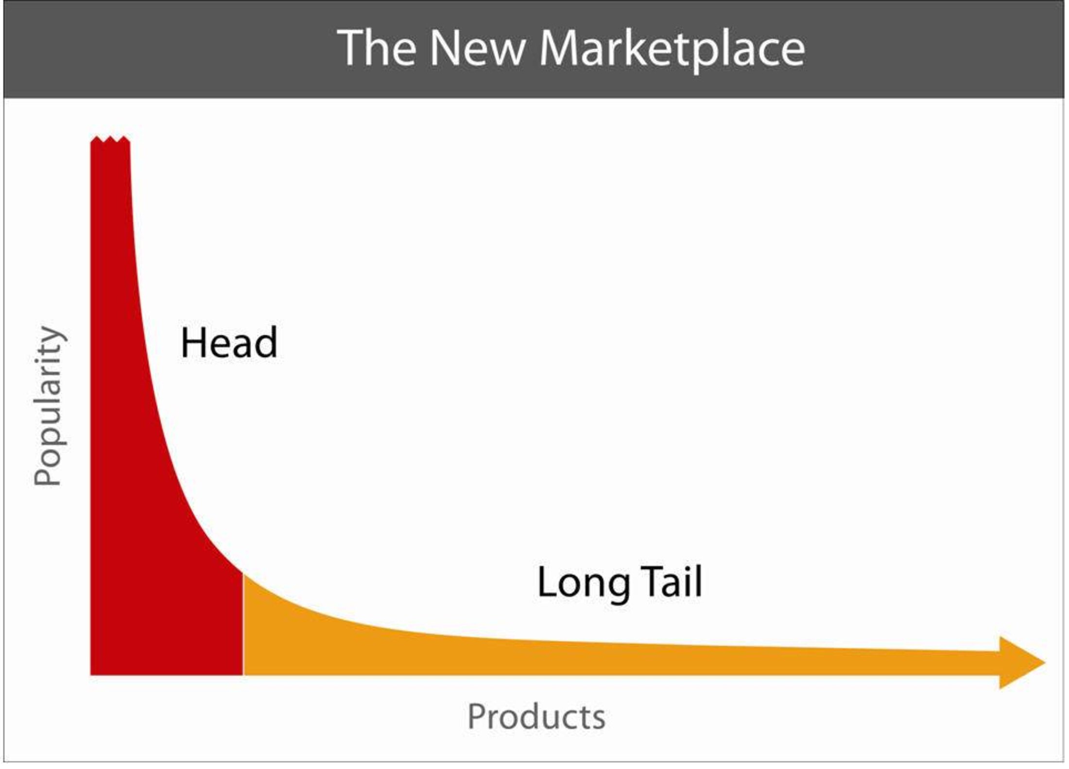 La longue traîne (en jaune), au contraire, demande une relation plus complexe, une construction du public:
