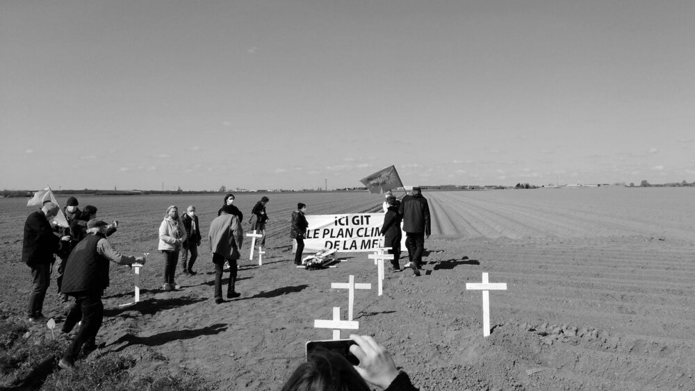 Plus de 250 personnes pour l’enterrement du plan climat de la métropole lilloise à l’appel du collectif d’opposition local "Alerte à Marquillies" et de nombreuses organisations dont XR Lille. En soutenant un projet d’entrepôt logistique géant dans les Weppes, la MEL enterre d’elle-même ses ambitions climatiques...