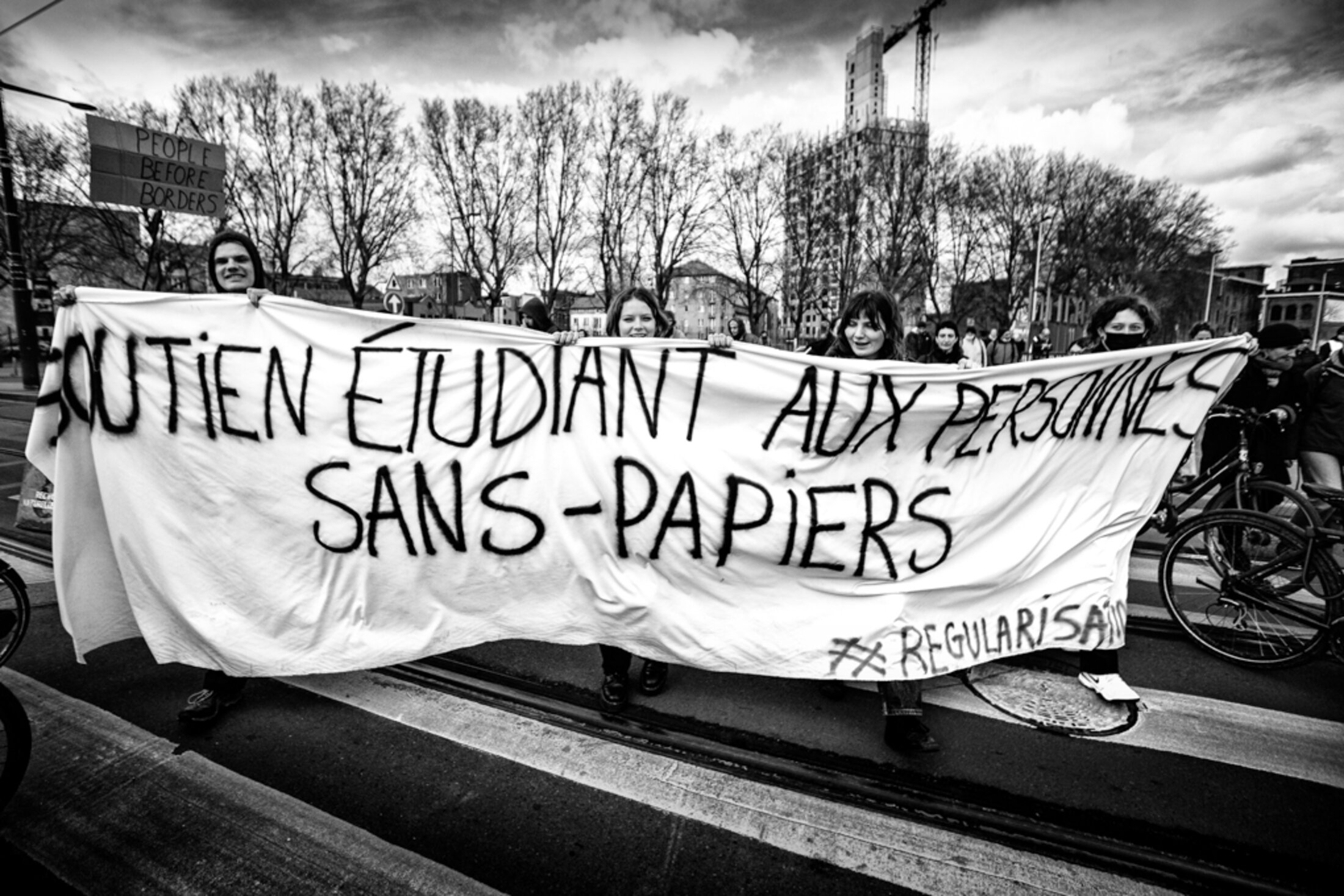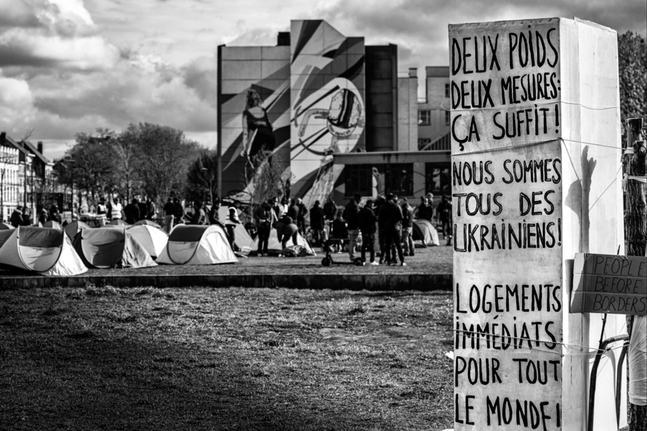 Vendredi 31 mars 2022 un campement des sans papiers et leurs soutiens c'est installer dans le Parc de la Porte de Ninove pour attirer l'attention des politiciens et de la population pour une régularisation avec des vrais critères et un changement de la politique migratoire injuste en Belgique et le droits au logements pour tous