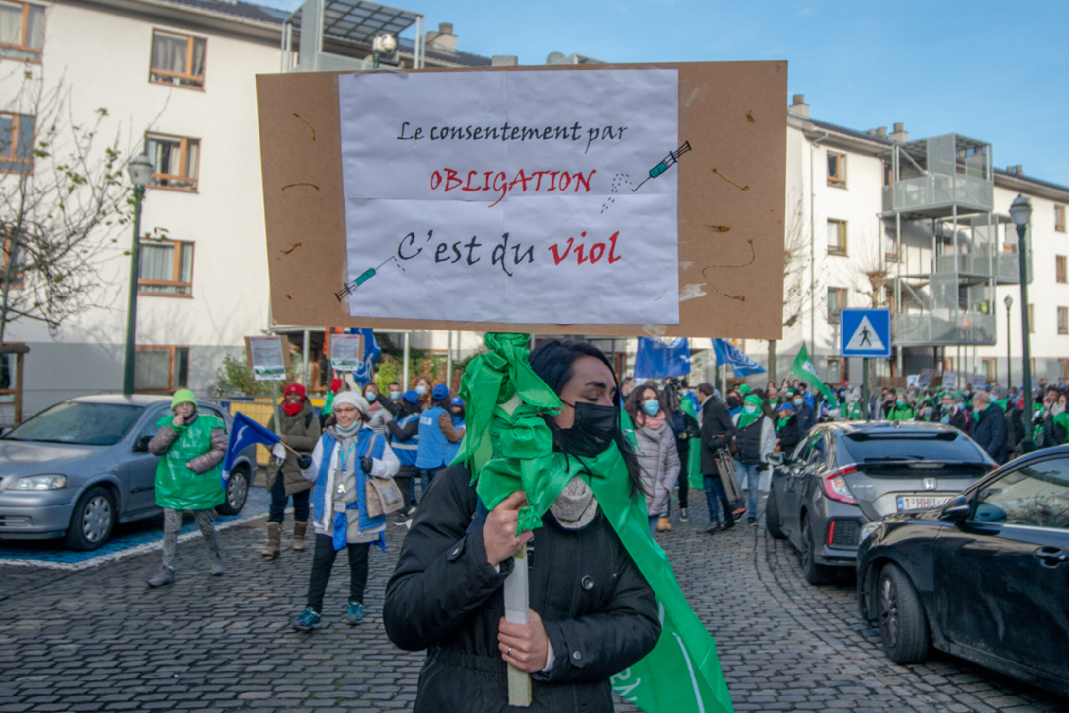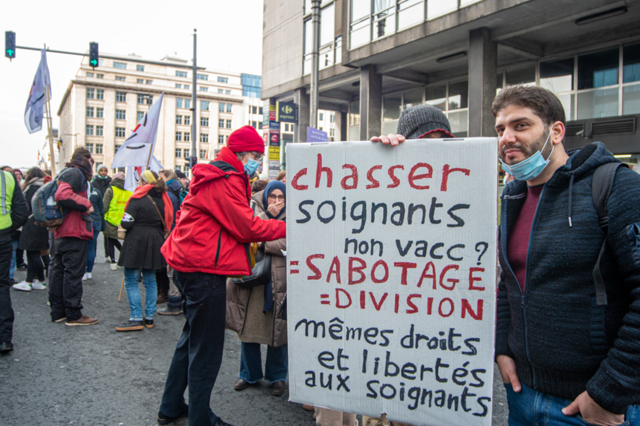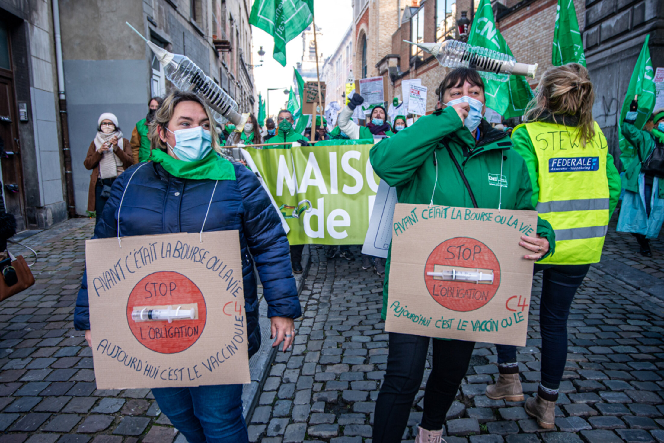 Le front commun par la CGSP, le Setca, la CNE, le SLPF et la CGSLB . Après les applaudissements, les licenciements. le texte de loi prévoit qu’entre le 1er janvier et le 31 mars, pour une période de transition, ceux qui ne se font pas vacciner ne peuvent plus travailler. Après les applaudissements les licenciements