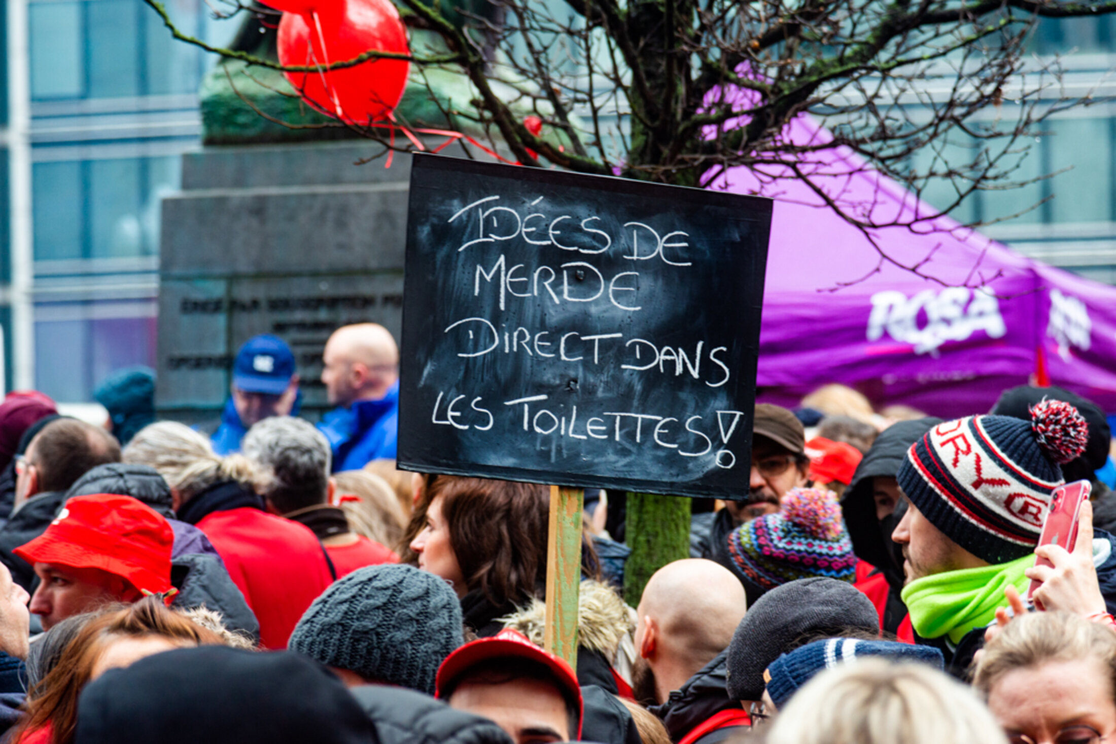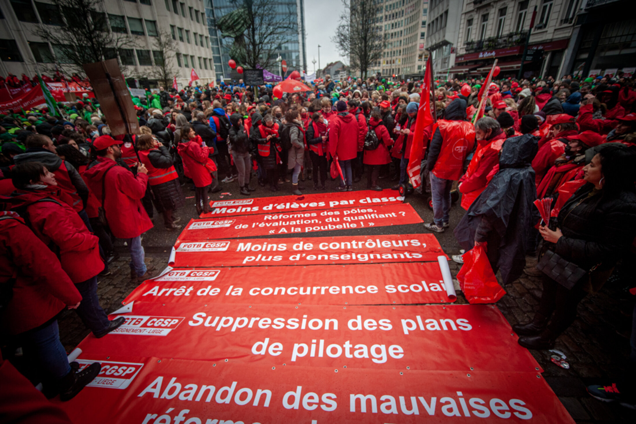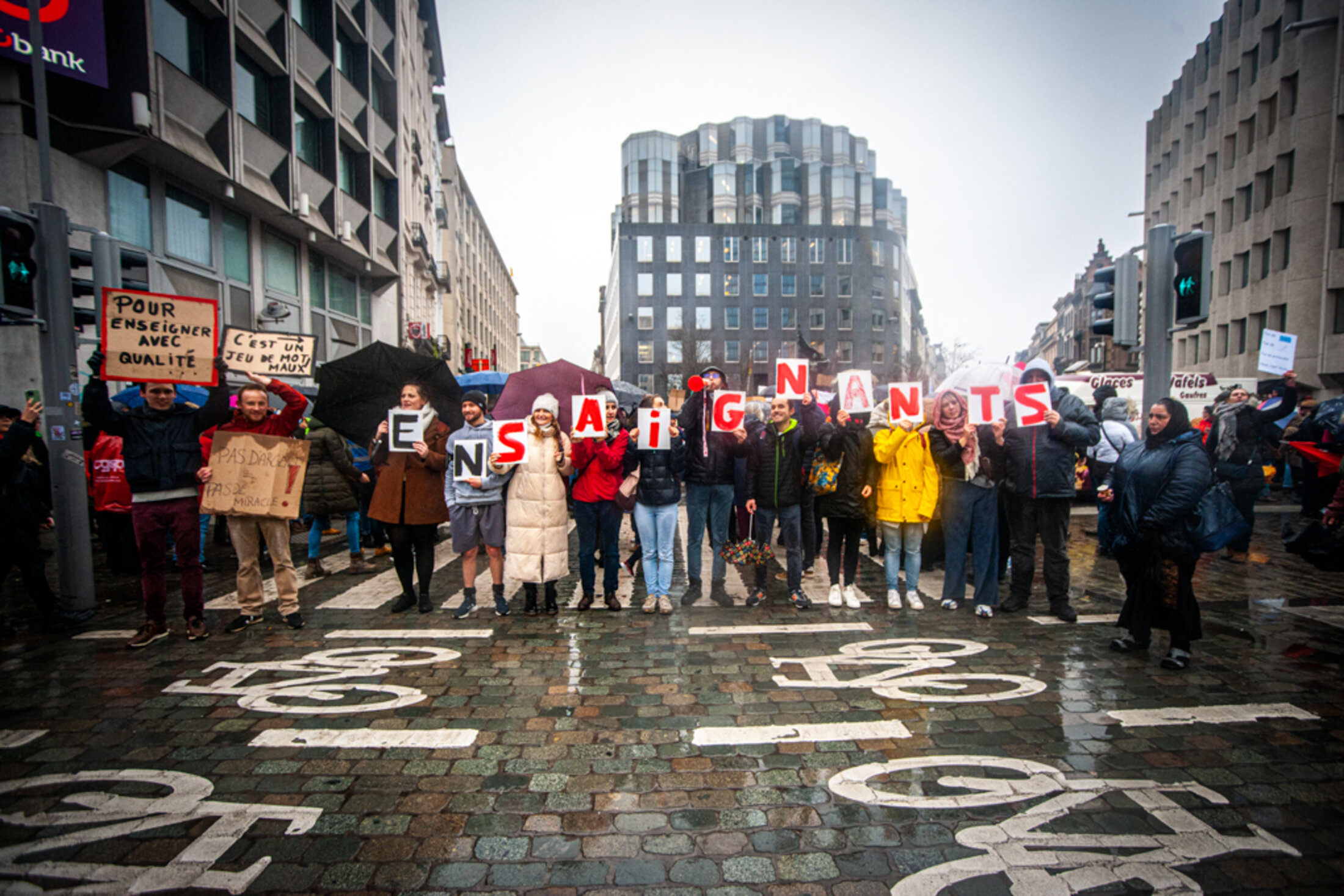 10.000 travailleus-euses de l'enseignement manifestent à Bruxelles .et font tremblée la place Surlet de Chokier siège du gouvernement de la Fédération Wallonie-Bruxelles ras-le-bol des profs au bord de la crise de nerfs.