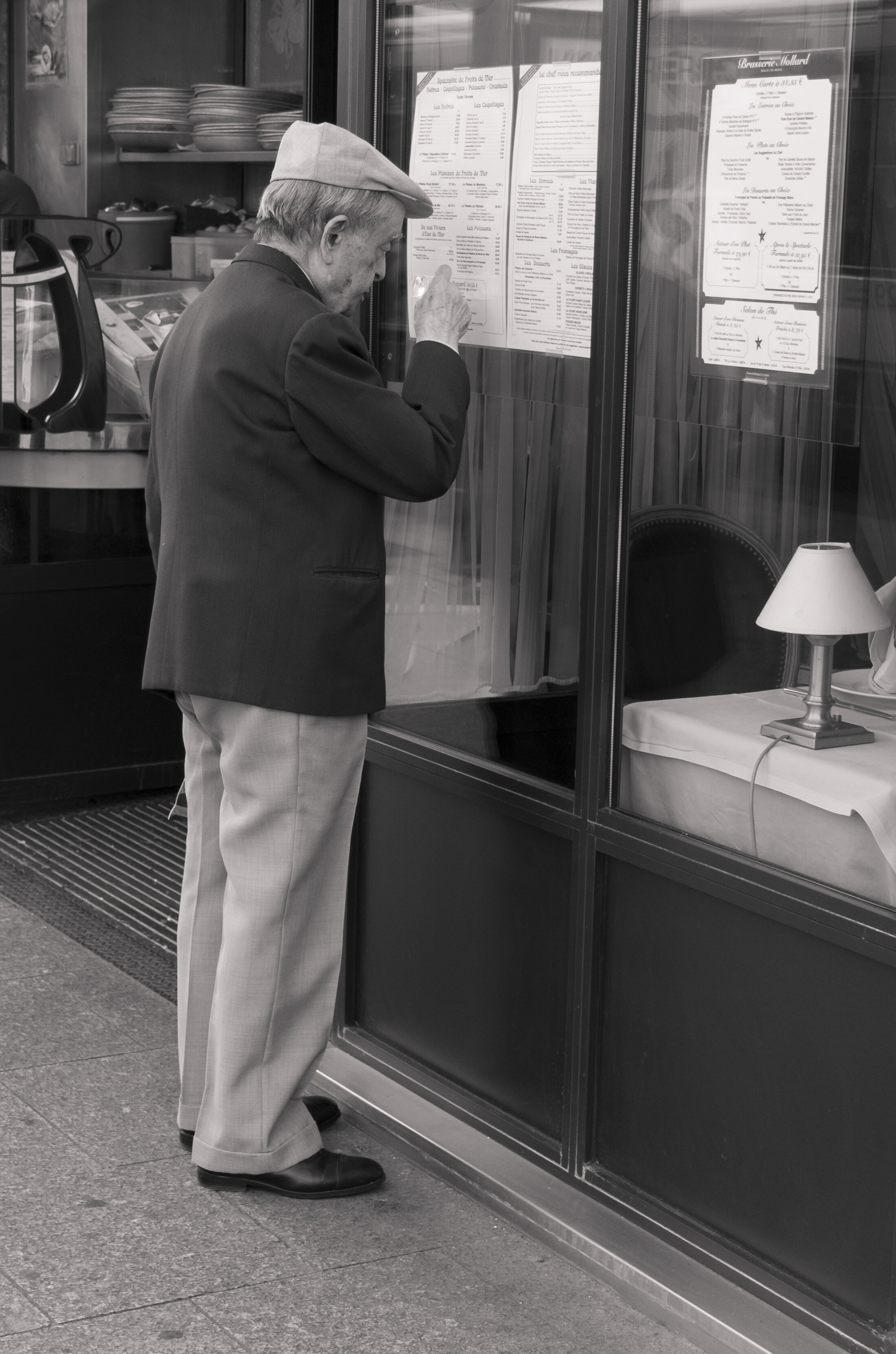 Un homme, une carte de restaurant, une loupe. Et le pli du pantalon, impeccable. Paris regorge encore de ces silhouettes semblant sortir d'une vieille bobine.