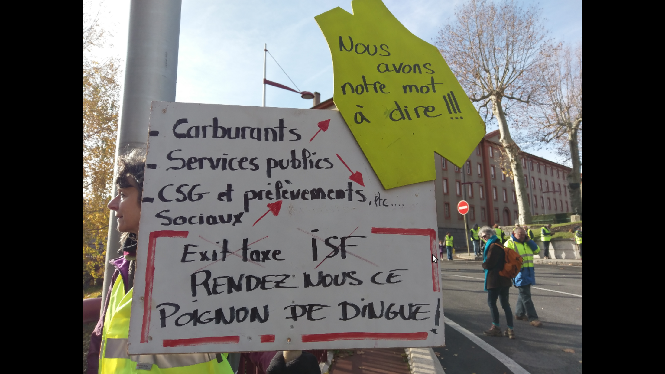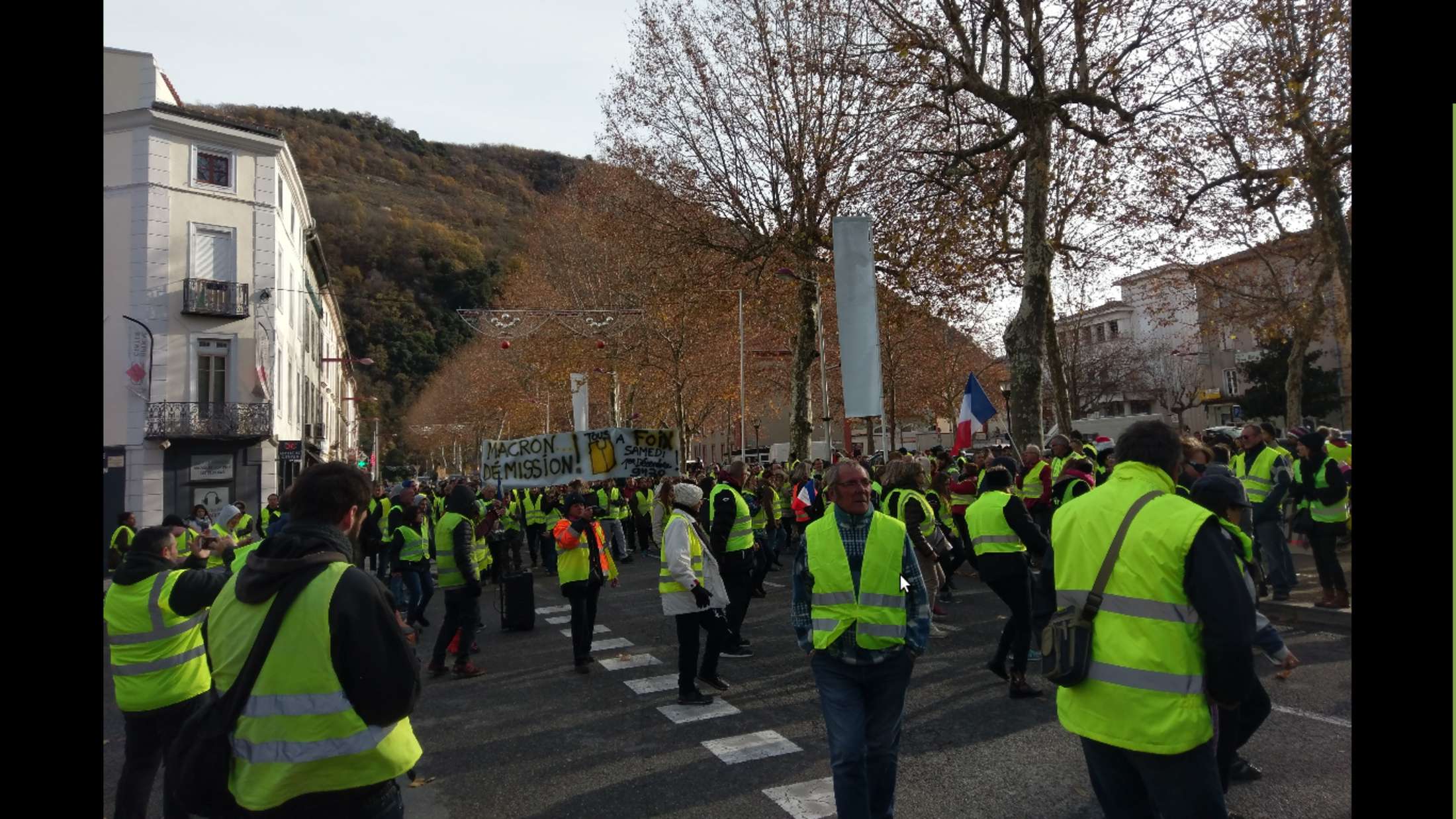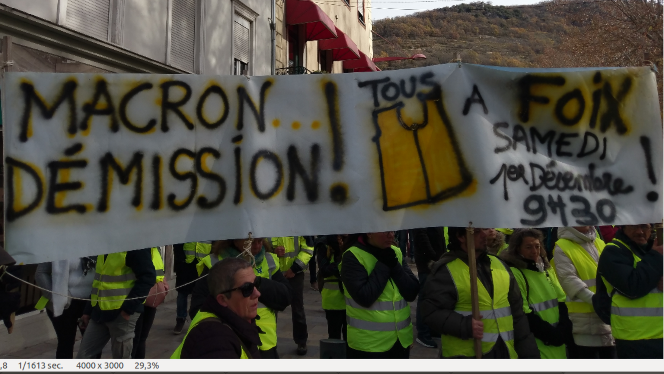 Ce samedi 1er décembre, les "Gilets jaunes" ariégeois appelaient à manifester à Foix, Ariège, Occitanie. Sur les banderolles, pancartes et gilets jaunes on pouvait lire : "Macron démission", "Rendez-nous ce pognon de dingue", "Macron on est pas des moutons", "Dissolution de l'assemblée nationale", "Solidarité, Liberté, Égalité, Fraternité, "Macron dégage ! Fini la monarchie !".