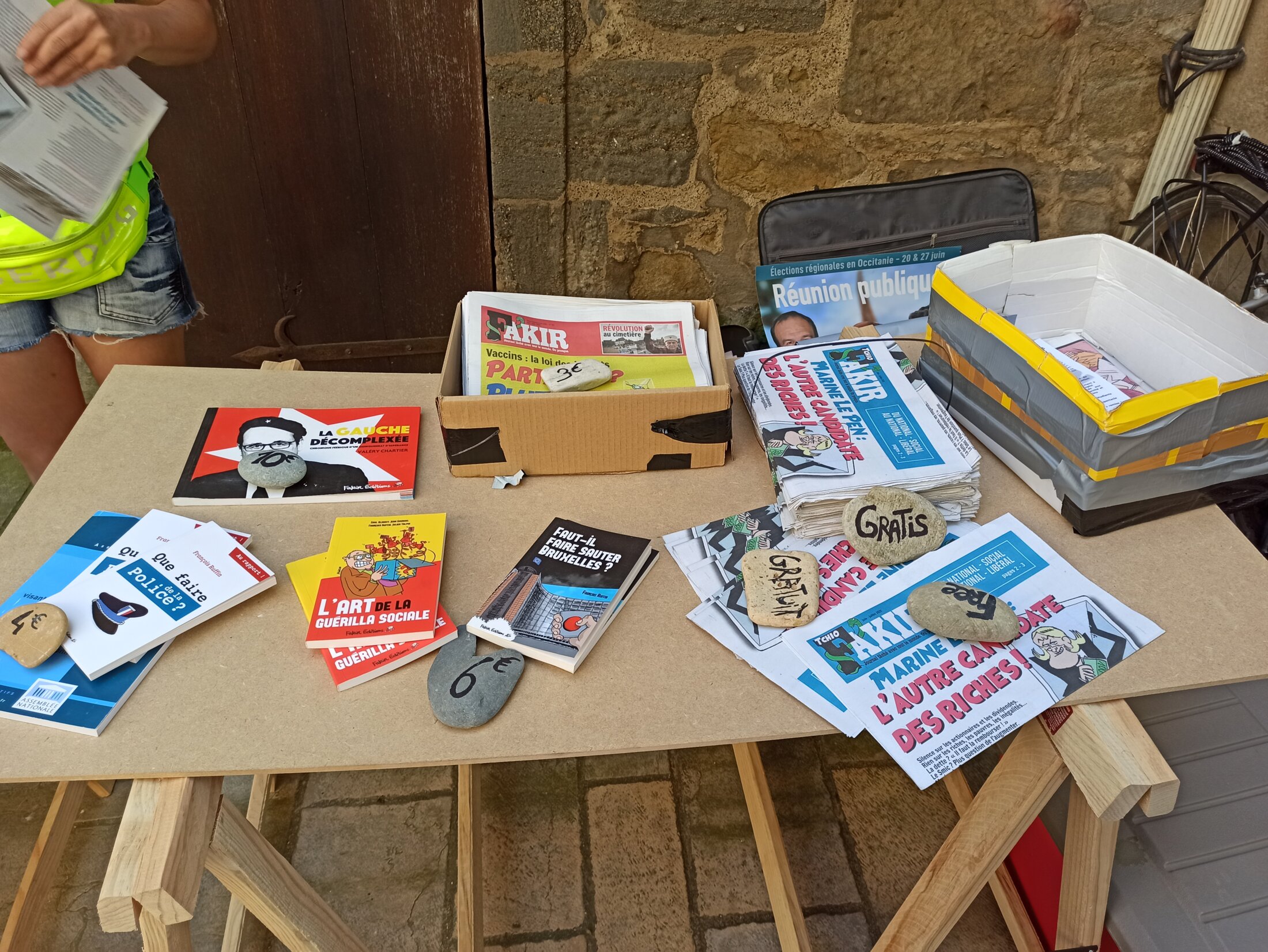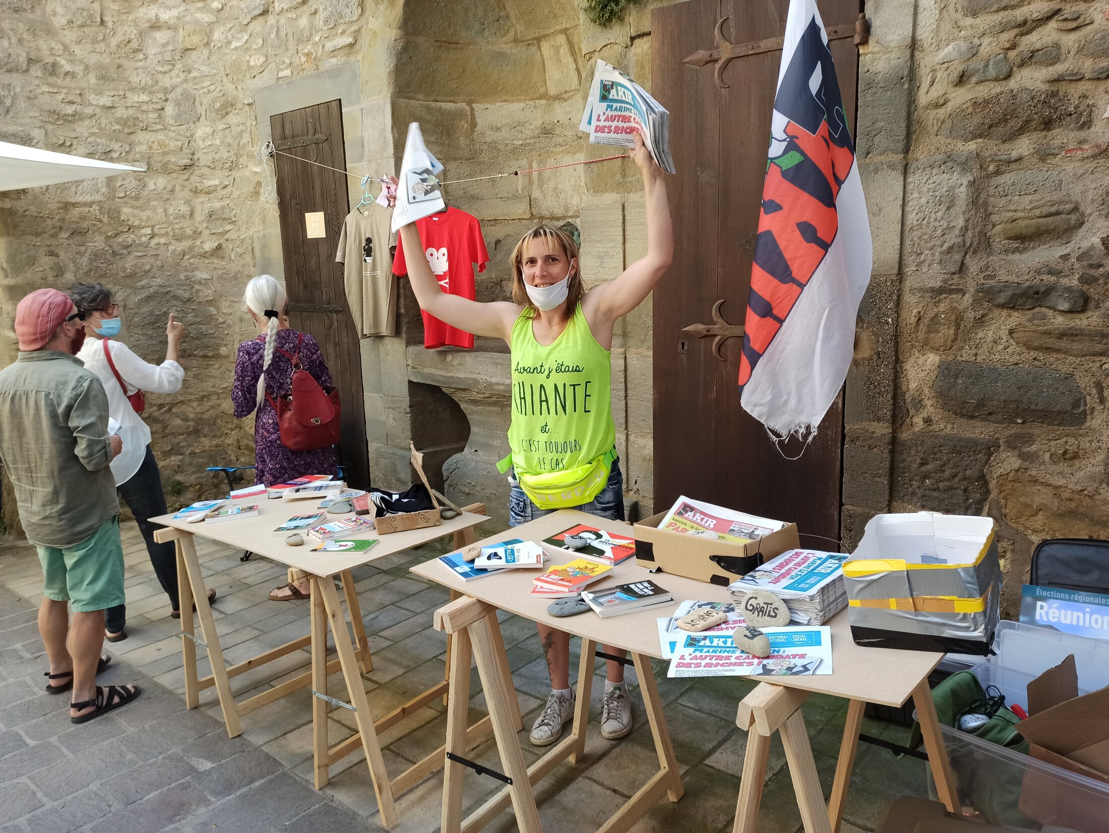 Avec les prochaines élections régionales et départementale du 20 et 27 juin prochains, candidat.e.s et militant.e.s étaient présent.e.s ce matin, jour de marché à Carcassonne avec notamment Europe Écologie-Les Verts et la liste l'Occitanie naturellement ainsi que la France Insoumise et la liste Occitanie populaire. Ici, un stand avec le numéro spécial du journal Fakir : "Marine le Pen, l'autre candidate des riches !"