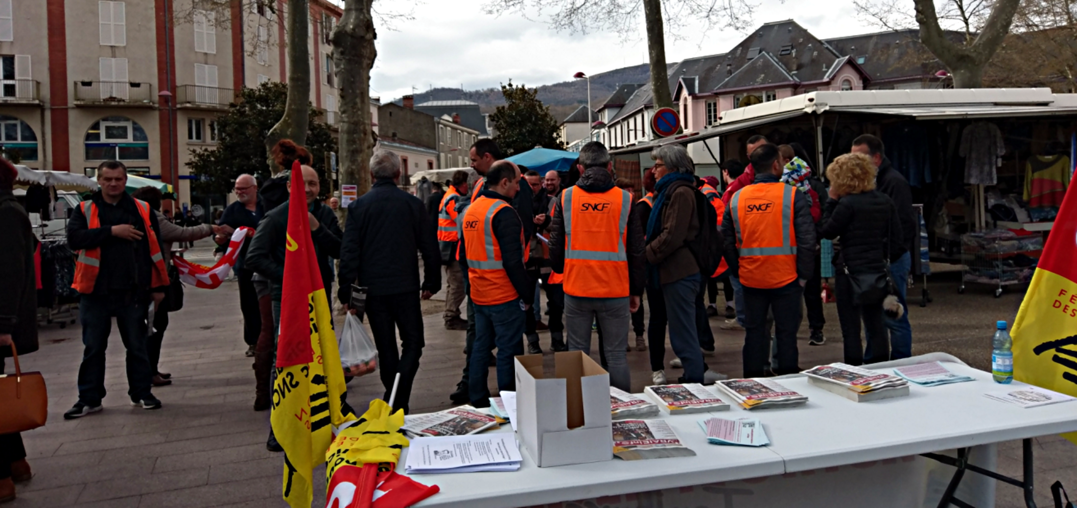 Cheminot-e-s sur le marché de Foix. Lire Marche ou Grève : des cheminots ariégeois en route pour Paris !