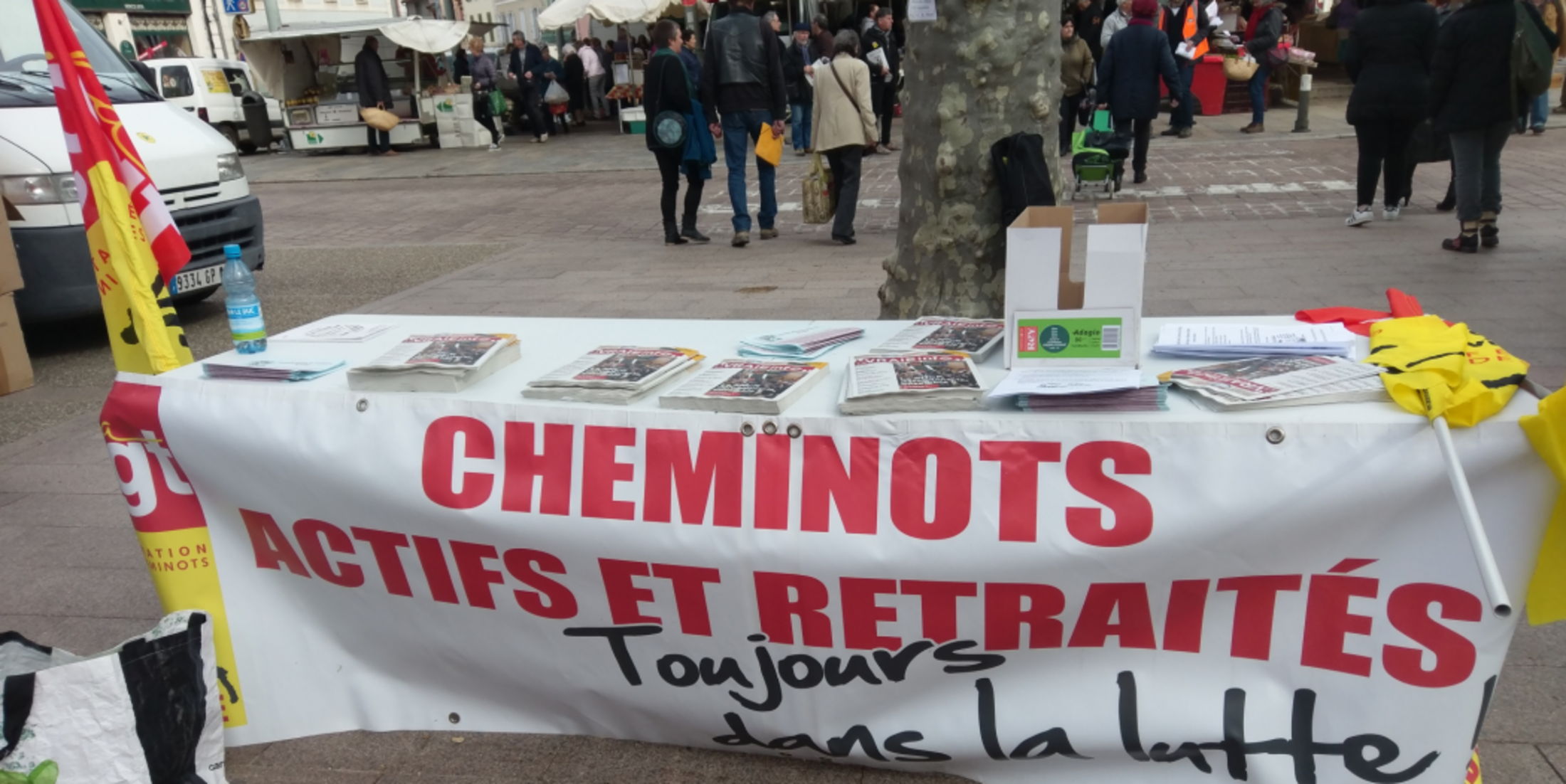 Lundi dernier, les cheminot-e-s avaient décidé lors de leur Assemblée Générale à Pamiers de venir au marché de Foix à la rencontre du public. Plusieurs dizaines d'agent-e-s de la SNCF étaient donc venue-e-s ce vendredi matin 13 avril sur les Allées de Villote à l'appel des syndicats CGT Cheminots et Sud Rail.