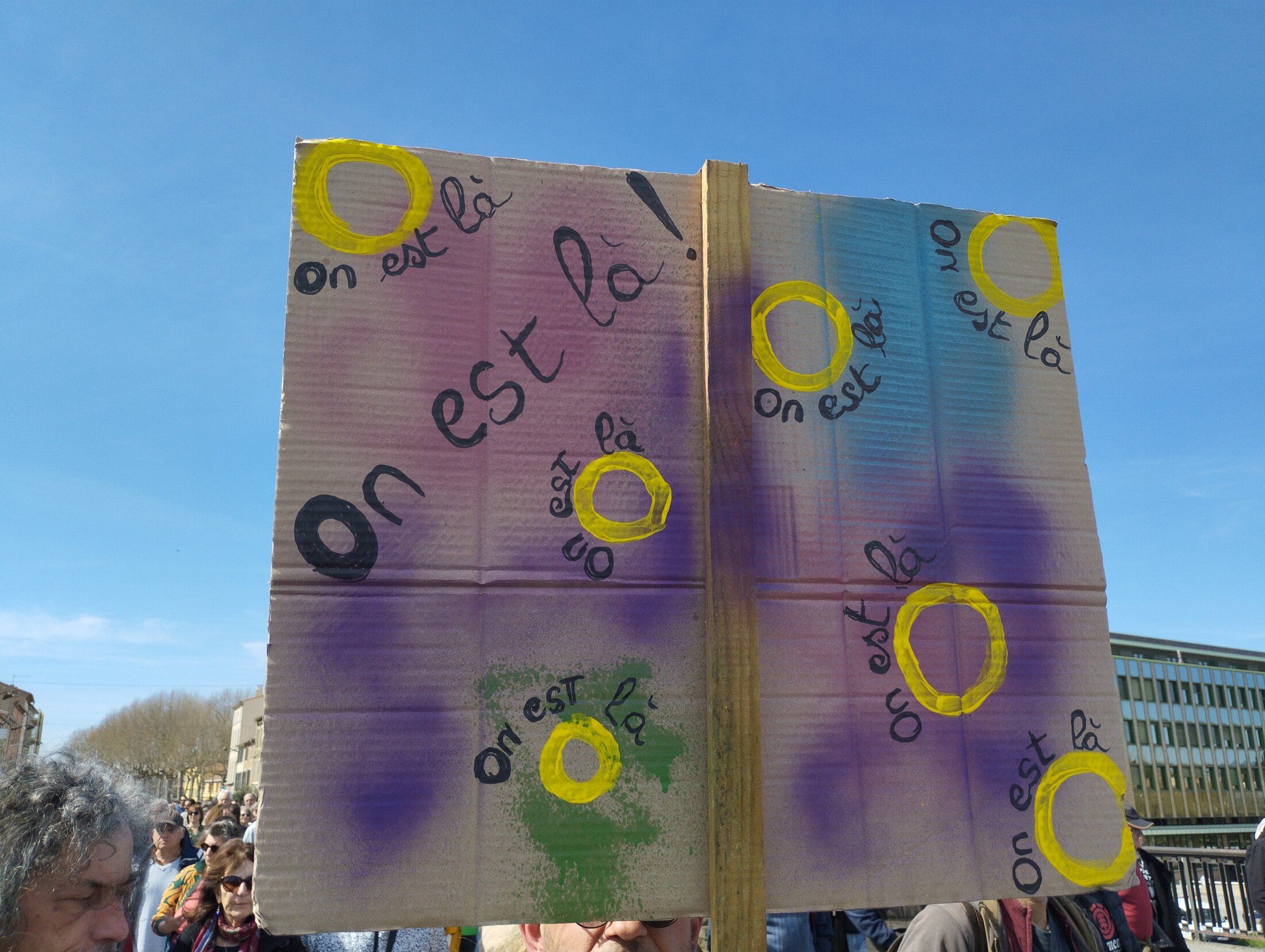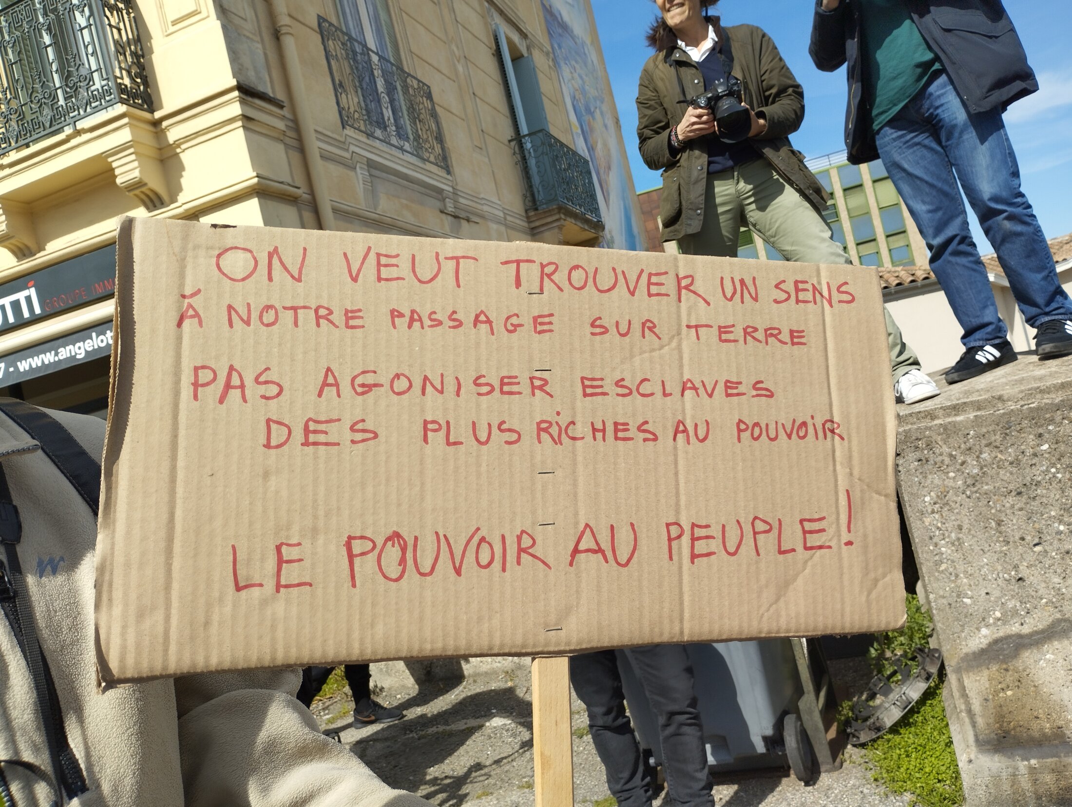 On est là ! On est là ! Même si Macron le veut pas, nous on est là ! Pour l’honneur des travailleurs et pour un monde meilleur, même si Macron le veut pas, nous on est là !