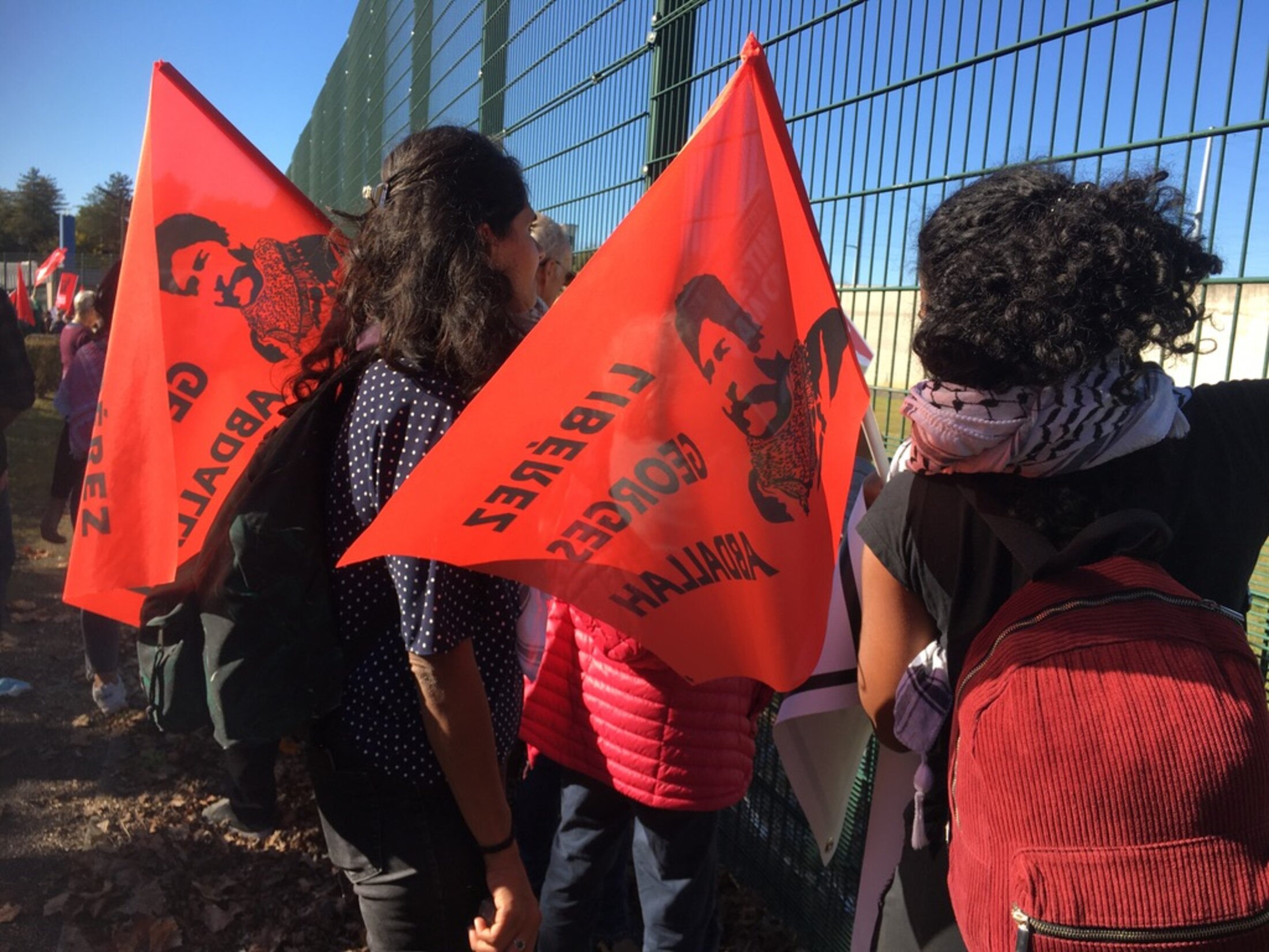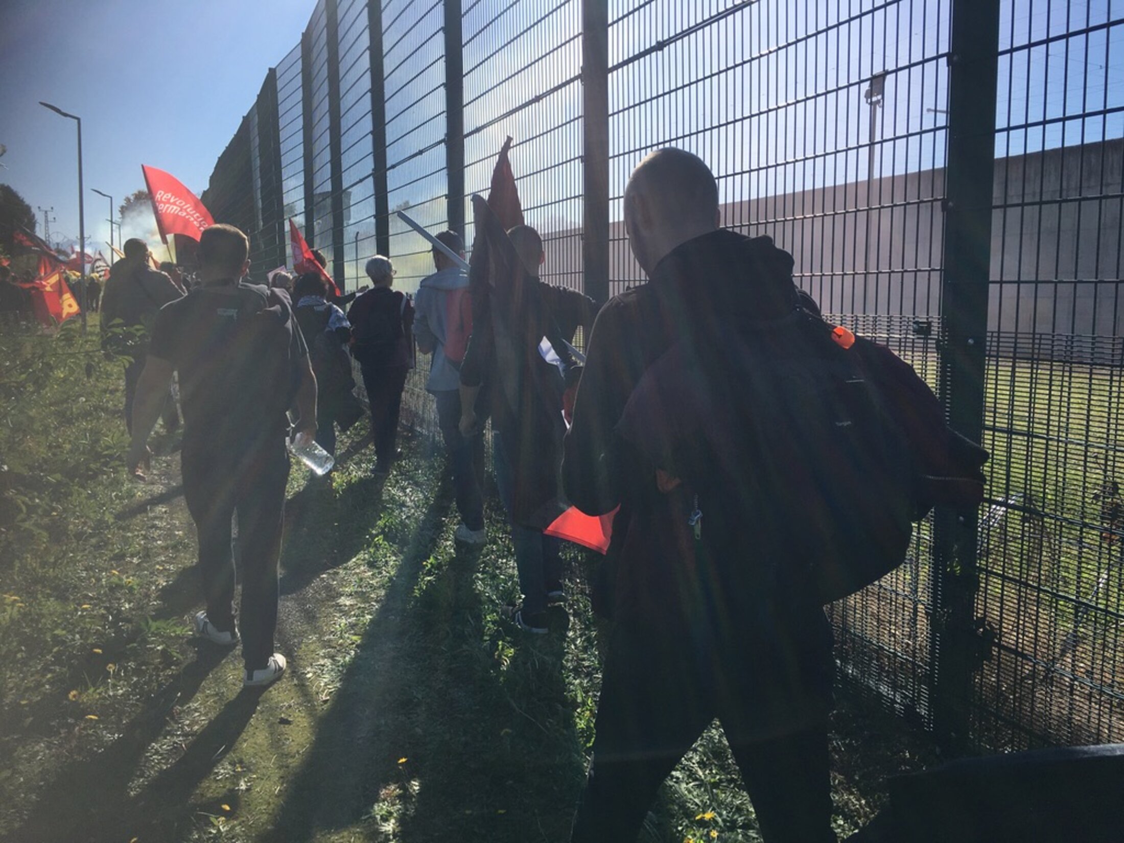 Et à l'entrée même de la prison, les banderoles s'affichent et le drapeau est hissé tout en haut des grilles. Des fumigènes colorent le ciel.