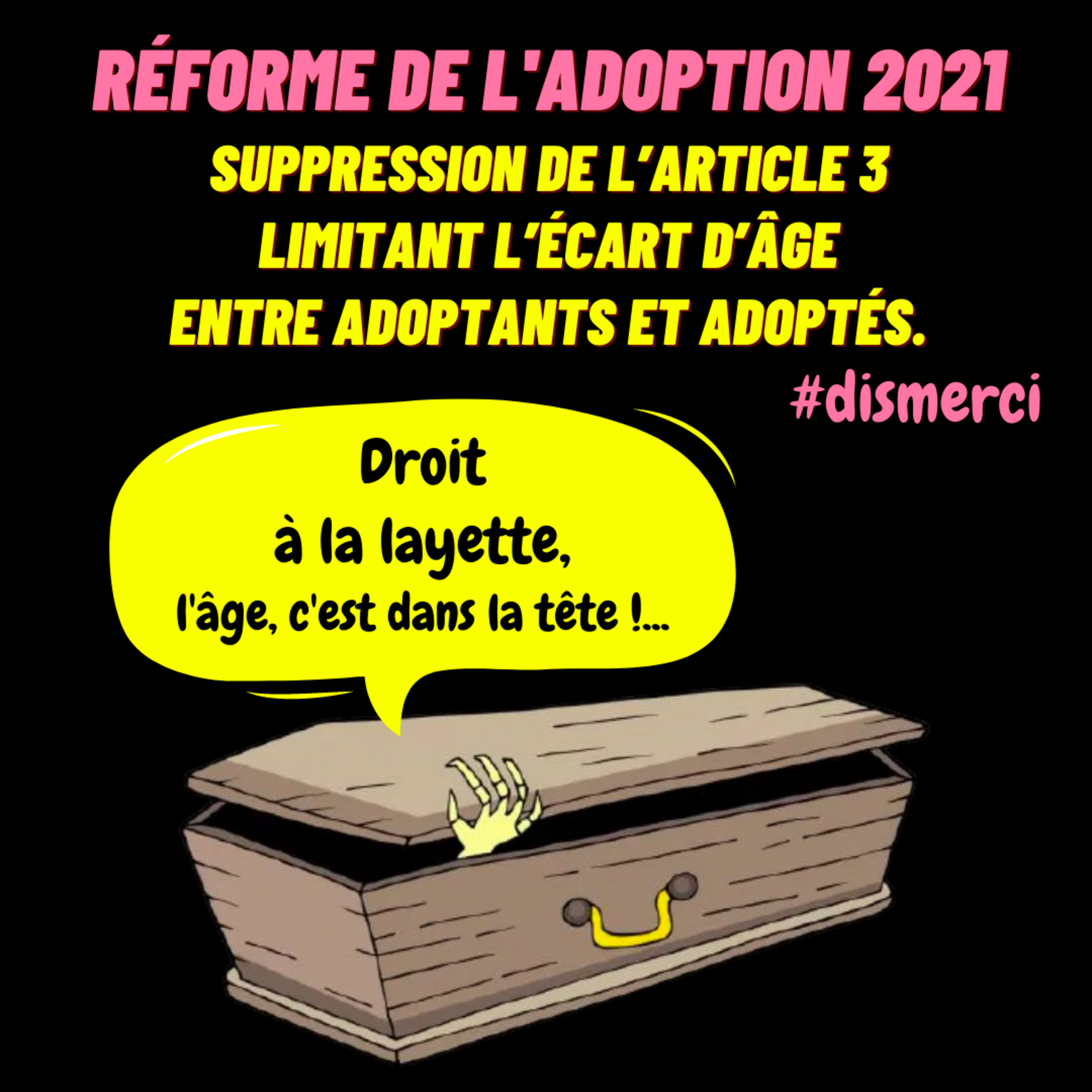 Dans le nouveau projet de réforme de l'adoption (loi n°3161), l'article en référence à l'écart d'âge maximal entre parents adoptifs et enfants adoptés a été supprimé.