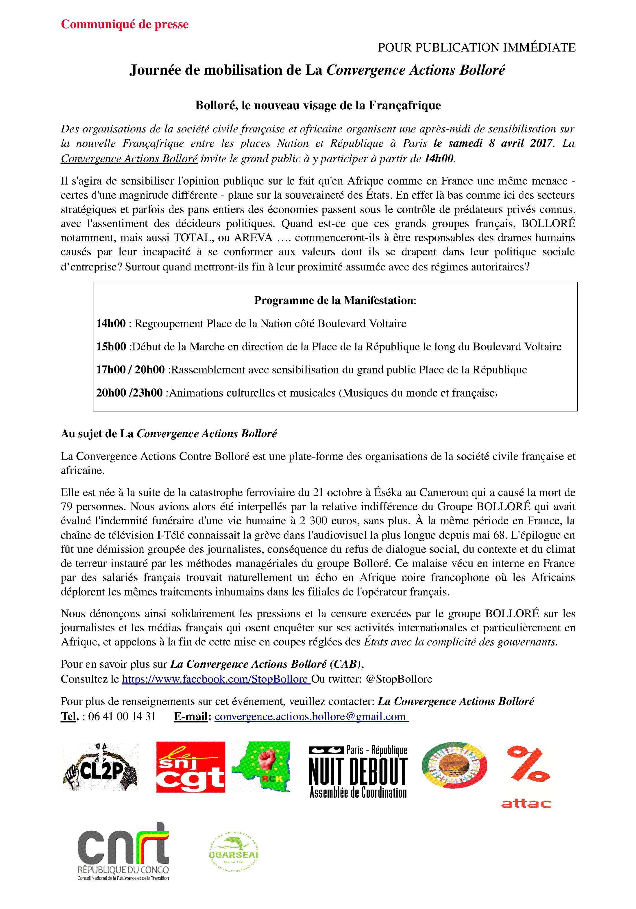 Des organisations de la société civile française et africaine organisent une après-midi de sensibilisation sur la nouvelle Françafrique entre les places Nation et République à Parisle samedi 8 avril 2017. La Convergence Actions Bolloré invite le grand publicà y participer à partir de 14h00.