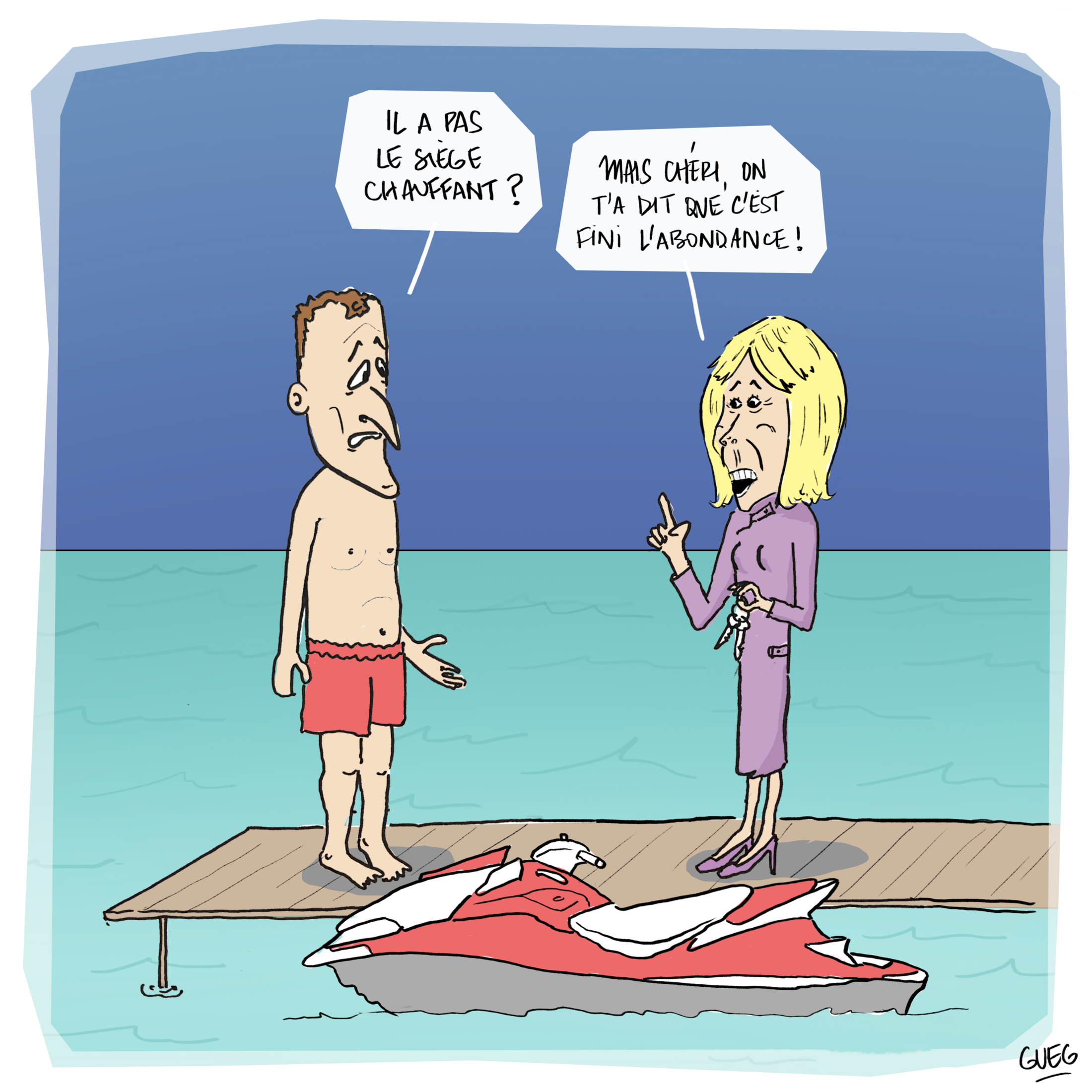 Fin de l'abondance : chacun fait ce qu'il peut ! Fidèle à son engagement de "moraliser la vie publique", notre président s'inflige des mesures de sobriété draconienne. En effet, il a renoncé au siège chauffant sur son jet-ski. Bravo à lui pour ce beau geste qui nous remet dans les clous de Paris.