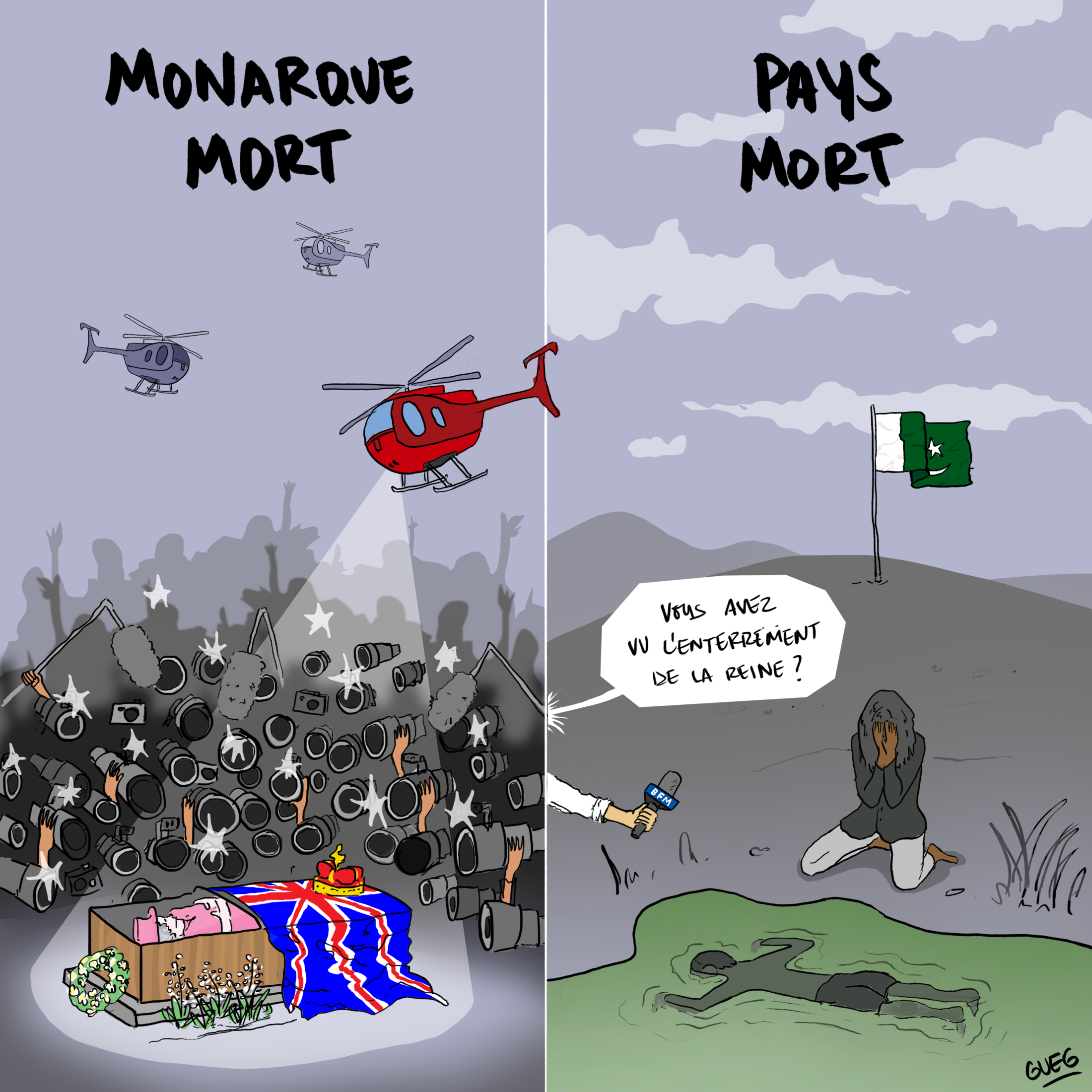 La reine d'Angleterre est morte il y a 12 jours. Paix à son âme. Pendant que les médias occidentaux scrutaient les moindres faits et gestes de la famille royale Britannique, des inondations historiques ont ravagé le Pakistan. Au moins 1500 personnes en sont mortes, et 33 millions ont été déplacés. Nous portons tous une responsabilité dans cette tragédie, causée entre autres par notre addiction aux énergies fossiles.