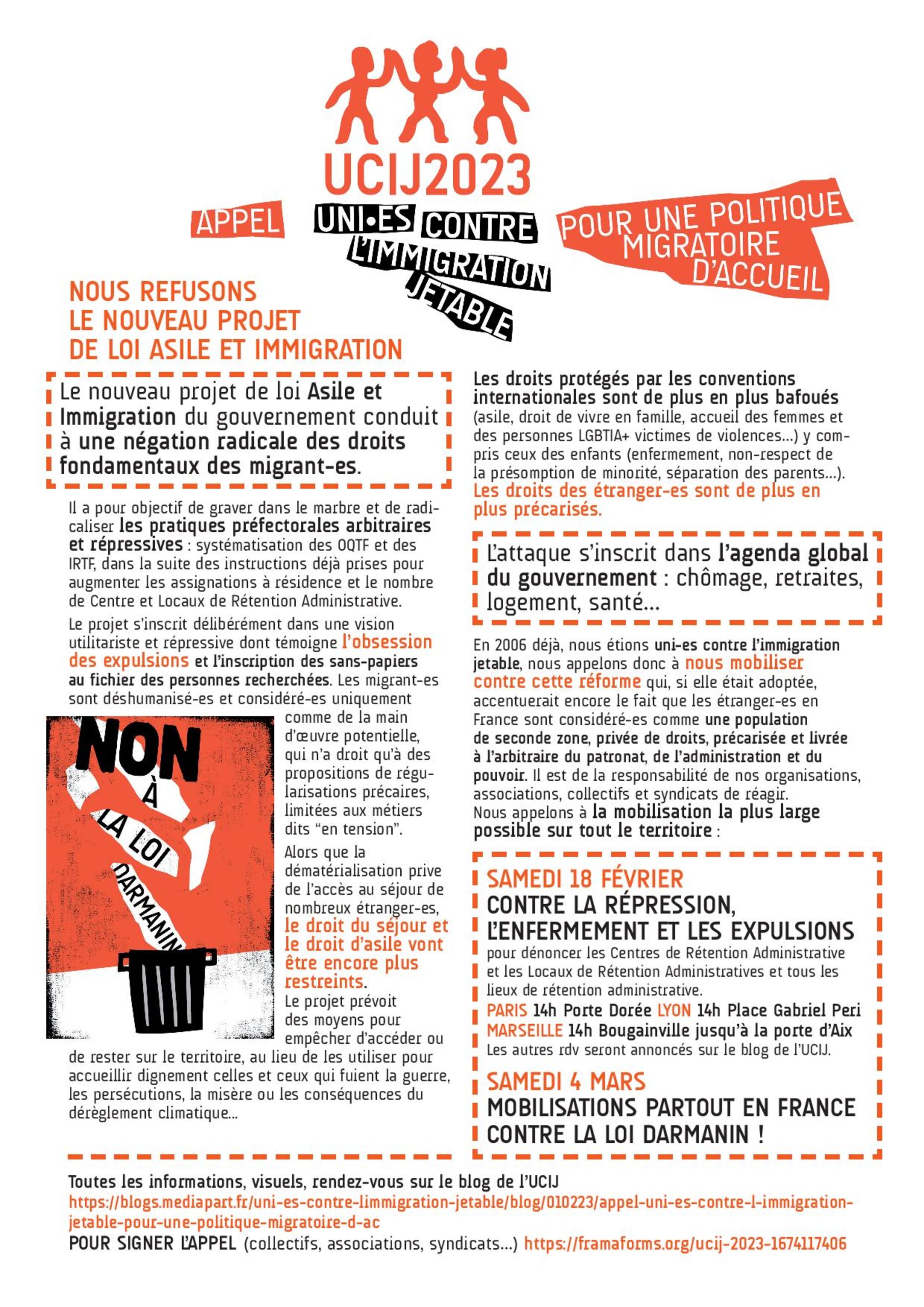 Tract et visuels : appel, logo, affiches pour les manifestations du samedi 18 février et du samedi 4 mars N'hésitez pas à utiliser ces ressources pour faire connaître et relayer les actions de la campagne UCIJ 2023 sur les réseaux sociaux