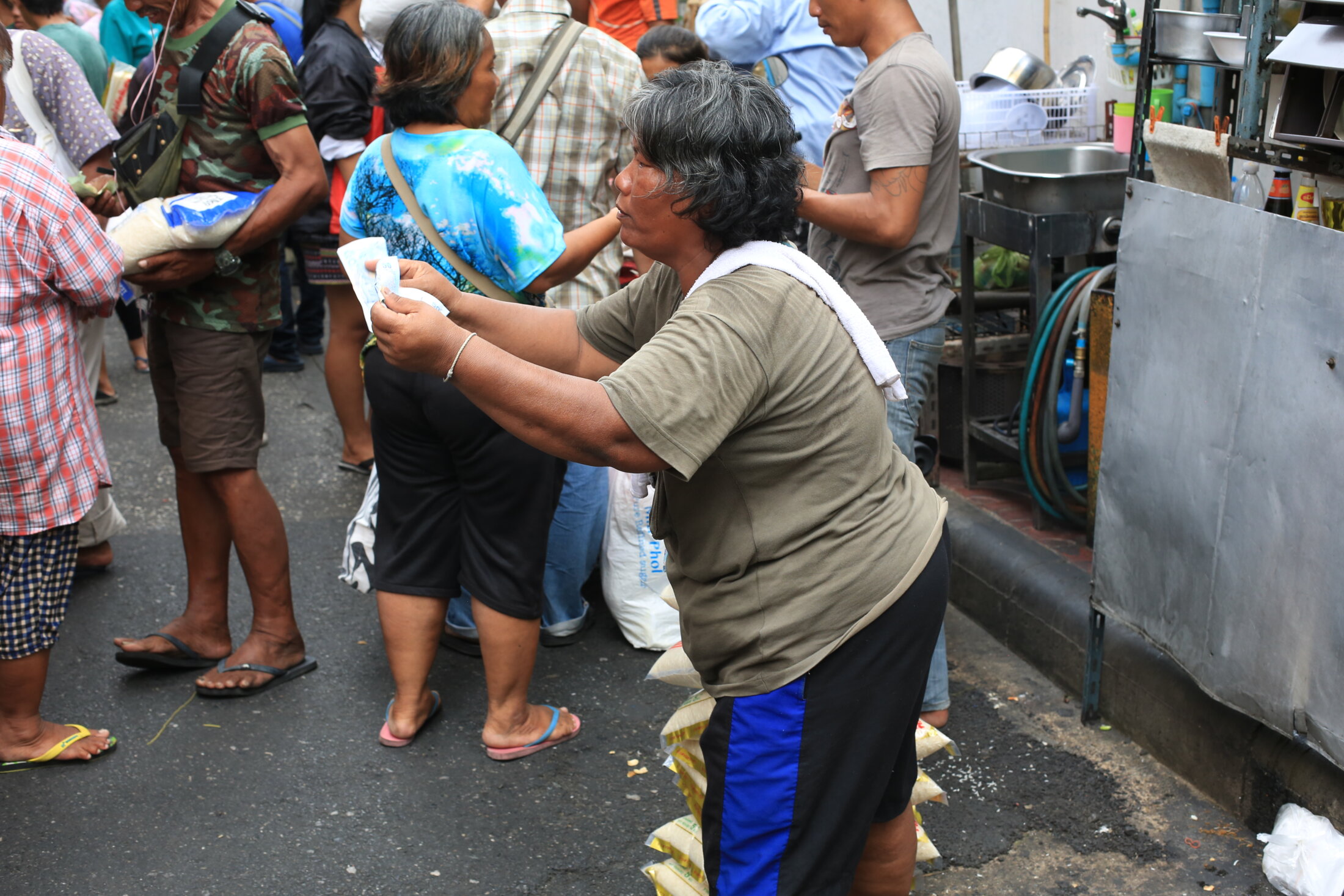 Octobre 2019, Bangkok - Thaïlande. Jour de distribution dans une pagode de Talad Noi, gérée par les membres plutôt fortunés d'une association sino-thai.