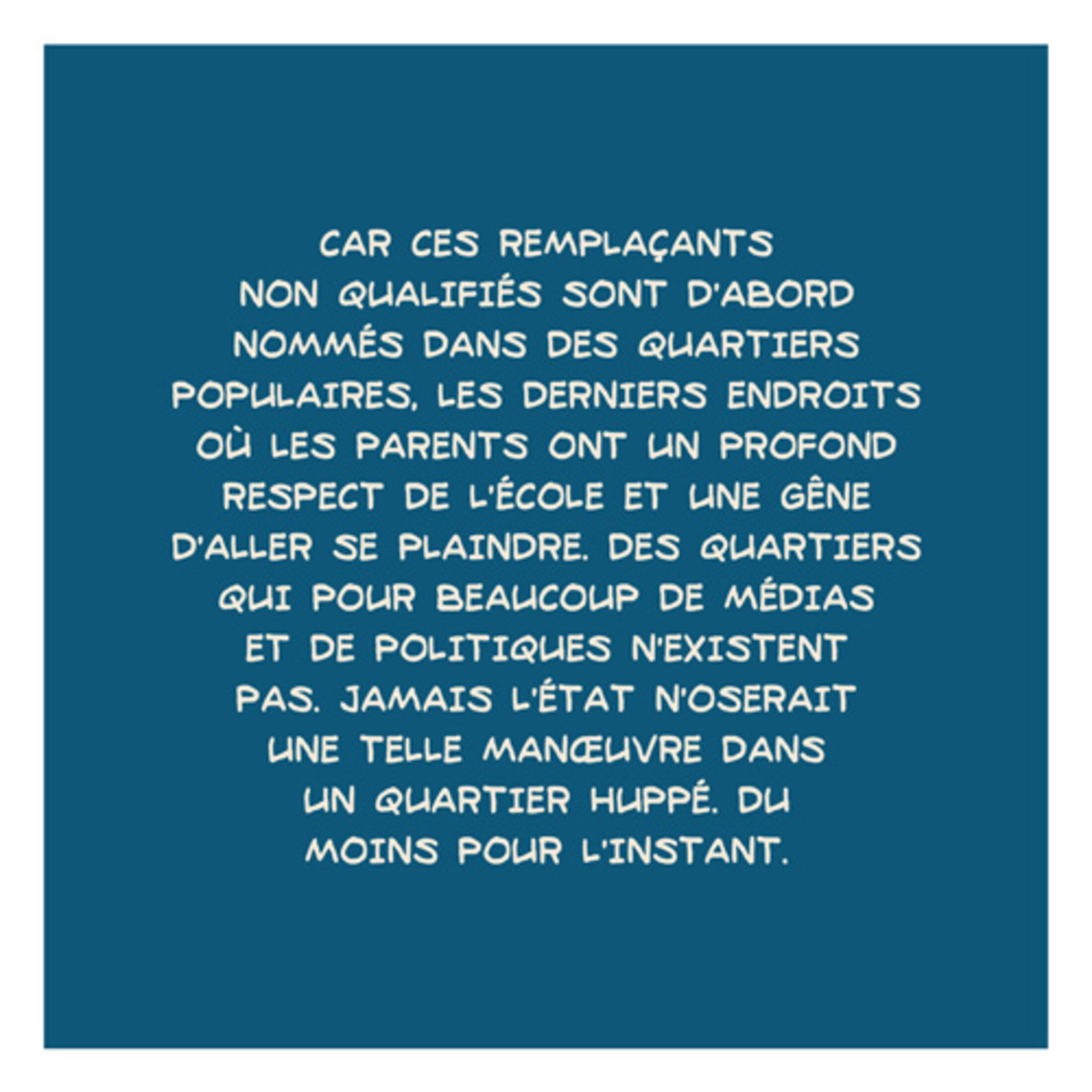 On dépeint le manque d’enseignants comme situation nouvelle. Mais, ce qui est nouveau, c’est le fait que ce manque s’est nationalisé et touche tout le monde. Beaucoup d’enfants ont déjà subi le travail de sape de l’Éducation nationale engagé il y a de nombreuses années, parmi lesquels Samba, abandonné par un état qui assume de plus en plus de laisser les pauvres sur le bord du chemin.