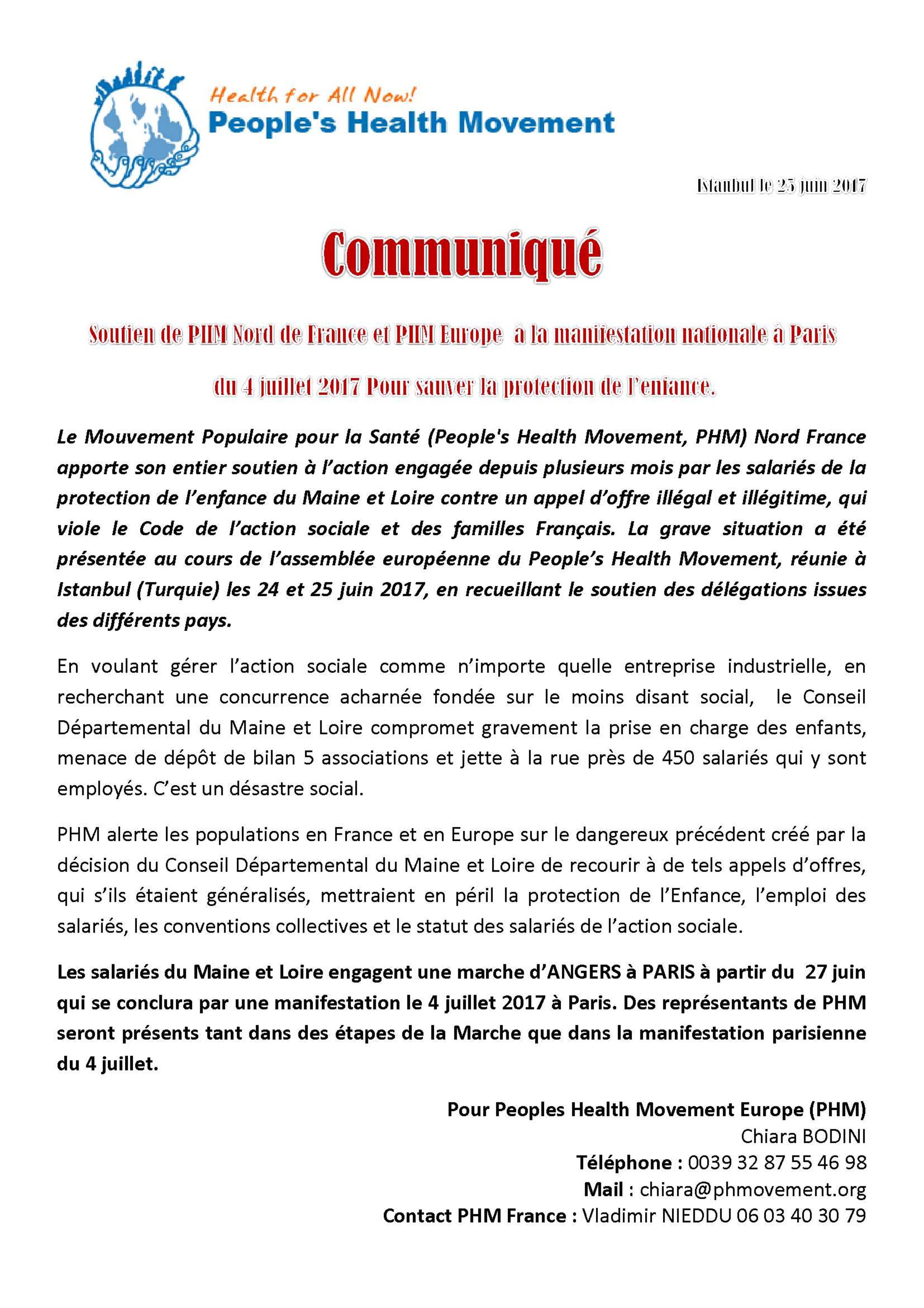 Le Mouvement Populaire pour la Santé (People's Health Movement, PHM) Nord France apporte son entier soutien à l’action engagée depuis plusieurs mois par les salariés de la protection de l’enfance du Maine et Loire contre un appel d’offre illégal et illégitime, qui viole le Code de l’action sociale et des familles Français. La grave situation a été présentée au cours de l’assemblée européenne du People’s Health Movement, réunie à Istanbul (Turquie) les 24 et 25 juin 2017, en recueillant le soutien des délégations issues des différents pays.En voulant gérer l’action sociale comme n’importe quelle entreprise industrielle, en recherchant une concurrence acharnée fondée sur le moins disant social, le Conseil Départemental du Maine et Loire compromet gravement la prise en charge des enfants, menace de dépôt de bilan 5 associations et jette à la rue près de 450 salariés qui y sont employés. C’est un désastre social.PHM alerte les populations en France et en Europe sur le dangereux précédent créé par la décision du Conseil Départemental du Maine et Loire de recourir à de tels appels d’offres, qui s’ils étaient généralisés, mettraient en péril la protection de l’Enfance, l’emploi des salariés, les conventions collectives et le statut des salariés de l’action sociale.Les salariés du Maine et Loire engagent une marche d’ANGERS à PARIS à partir du 27 juin qui se conclura par une manifestation le 4 juillet 2017 à Paris. Des représentants de PHM seront présents tant dans des étapes de la Marche que dans la manifestation parisienne du 4 juillet.Pour Peoples Health Movement Europe (PHM)Chiara BODINITéléphone : 0039 32 87 55 46 98Mail : chiara@phmovement.orgContact PHM France : Vladimir NIEDDU 06 03 40 30 79