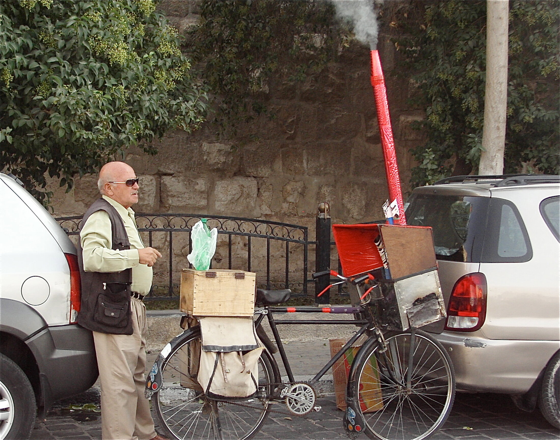 Grilleur de pistaches près de son vélo à vapeur! Près de la citadelle de Damas.