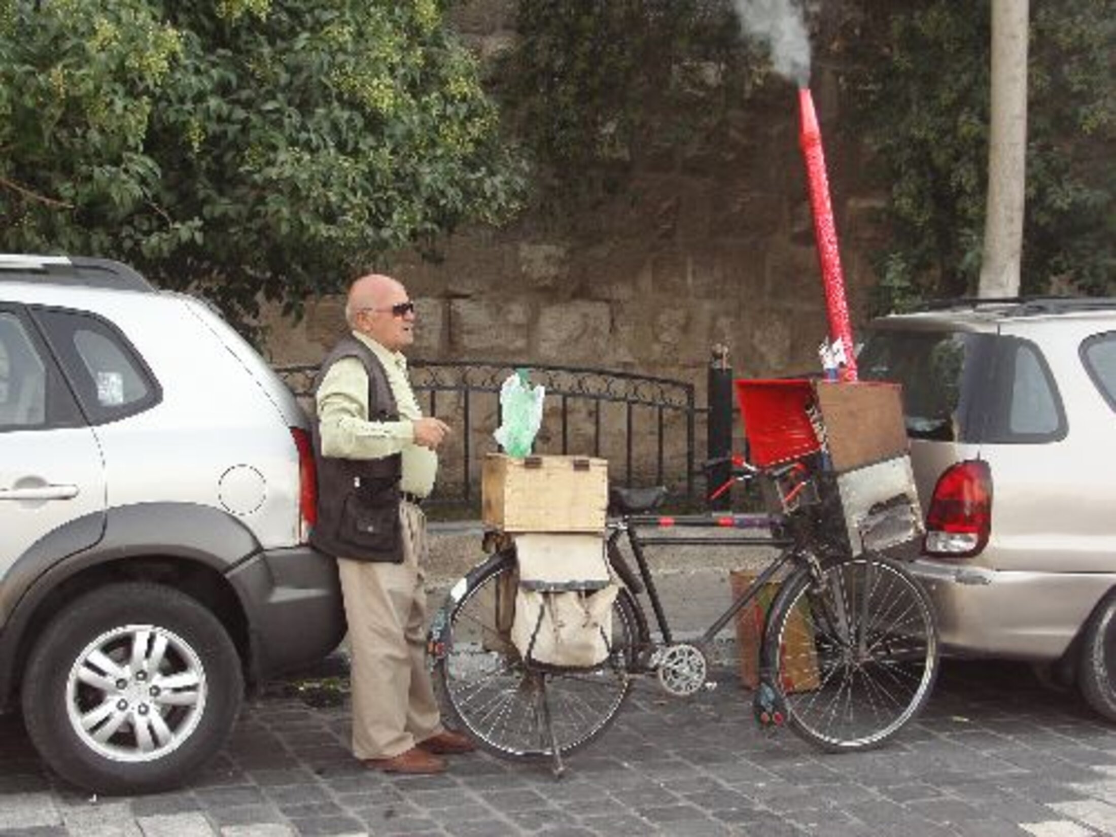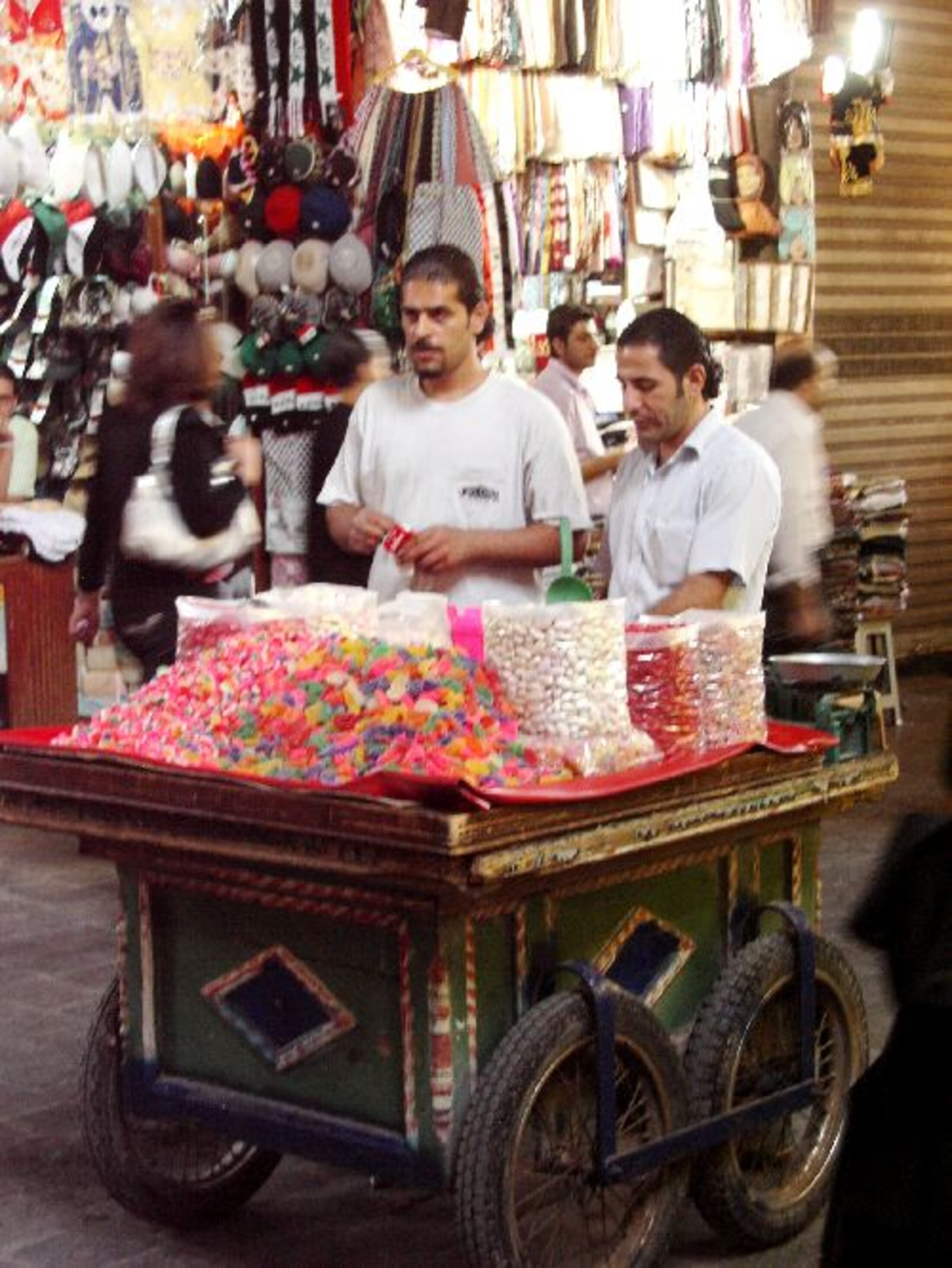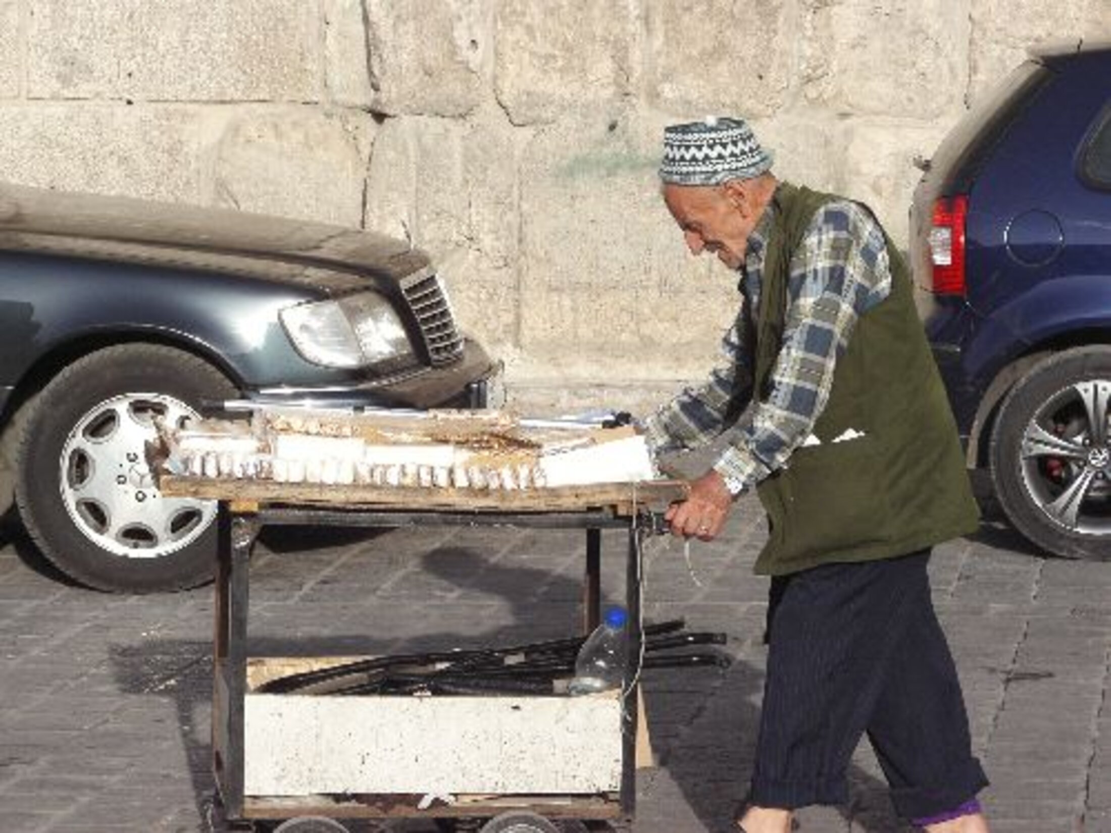 Petit vieux qui vent des nougats devant la mosquée des Omeyades à Damas.