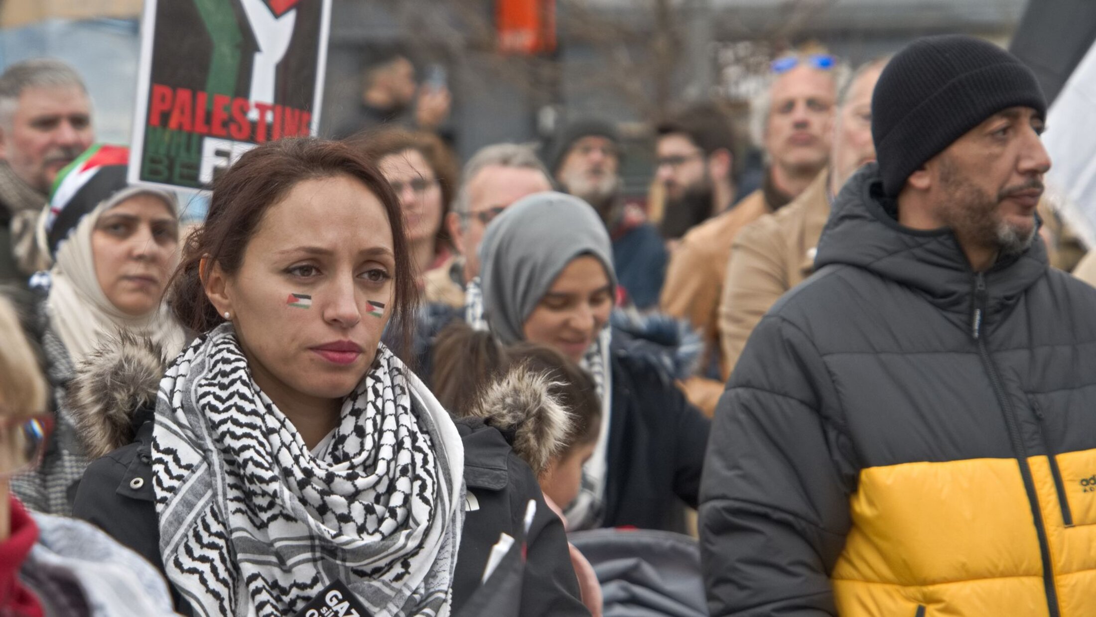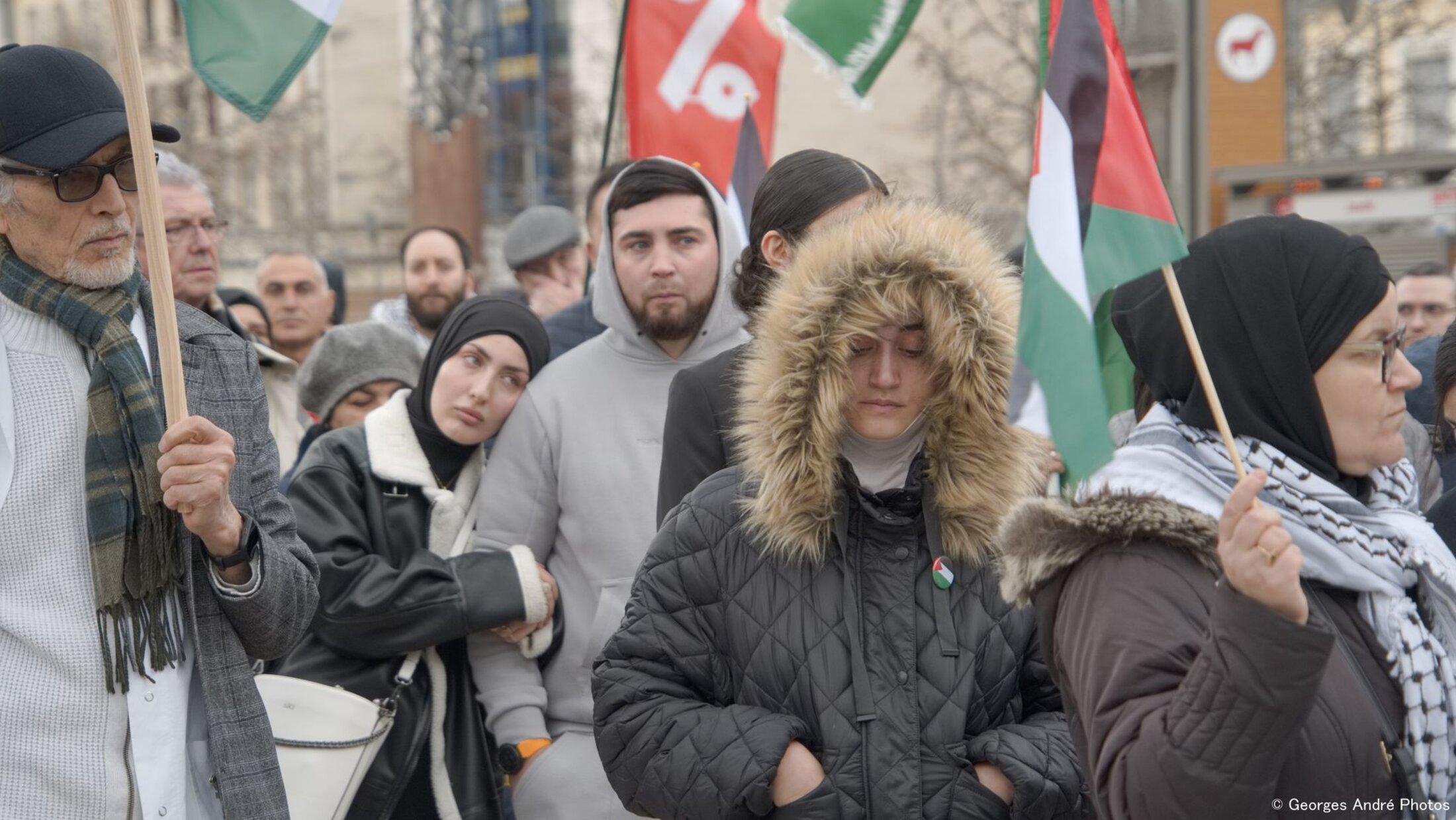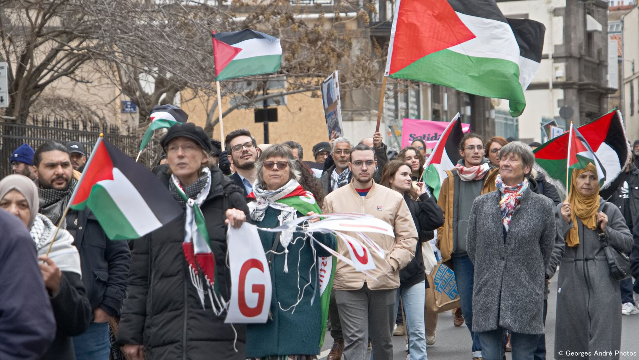 Beaucoup arborent drapeaux palestiniens et AFPS, tuniques BDS et Keffieh.