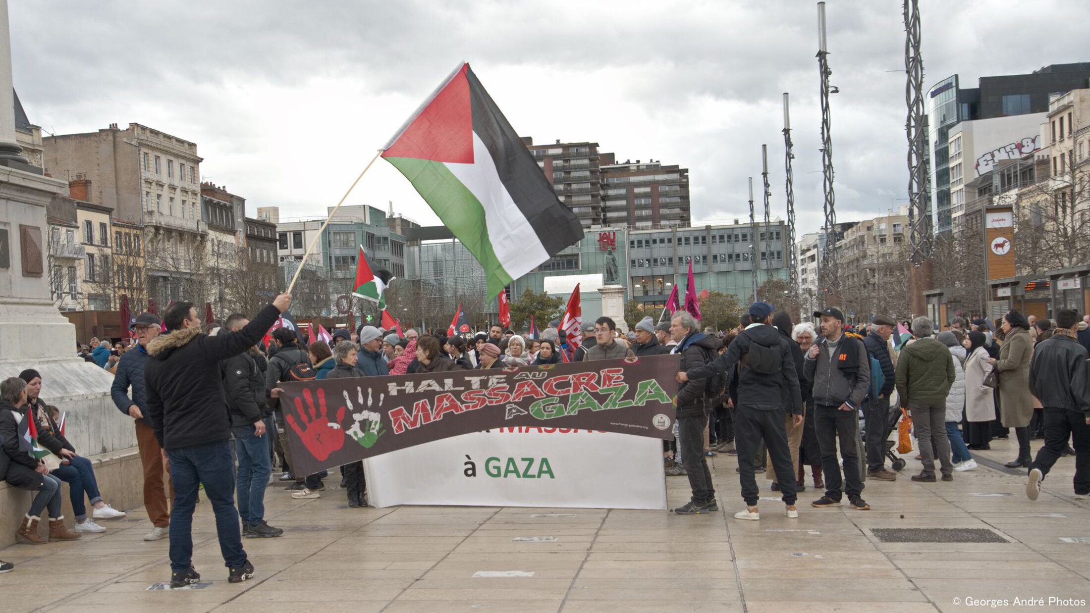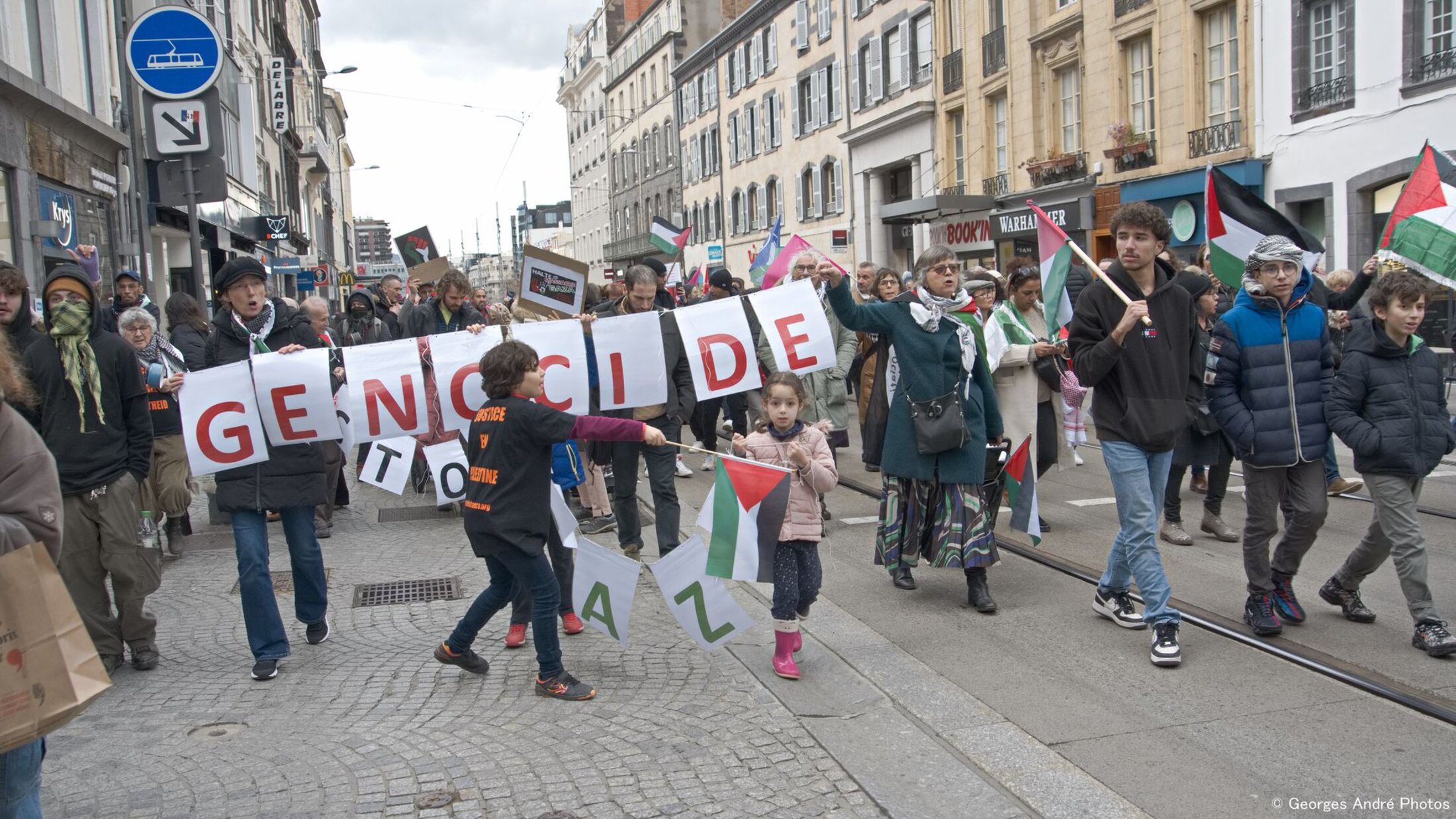 Des visages graves sur Jaude pour lire au sol : Gaza : "stop au massacre" dans tous les esprits.