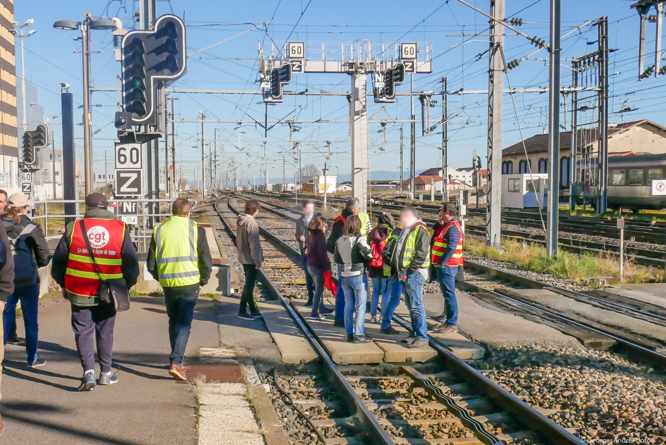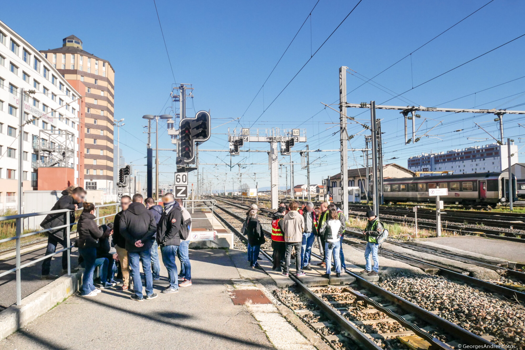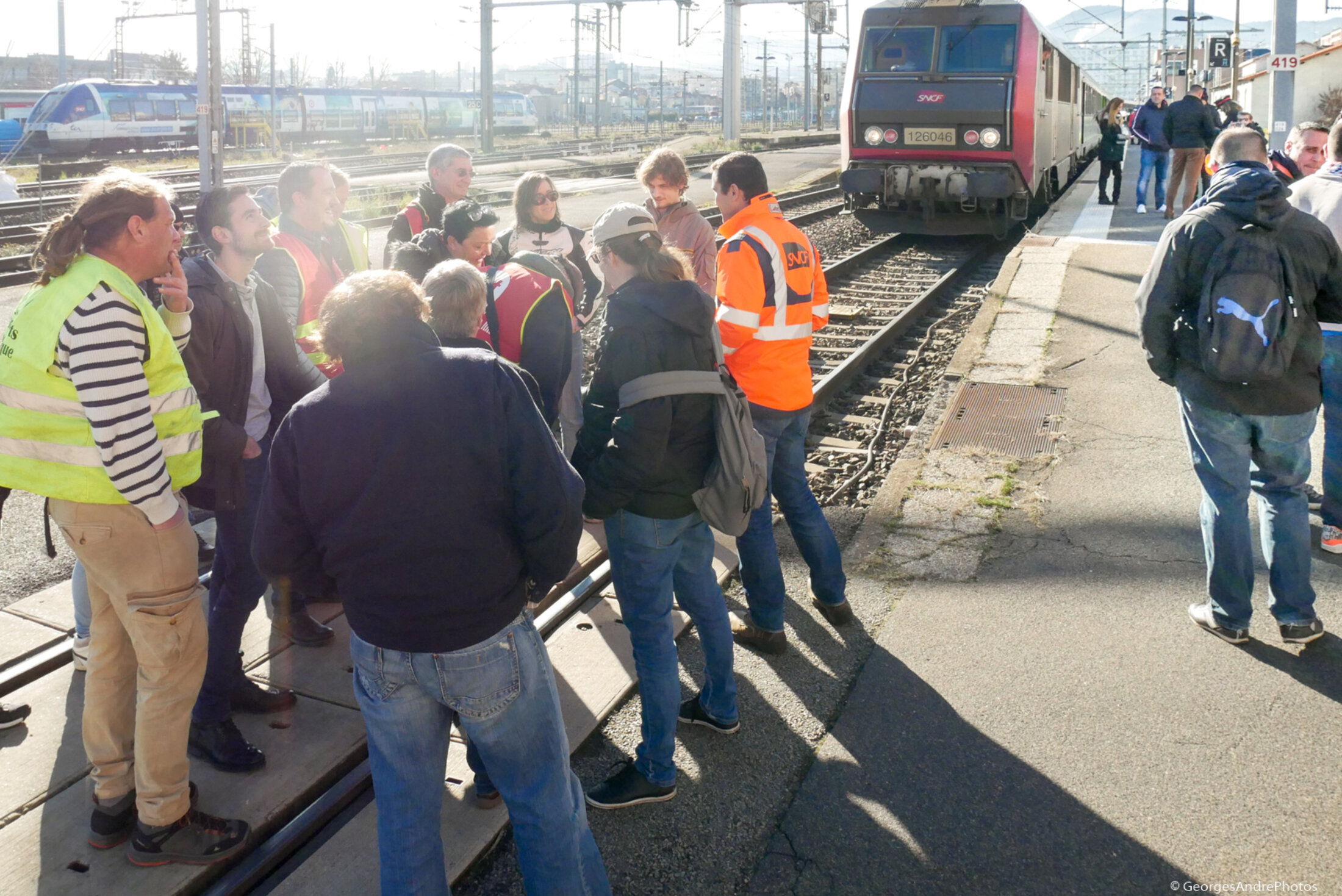 Très vite, un huissier arrive, flanqué de responsables SNCF. Il prend une photo et demande aux manifestants de cesser le blocage. Refus. La mécanique est enclenchée. Un groupe de cheminots CGT de la gare reste sur le quai et ne s'aventure pas sur la voie. Ils expliquent que, sur la voie, ils seraient licenciés sans délai. Les autres, restent groupés sur la seule voie du 13h30 qui commence à accuser un sérieux retard.