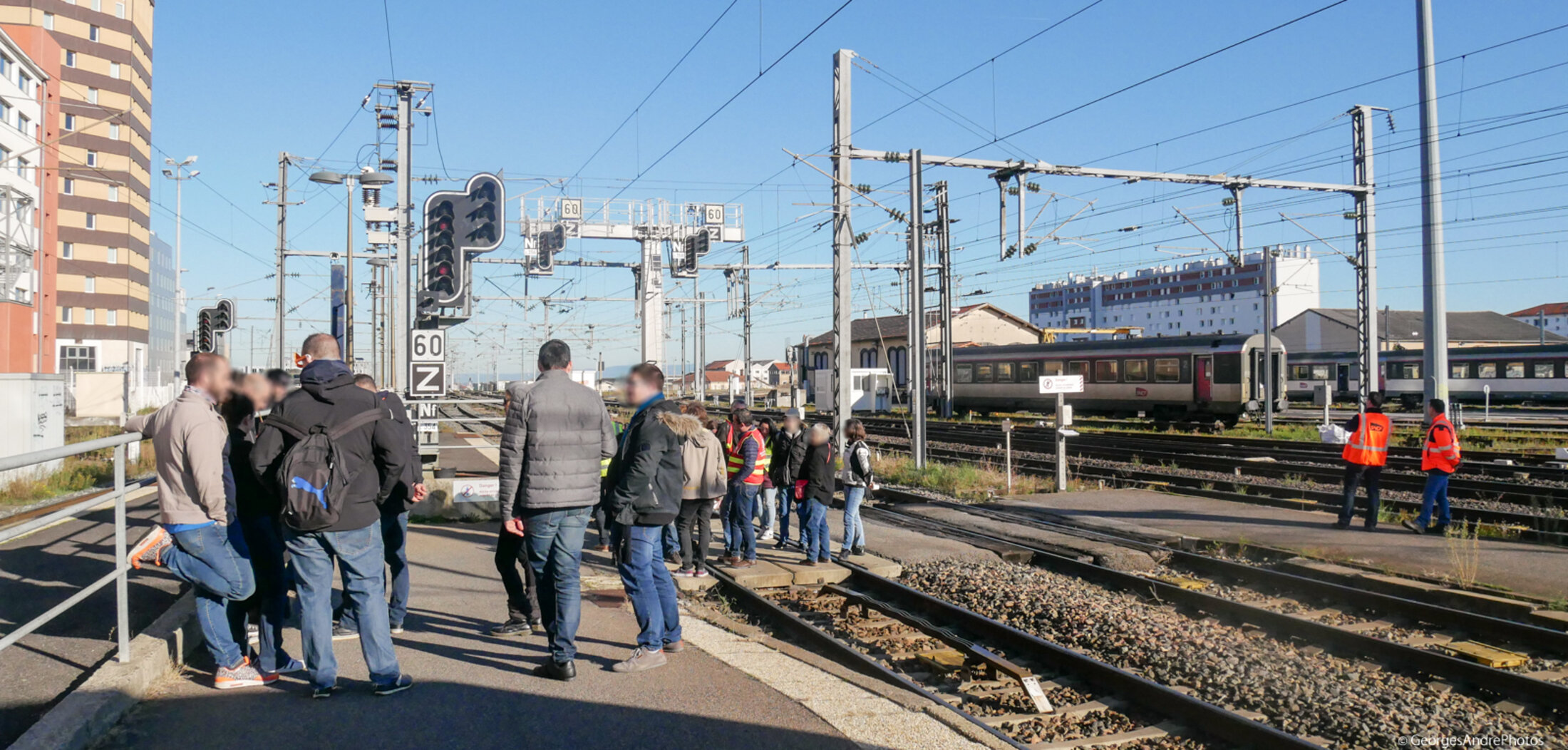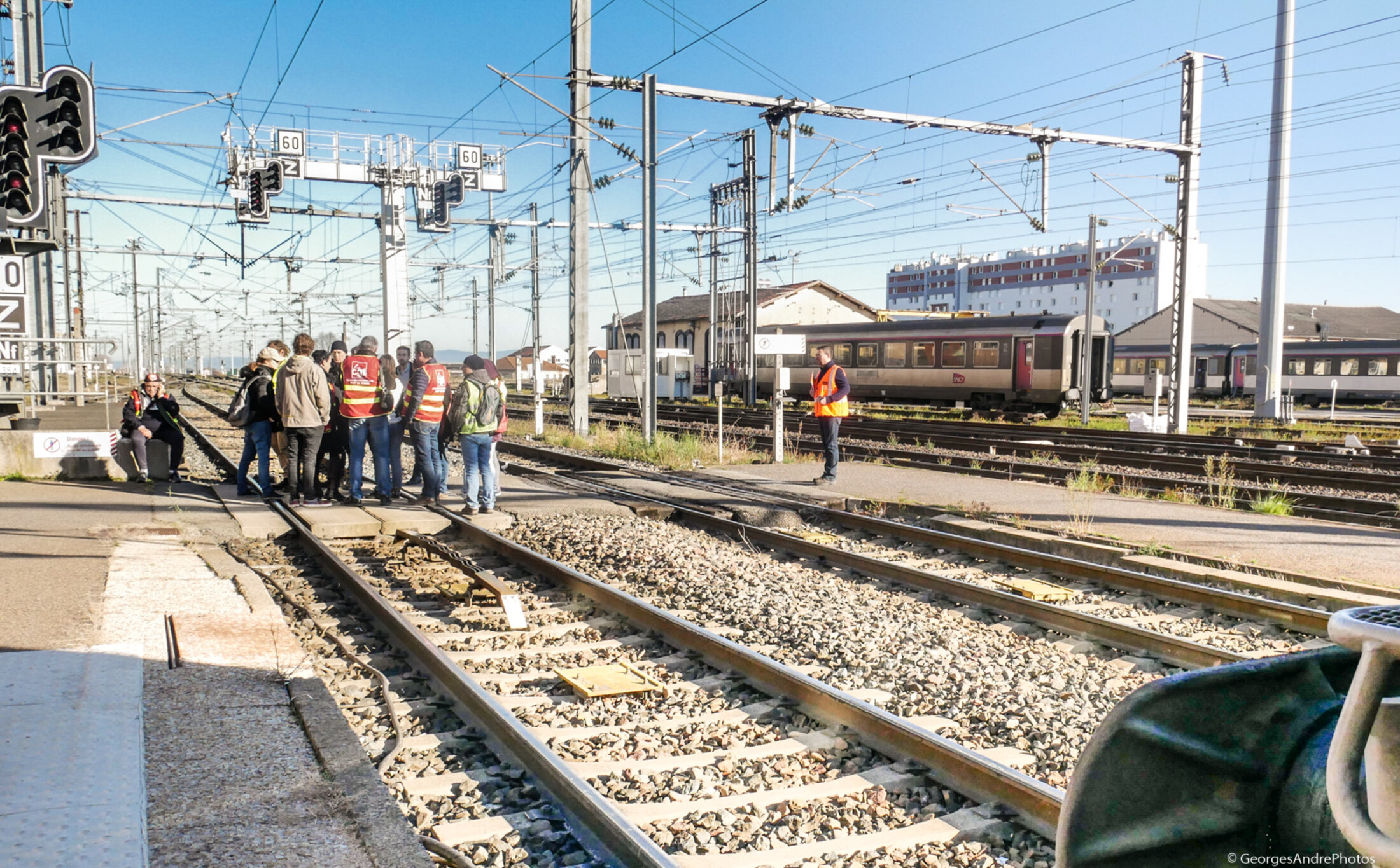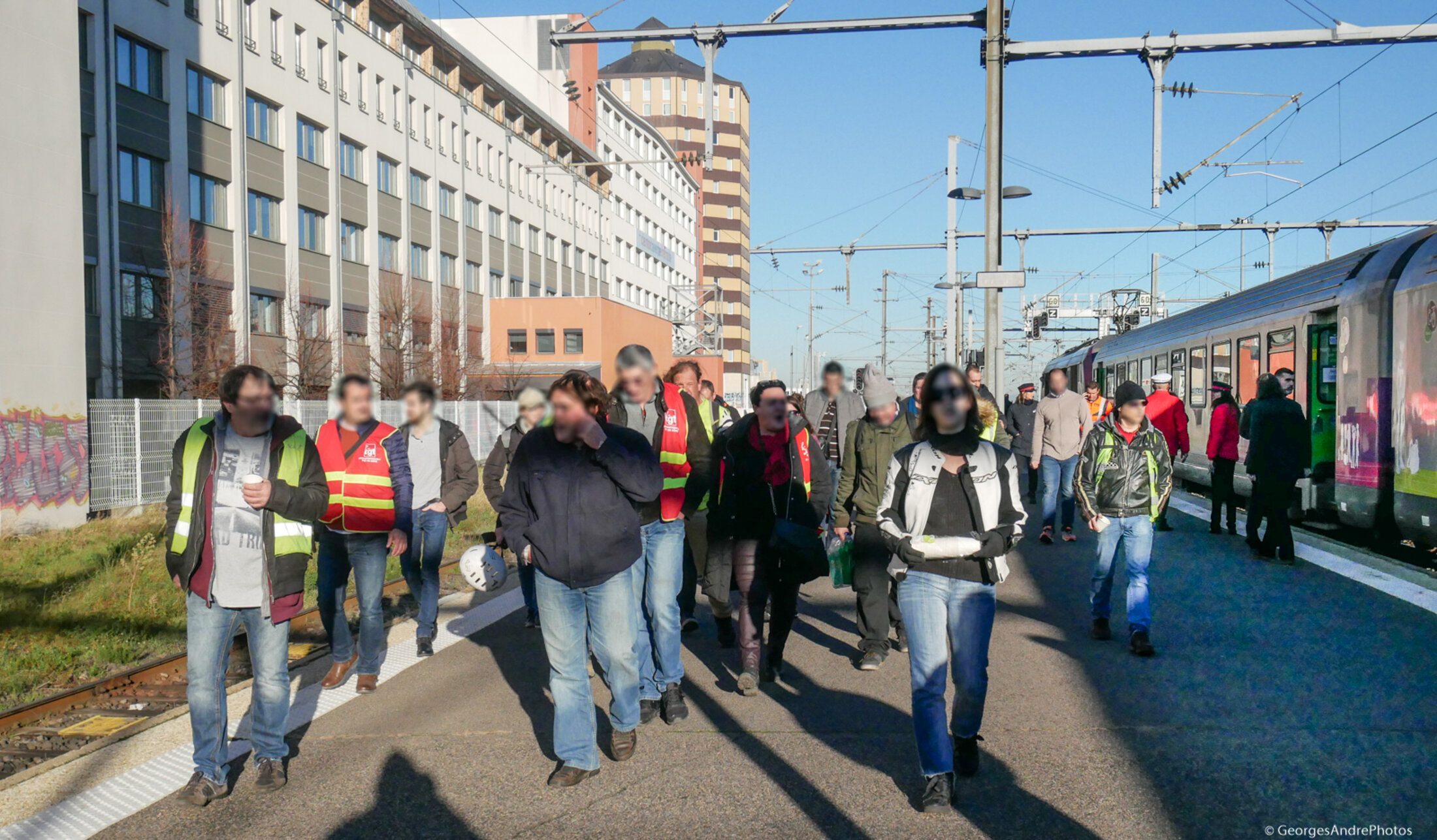 Très vite, un huissier arrive, flanqué de responsables SNCF. Il prend une photo et demande aux manifestants de cesser le blocage. Refus. La mécanique est enclenchée. Un groupe de cheminots CGT de la gare reste sur le quai et ne s'aventure pas sur la voie. Ils expliquent que, sur la voie, ils seraient licenciés sans délai. Les autres, restent groupés sur la seule voie du 13h30 qui commence à accuser un sérieux retard.