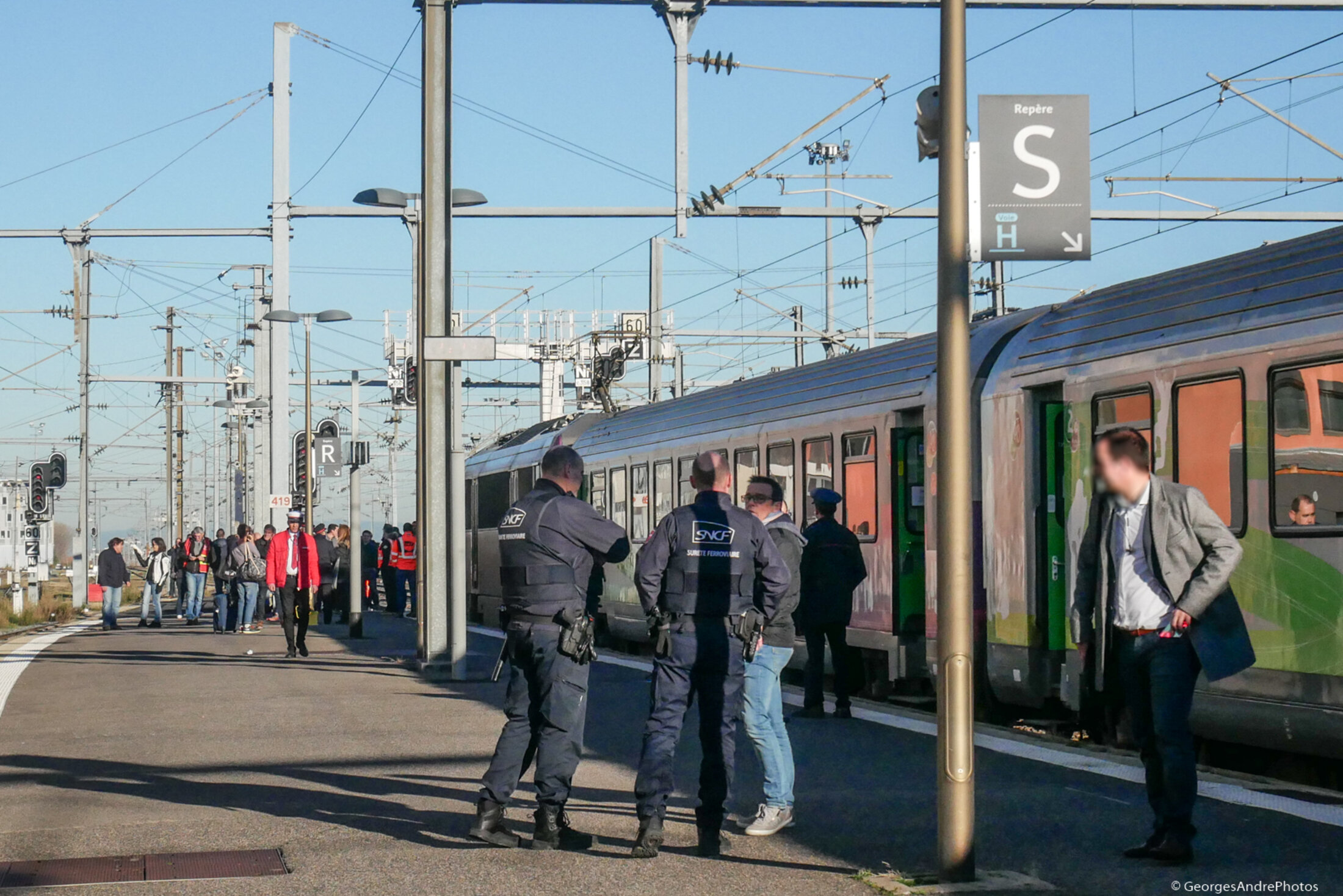 Bientôt deux heures que le blocage a débuté. Les voyageurs manifestent parfois et discrètement impatience ou ras-le-bol. Sur le quai, des responsables SNCF tentent un dialogue pour dénouer la situation. Deux membres armés de la Sécurité Ferroviaire et leur responsable sont arrivés.
