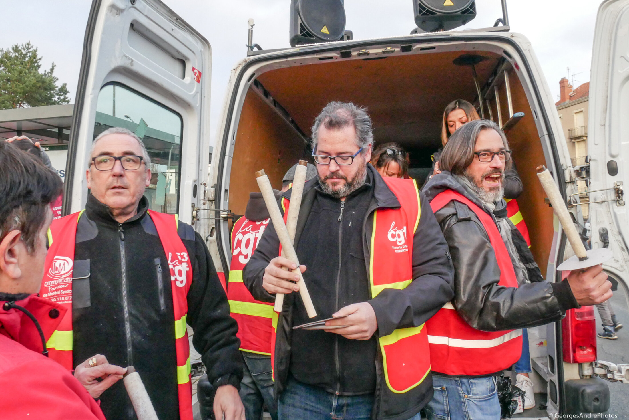 La CGT toujours très organisée - c'est bien utile et bien plus ! - distribue à ses militants des torches qui serviront tout au long de la manifestation. Les flambeaux sont de toutes sortes, les traditionnels comme les électriques et les lampes-tempête que certain.e.s ont encore dans leur cave ou sur leur cheminée.