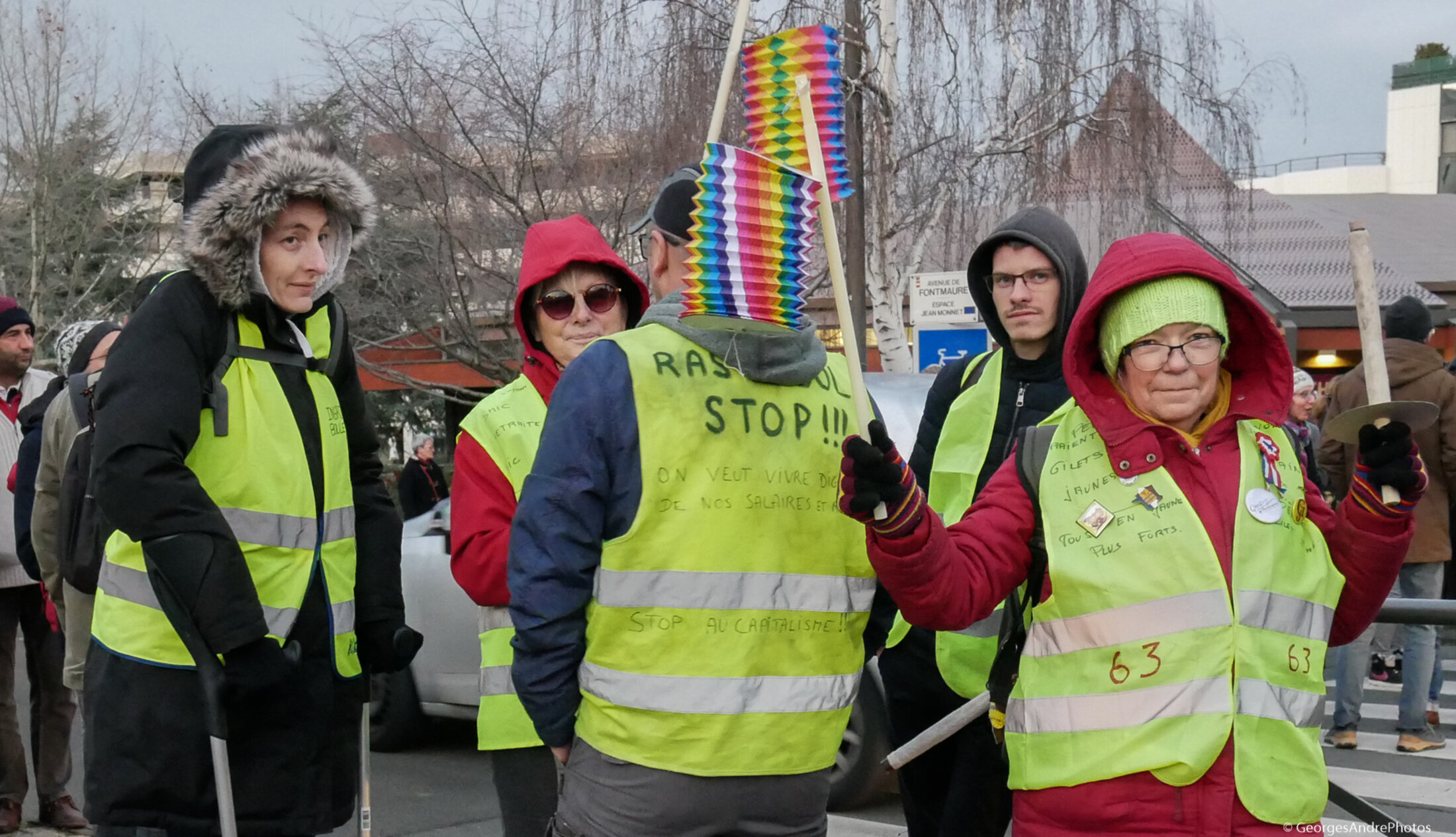 On peut être Gilets jaunes, on a beau être Gilets Jaunes, justement quand on est Gilets Jaunes et qu'on a passé l'hiver sur les ronds-points, on sait se protéger du froid. Elle savent s'en protéger. Ça n'empêche pas de tenir d'une main une "torche" et de l'autre, un flambeau en papier, pas encore allumé.