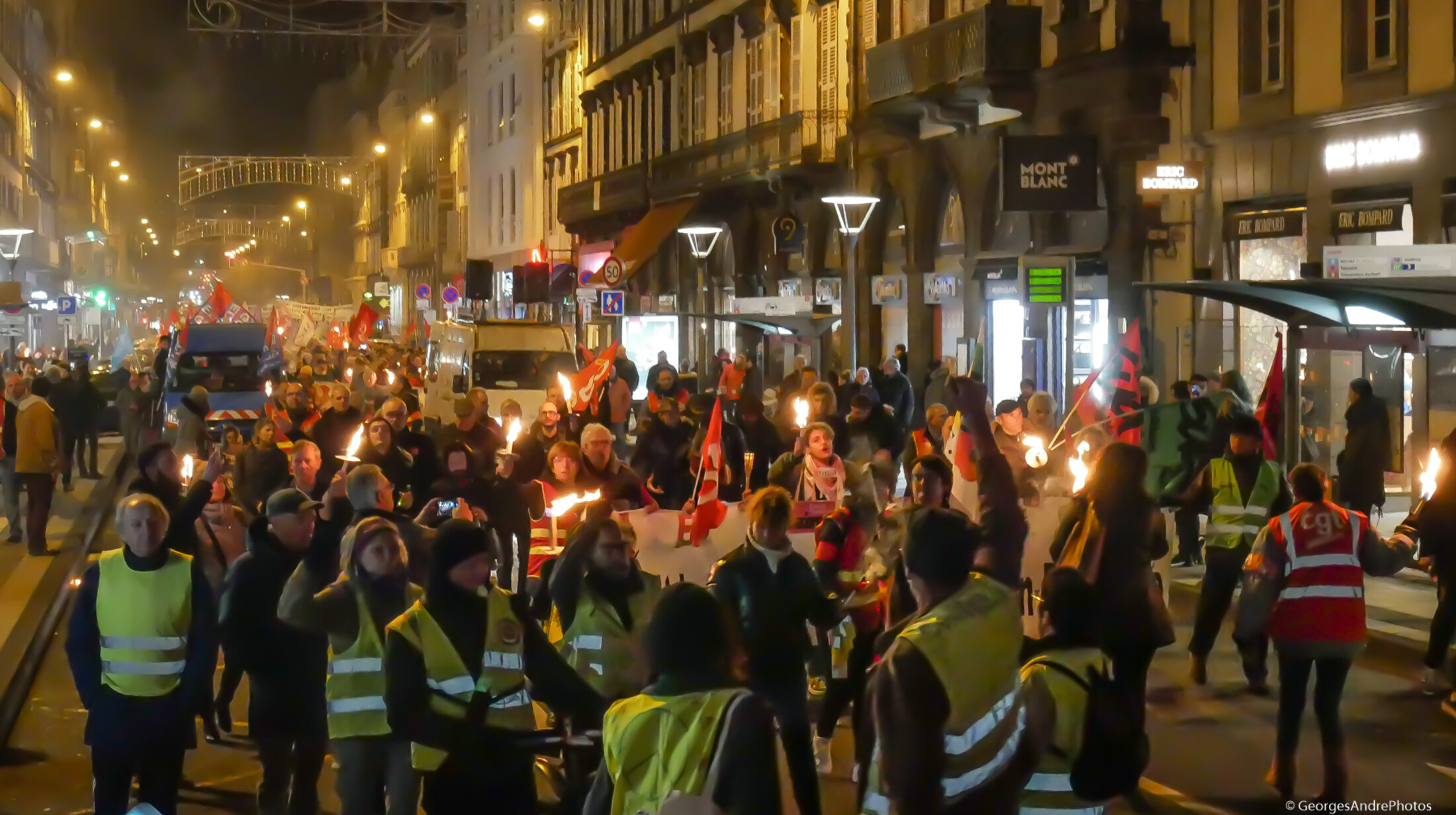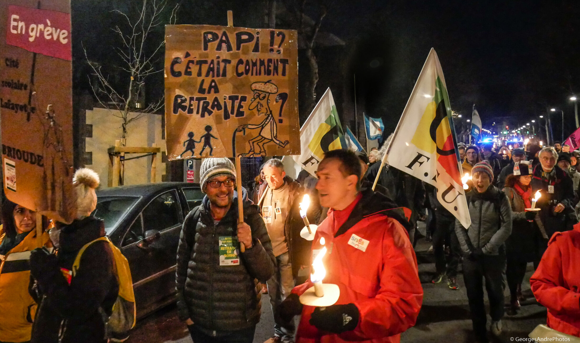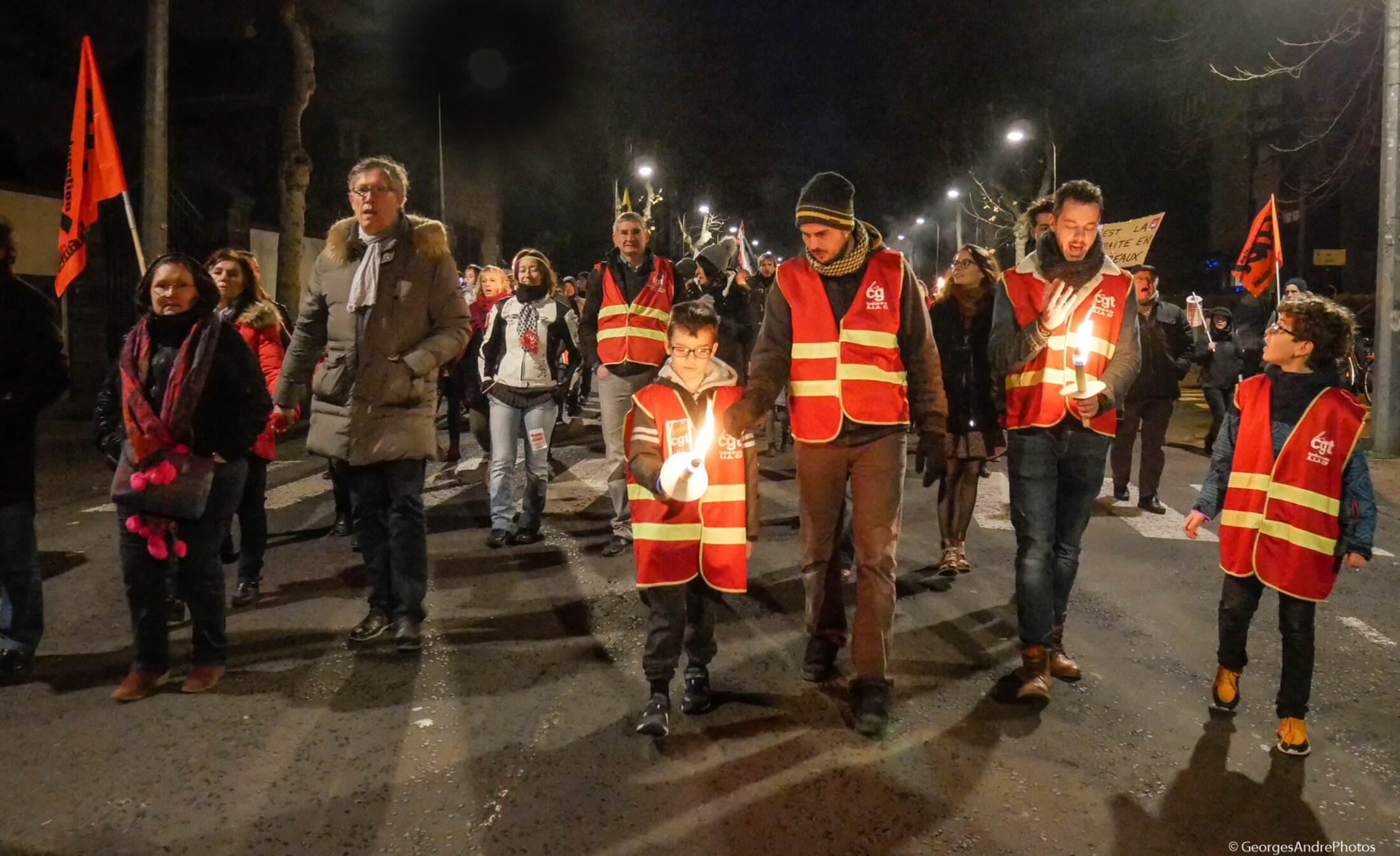 La lueur des torches montre la longueur du cortège où tous les âges se côtoient dans le même rejet de cette loi de régression sociale sous couvert d'une justice mensongère face au fond de pension et autres institutions financières qui attendent le pactole après la décoration du début de l'année.