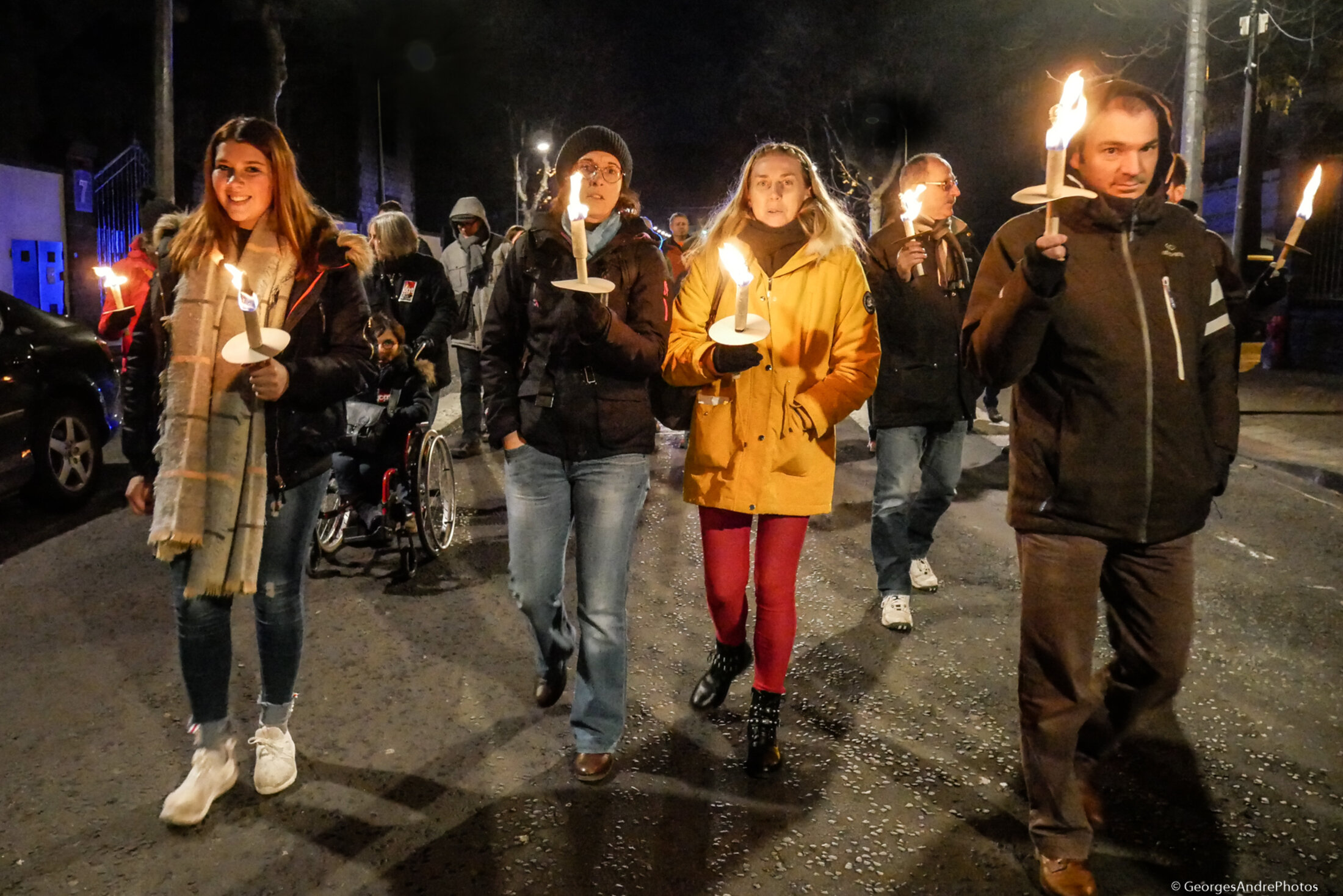 Au milieu de la foule, lueurs tenues haut et chant sur les lèvres.