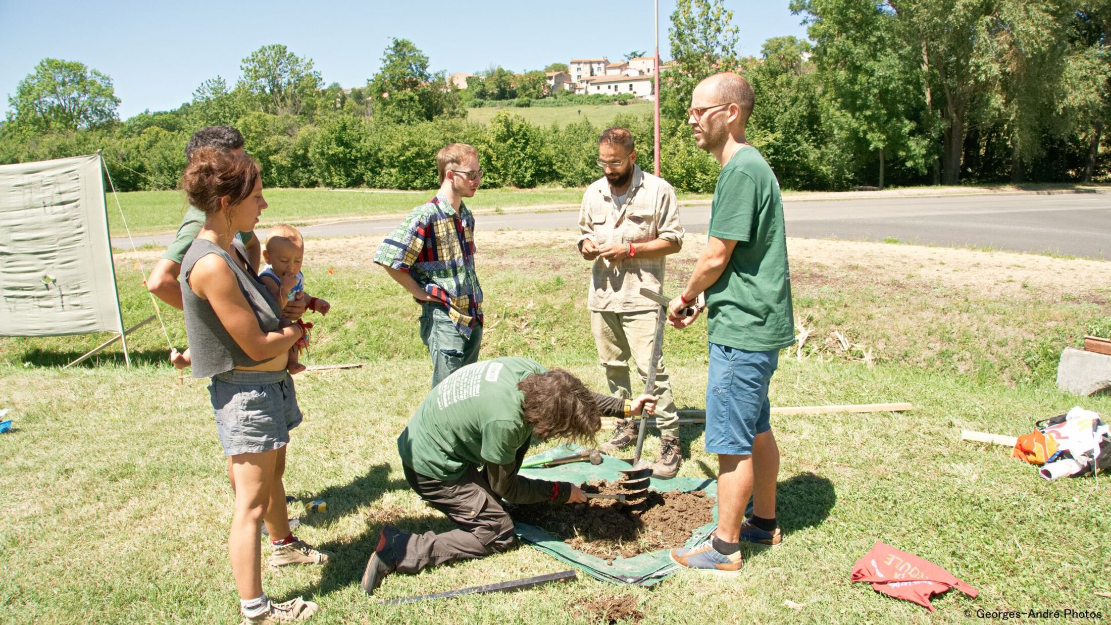 Un trépan manuel parmi trois tailles pour forer verticalement par rotation en maintenant une pression maximale sur le sol. C'est le principe. En réalité, c'est plus difficile qu'il n'y paraît pour trouer la bande herbeuse très dense. Beaucoup s'y sont essayé·es pour enlever un peu plus de terre soigneusement recueilli dans la bâche pour être réutilisé. Deux trous doivent être creusés. Il a fallu un certain et même la journée pour ne pas en faire un travail de forçat. Dans un trou la trépan a touche un rocher ou une grosse pierre ... Au final deux bons trous furent néanmoins creusés d'au moins 80cm déclaré apte à recevoir ce qui viendra le lendemain après la manifestation : un superbe panneau d'affichage de plein air planté sur ses deux longs poteaux, construit sur ce terrain.