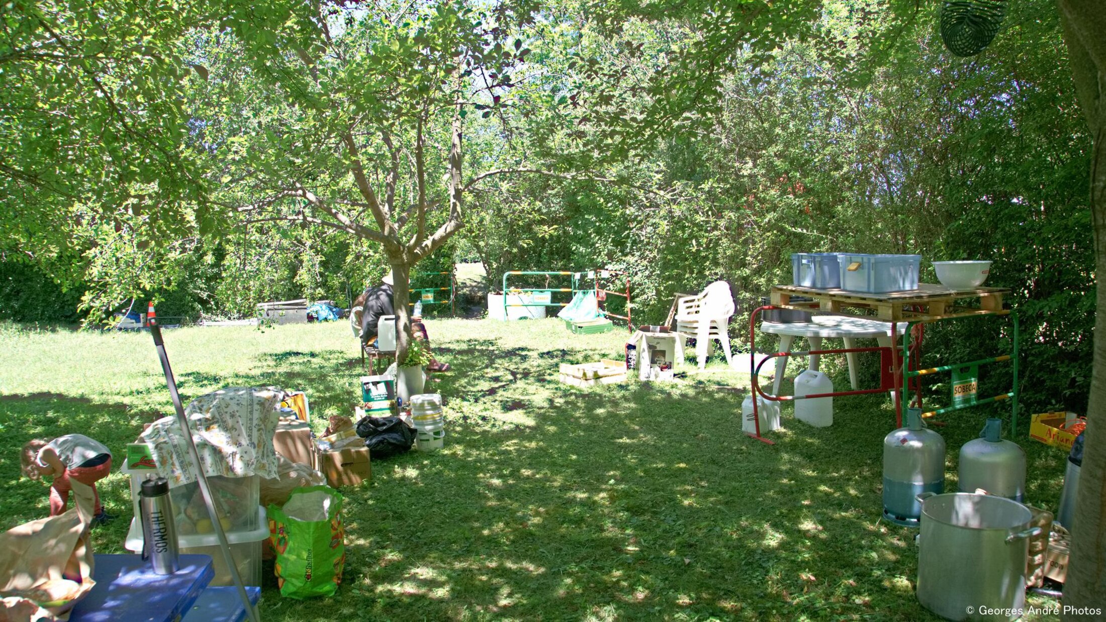 La cuisine dans le verger telle qu'installée au premier jour quasiment désertée pour l'heure.