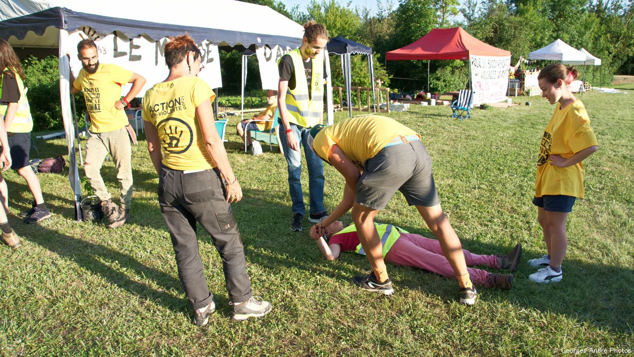 Une formation dans son moment pratique où il est appris - en gros - les rudiments à posséder pour une évacuation manu militari en évitant de faciliter la tâche de l'évacuateur/trice comme de se faire mal. Là c'est le stade du portage.