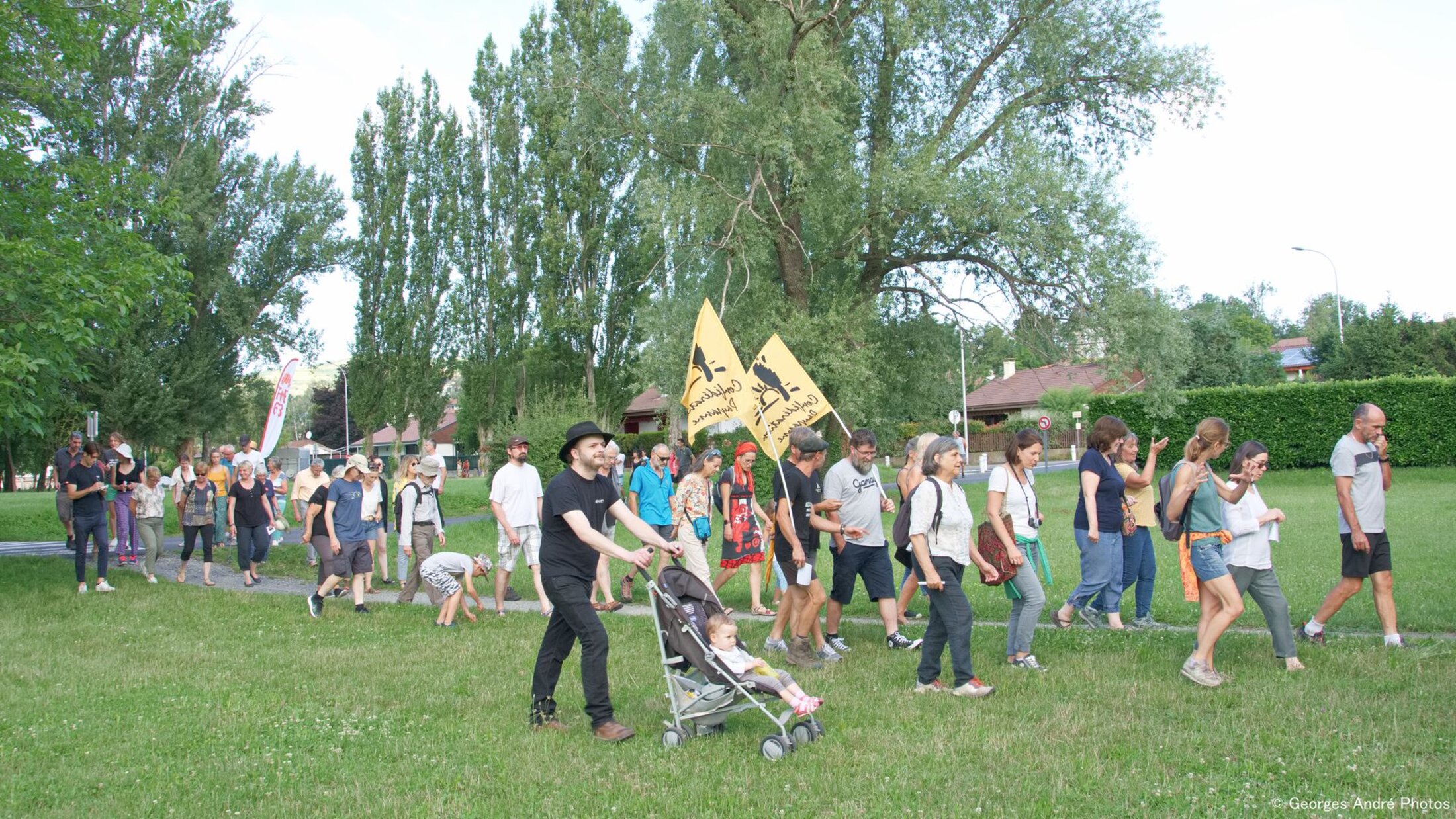 Fort heureusement pas trop chaud, sous un ciel clair, le cortège attend et écoute, annonce sur le dos