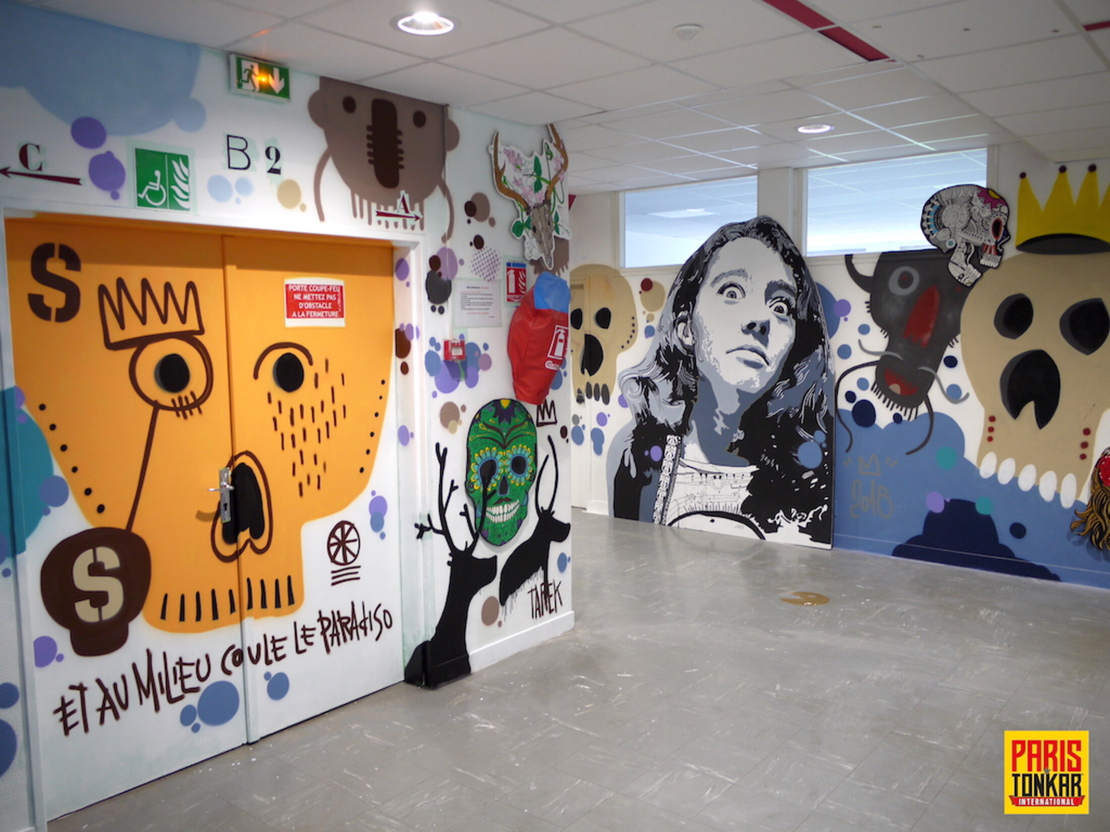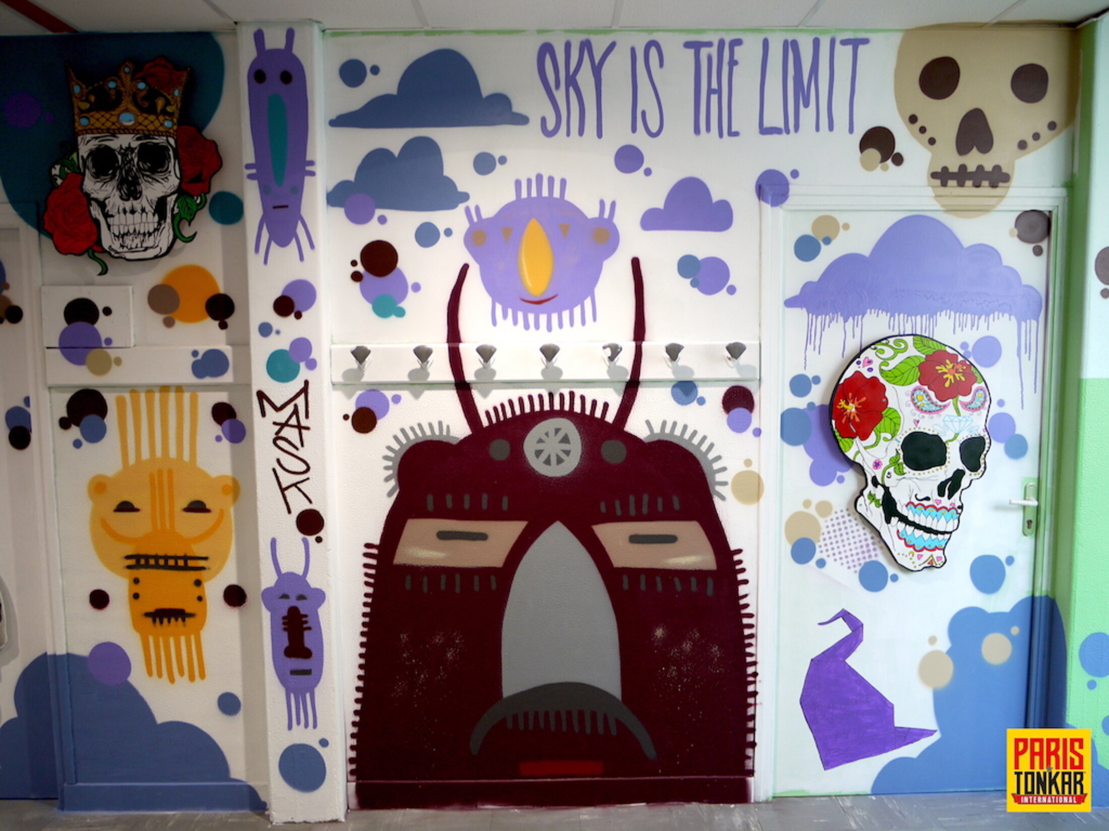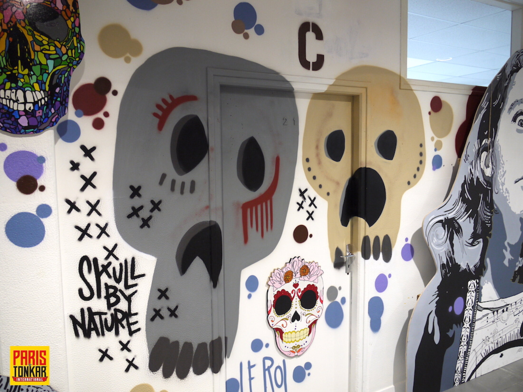 A l’initiative du professeur d’arts plastiques du collège Charles de Gaulle à Plœmeur, Tarek est intervenu dans les couloirs avec des élèves sur le thème des vanités. Il a également peint des masques. Le 29 juin lors de l’inauguration des murs réalisés au 2e étage, il peindra deux masques dans la cour du collège.