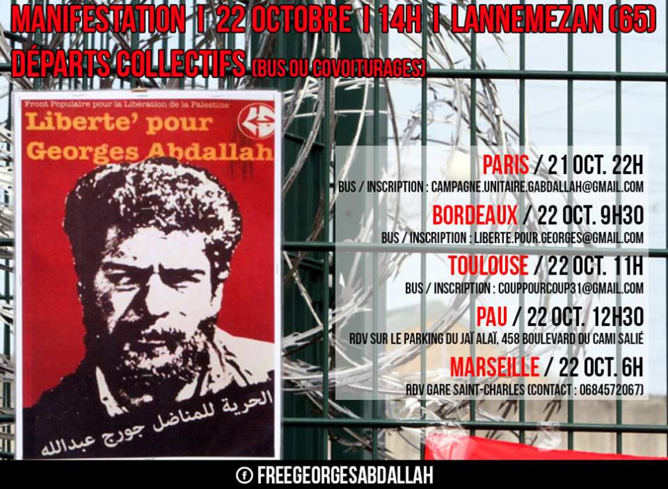 Georges Ibrahim Abdallah, fidèle à ses engagements, n’a jamais rien renié de son combat solidaire avec les peuples en lutte contre l’impérialisme et le sionisme, et pour la libération totale de la Palestine. Et c’est pour cela que la justice française, aux ordres d’un gouvernement soucieux de préserver les intérêts impérialistes français au Moyen-Orient, lemaintient en prison depuis plus de31 ans.