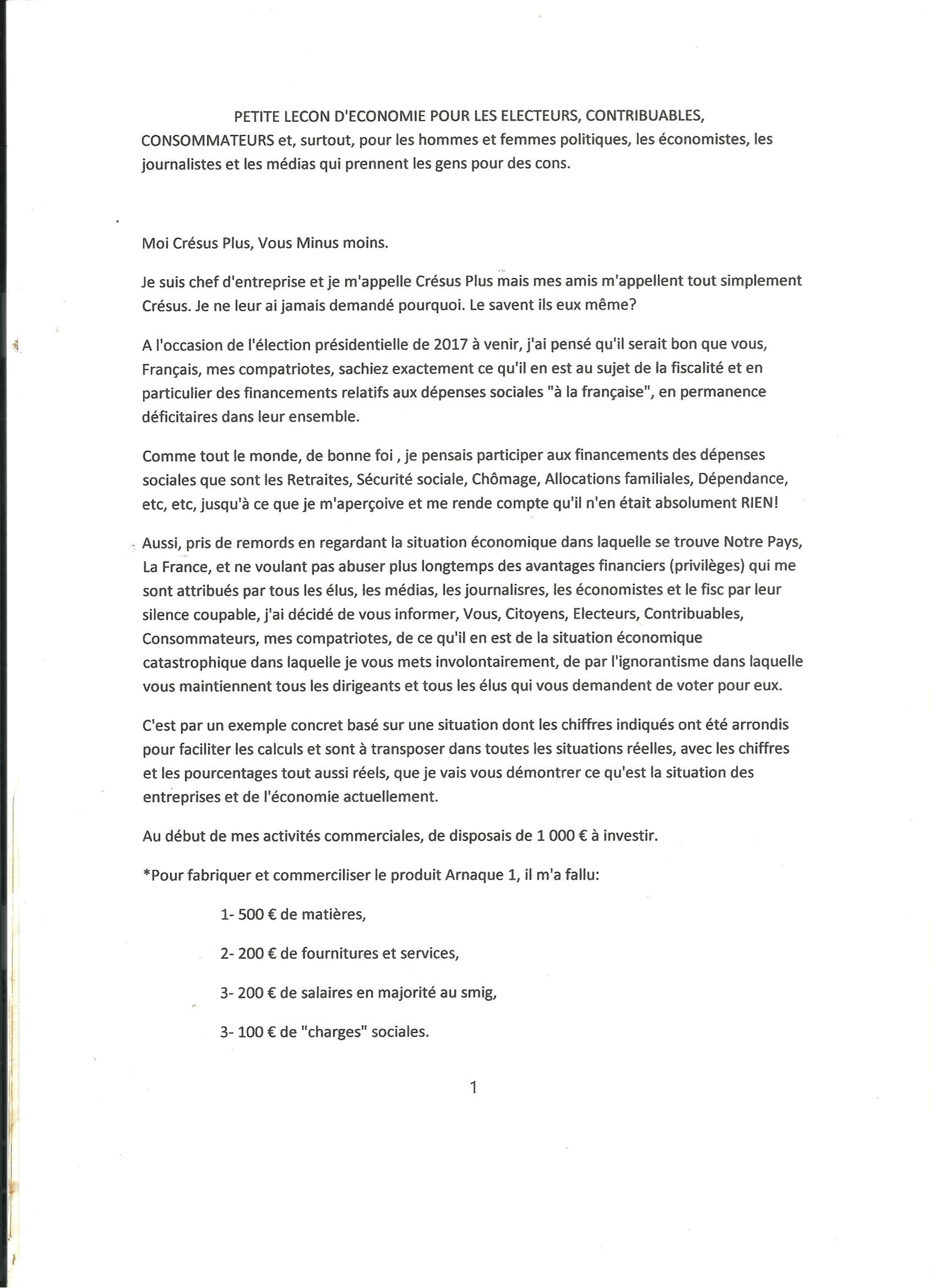 *Je rappelle que les lecteurs pressés de me critiquer sont priés de lire au préalable LE REMEDE RADICAL que je propose à TOUS les dirigeants politiques aux Points N° 2 et 3 de la page 3 pour redesser l'économie françaises et renouer la confiance avec TOUS les Français des Villes et des Champs.