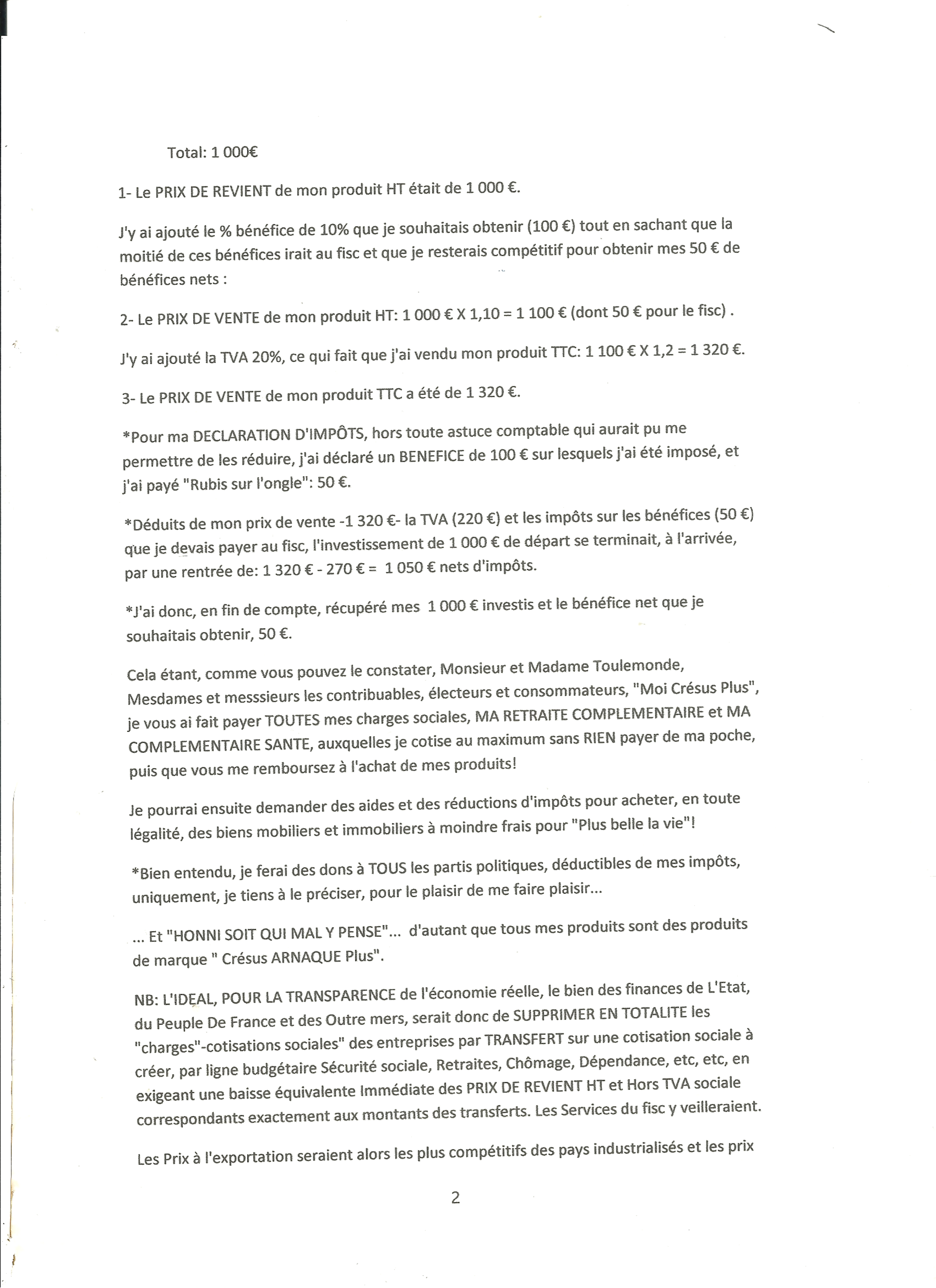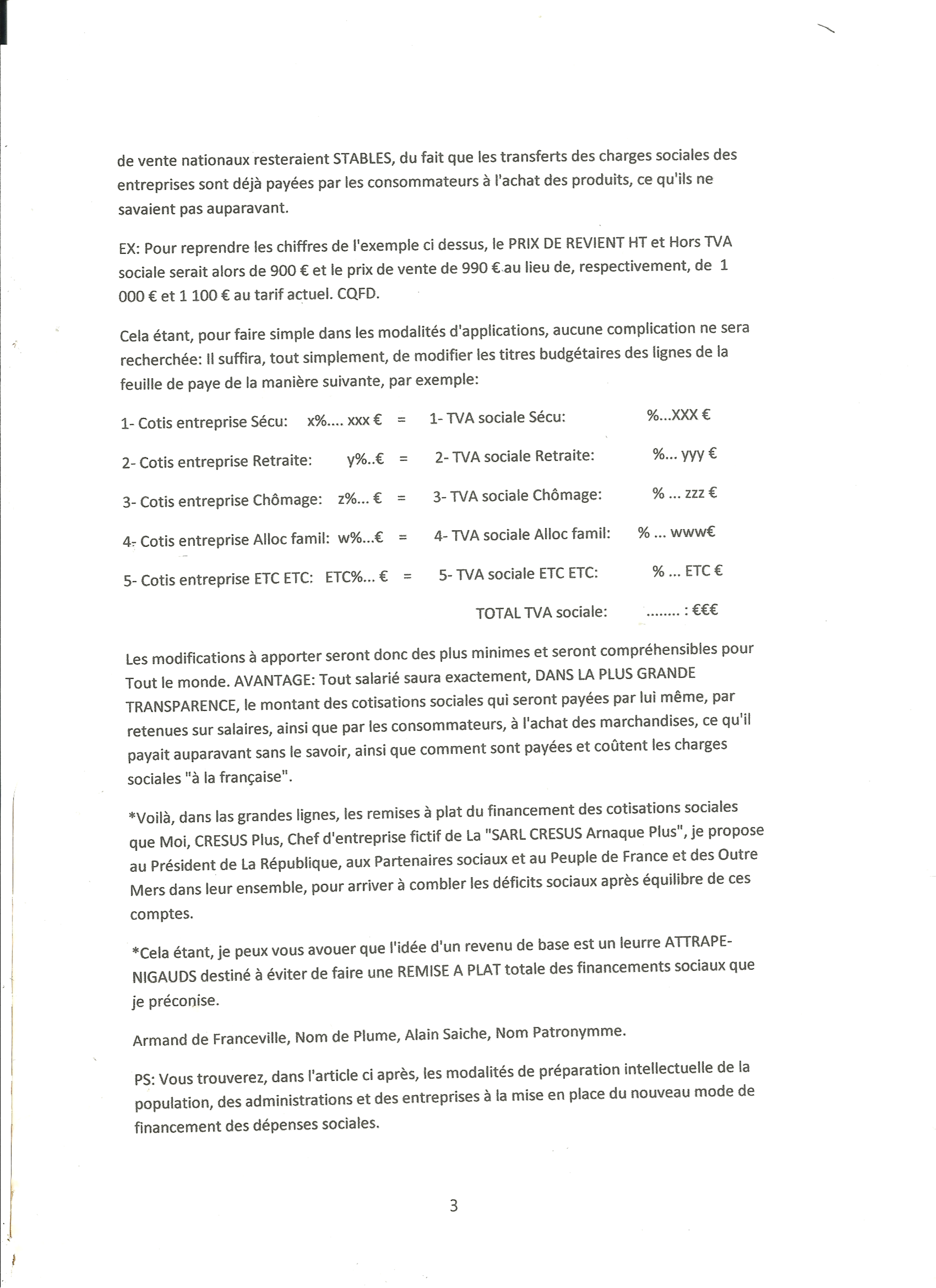 Les prélèvements sociaux sont compris dans les cotisations sociales et intégrés dans le calcul des coûts de production et de Vente! Je défie le monde entier de me démontrer le contraire de mes échanges épistolaires 2017-2018-2019 entre Emmanuel Macron et moi, Armand de Franceville, Nom de Plume, Alain Saiche, Nom Patronyme, 2 Avenue Casteroun 40 230 St Vincent de Tyrosse.