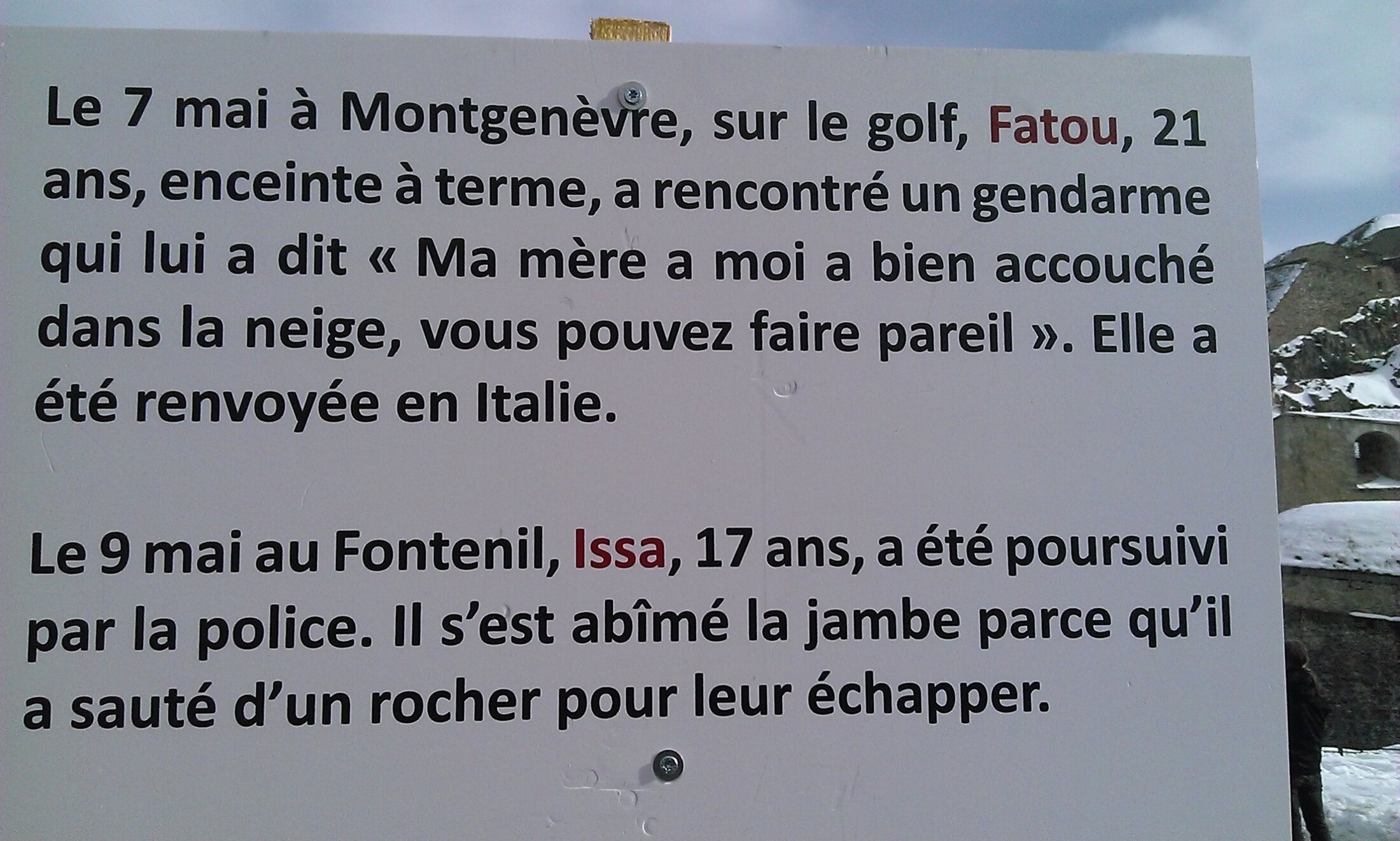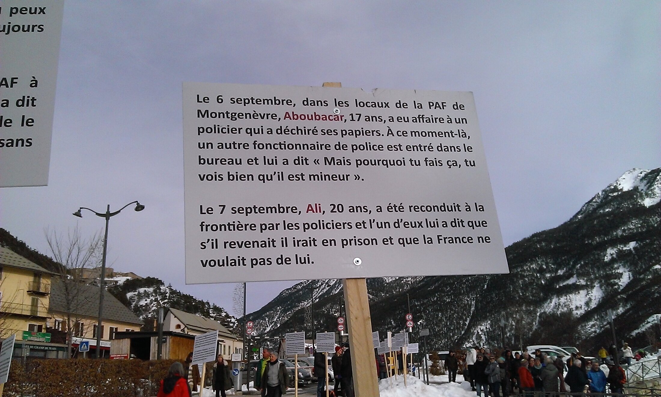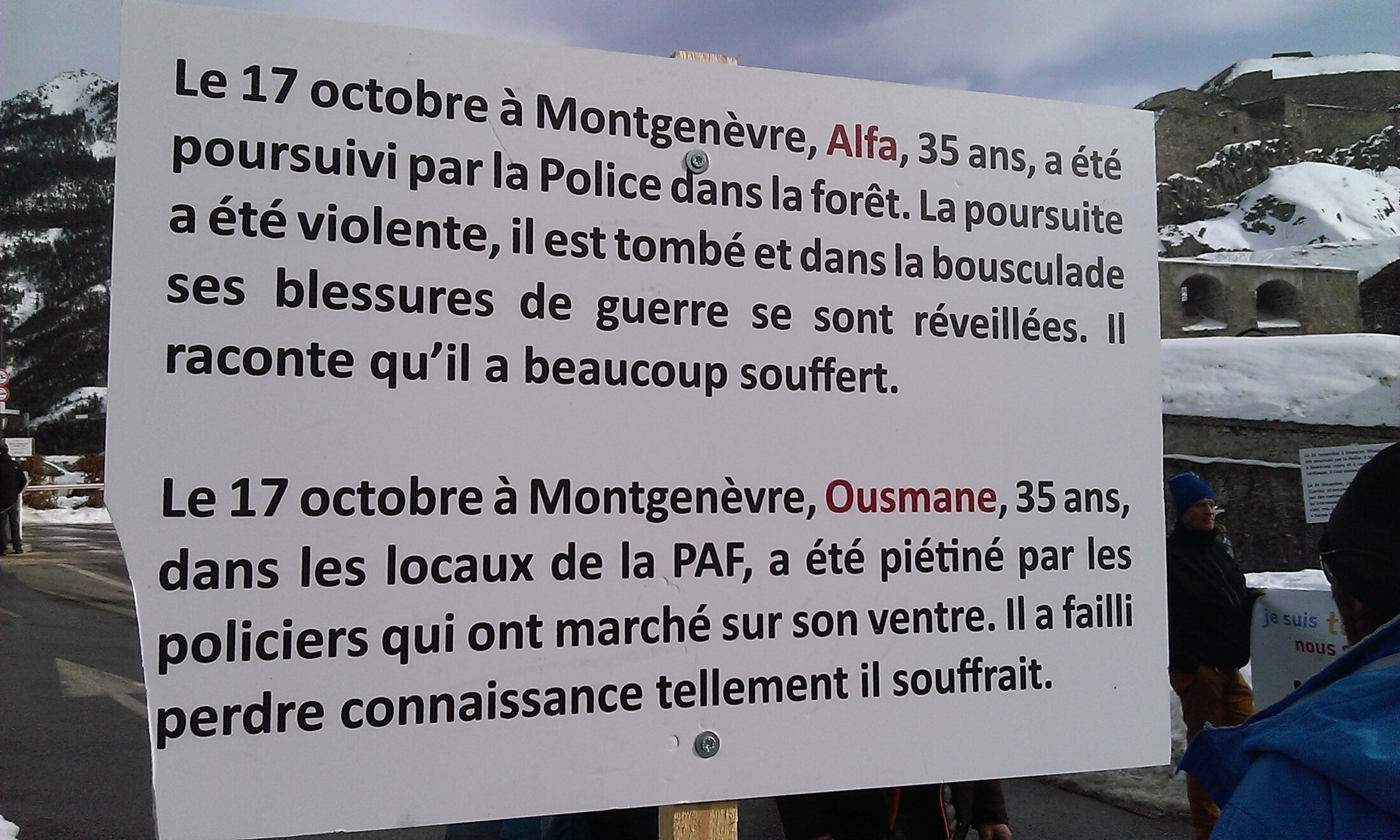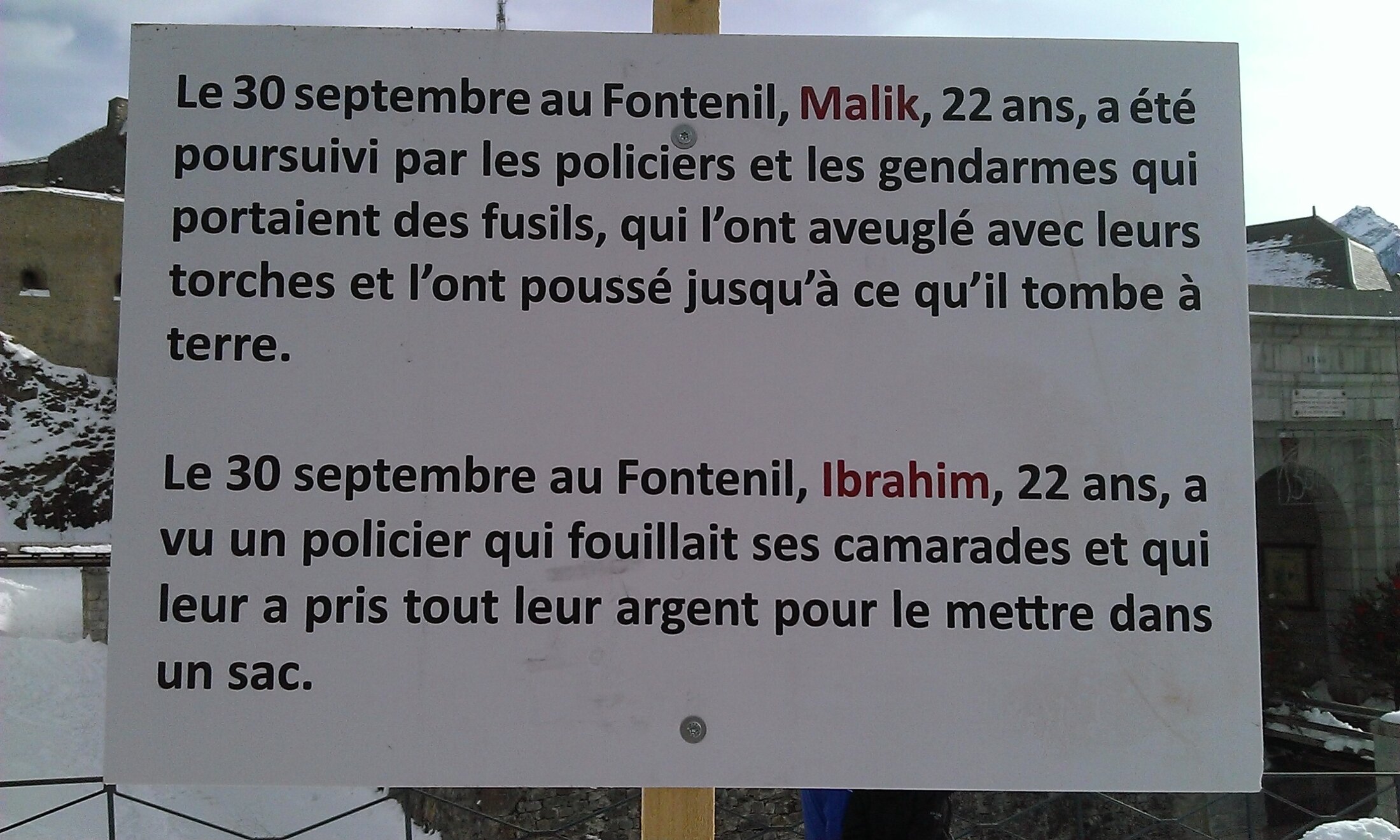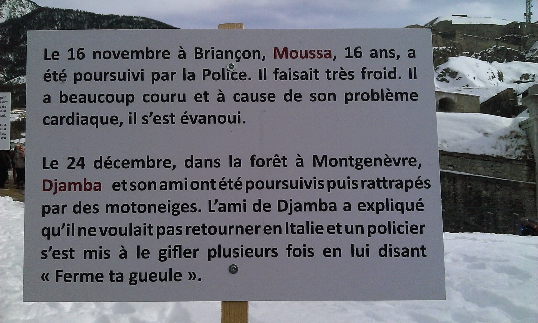 Dans la nuit du 6 au 7 février, Tamimou, jeune togolais, est mort d'hypothermie entre Montgenèvre et Briançon. La politique migratoire répressive mise en oeuvre par le gouvernement, au défi des droits fondamentaux des personnes, tue. Un rassemblement s'est tenu samedi à Briançon. Des panneaux évoquaient les traitements subis par ces personnes lors de leur périple.