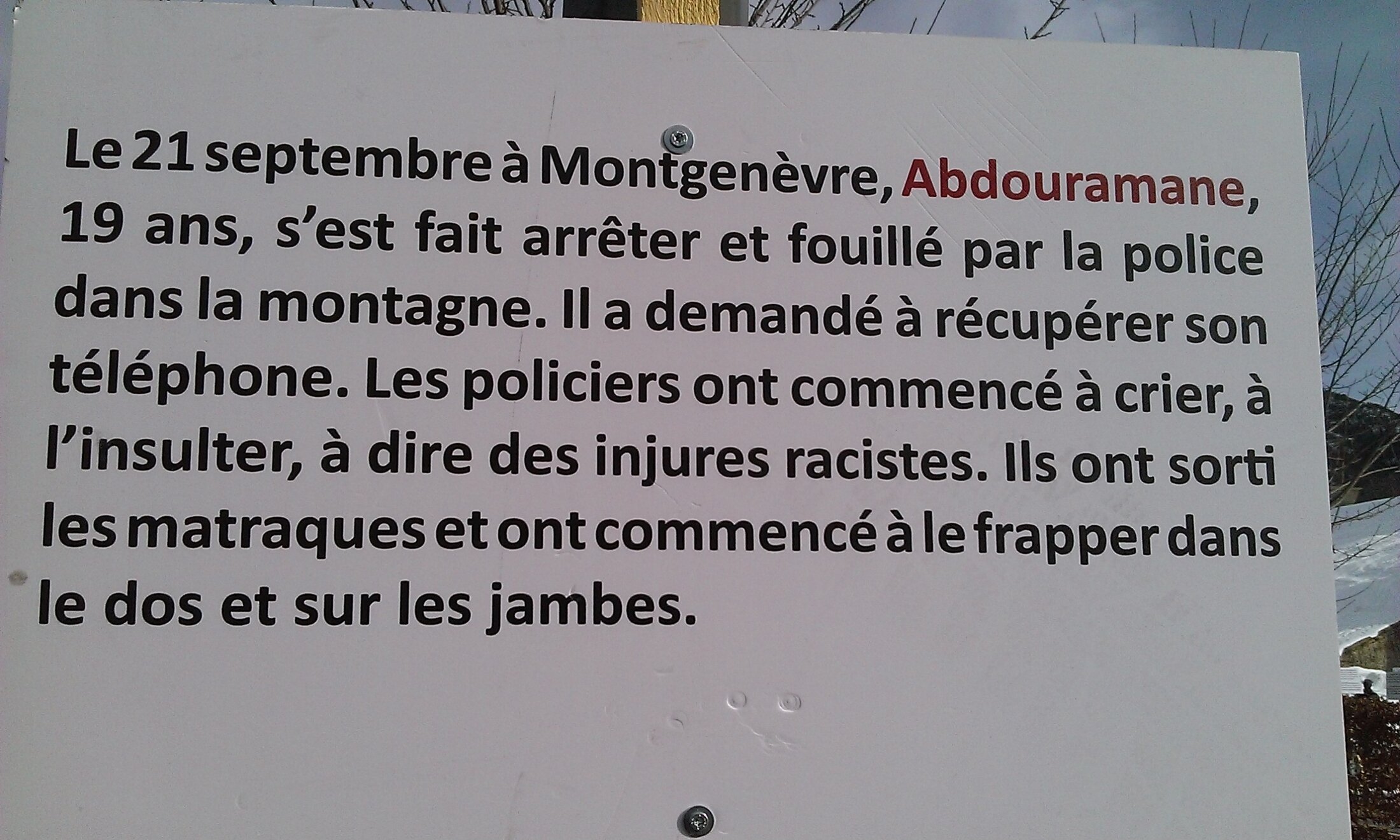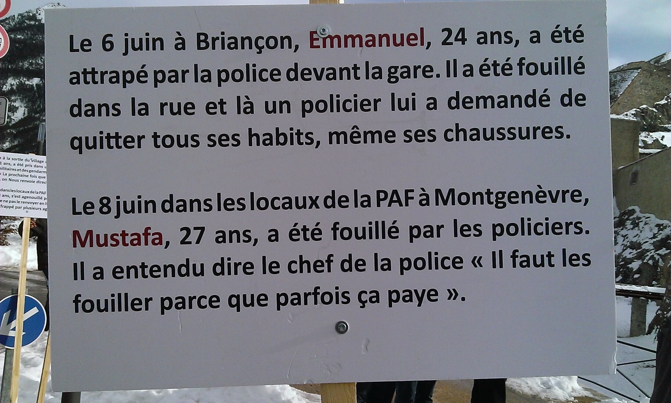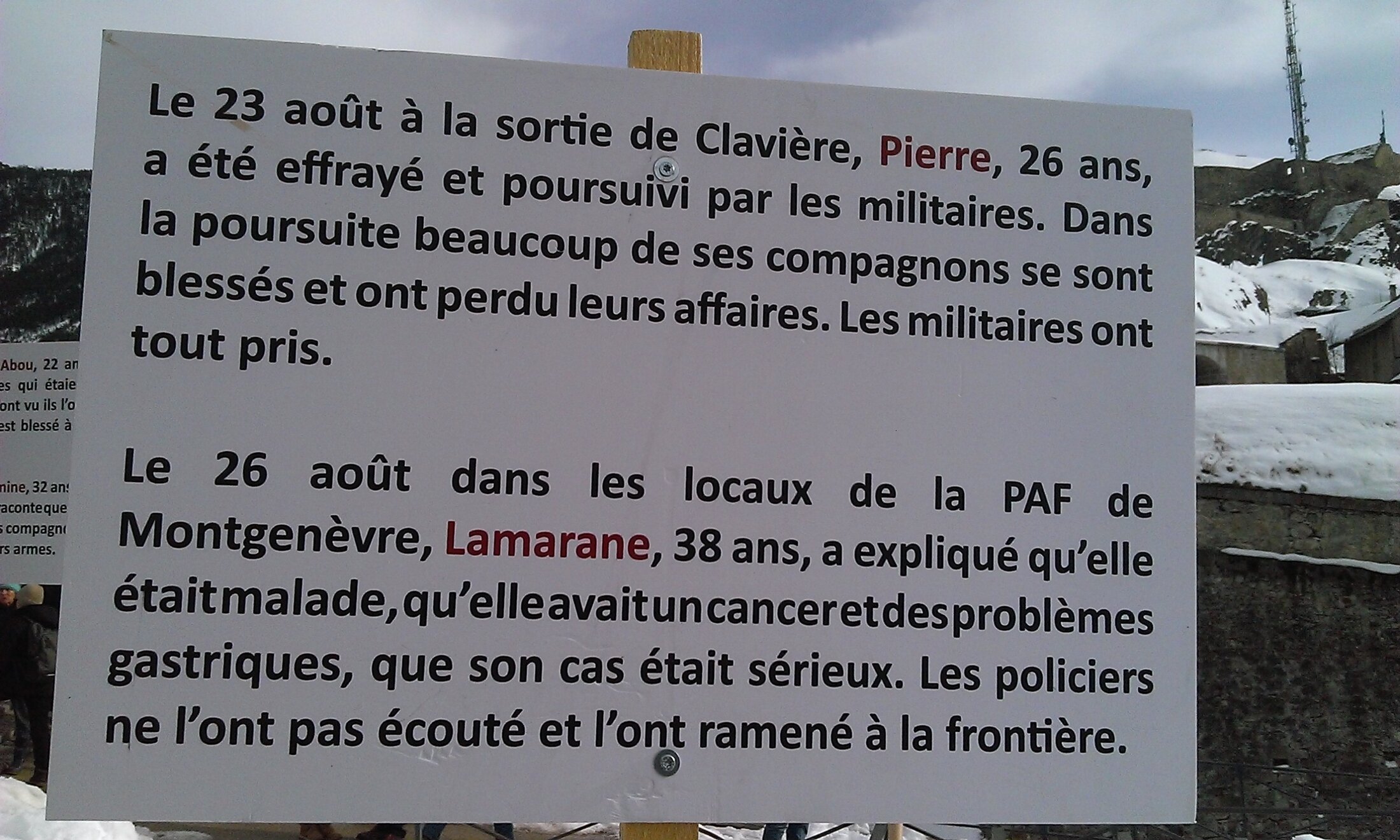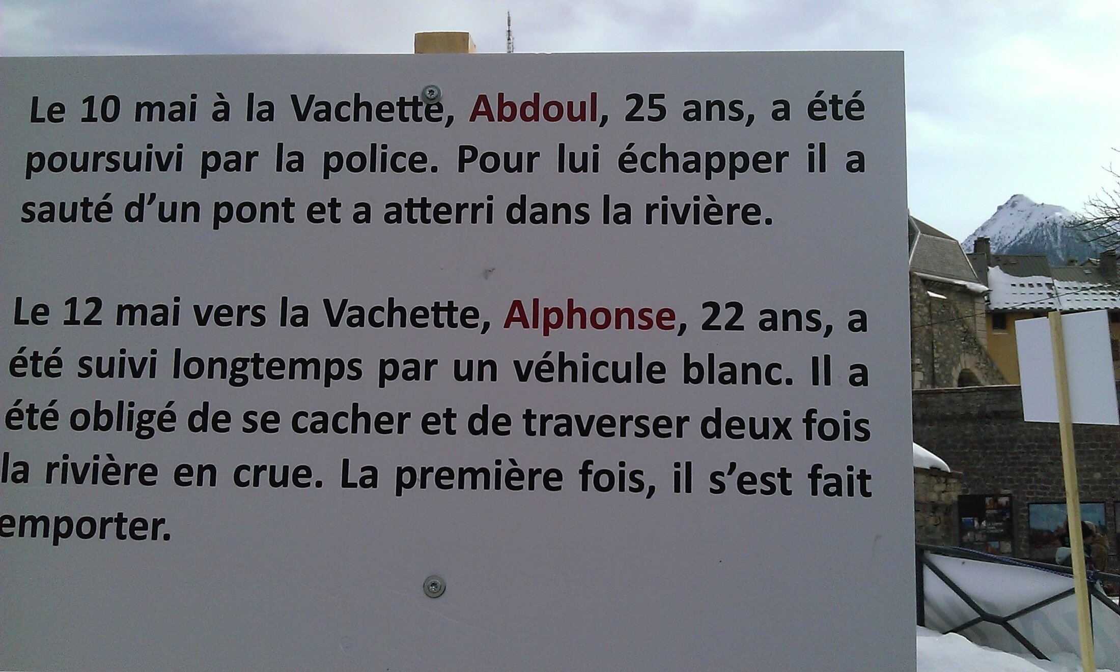 Dans la nuit du 6 au 7 février, Tamimou, jeune togolais, est mort d'hypothermie entre Montgenèvre et Briançon. La politique migratoire répressive mise en oeuvre par le gouvernement, au défi des droits fondamentaux des personnes, tue. Un rassemblement s'est tenu samedi à Briançon. Des panneaux évoquaient les traitements subis par ces personnes lors de leur périple.