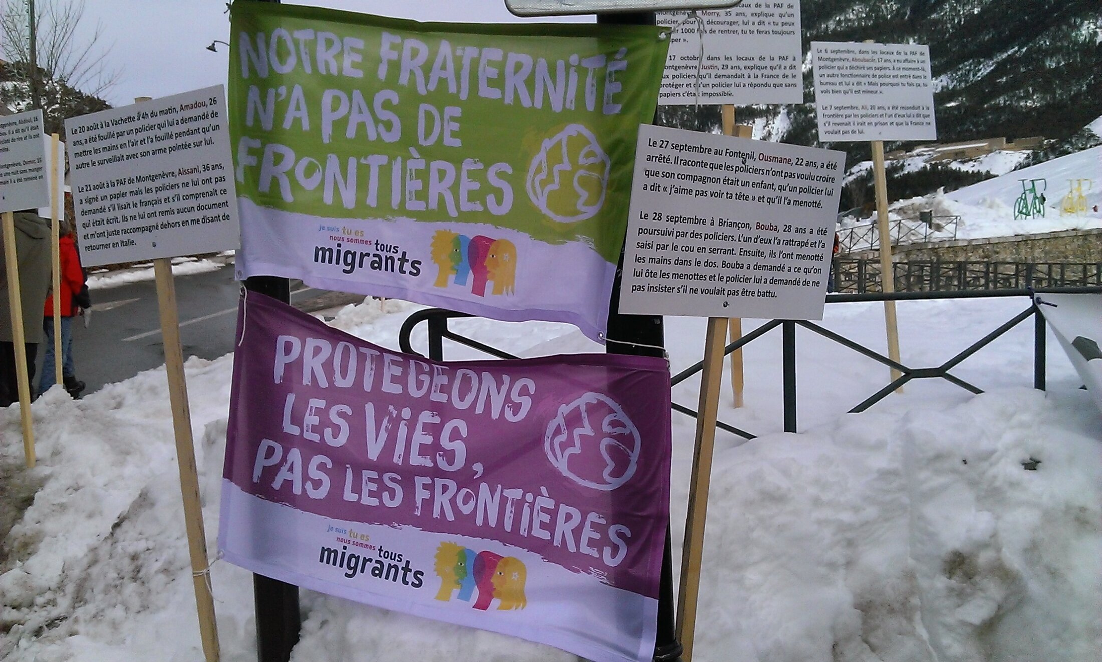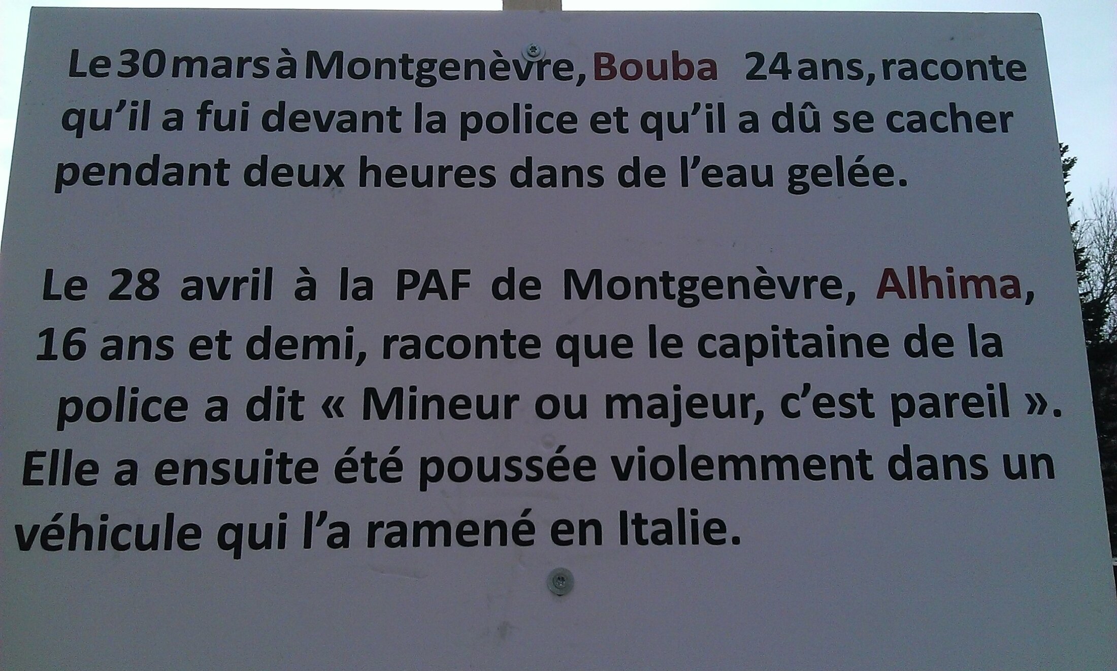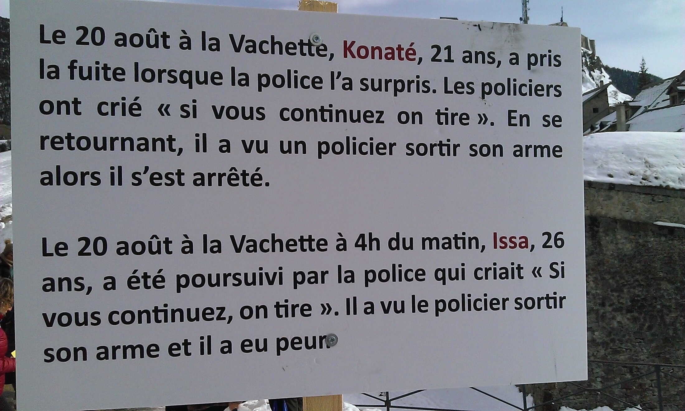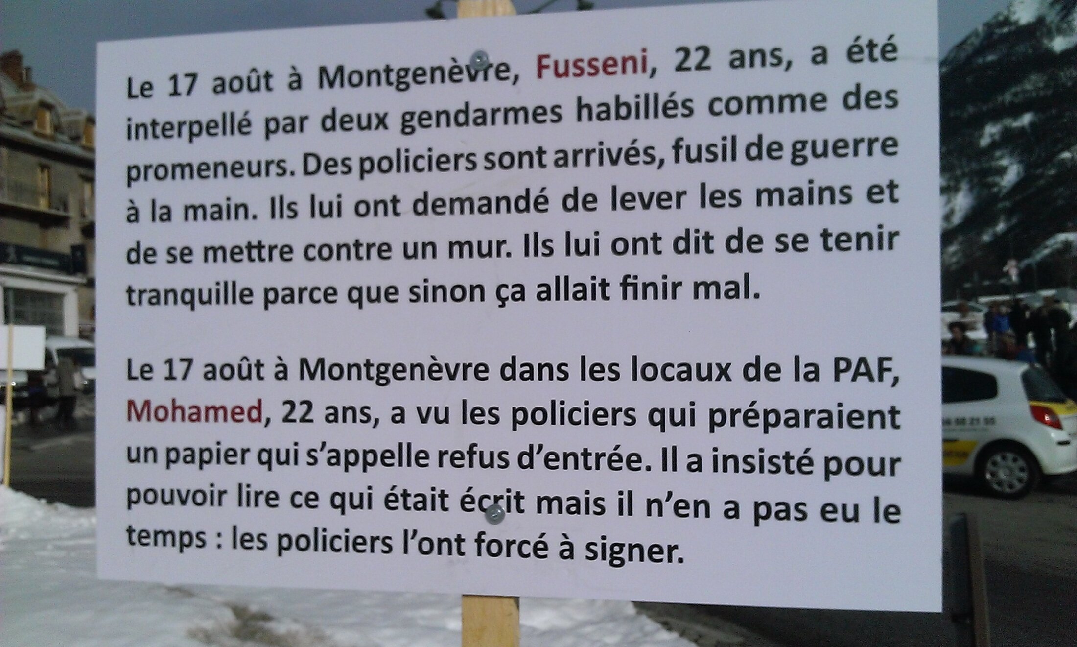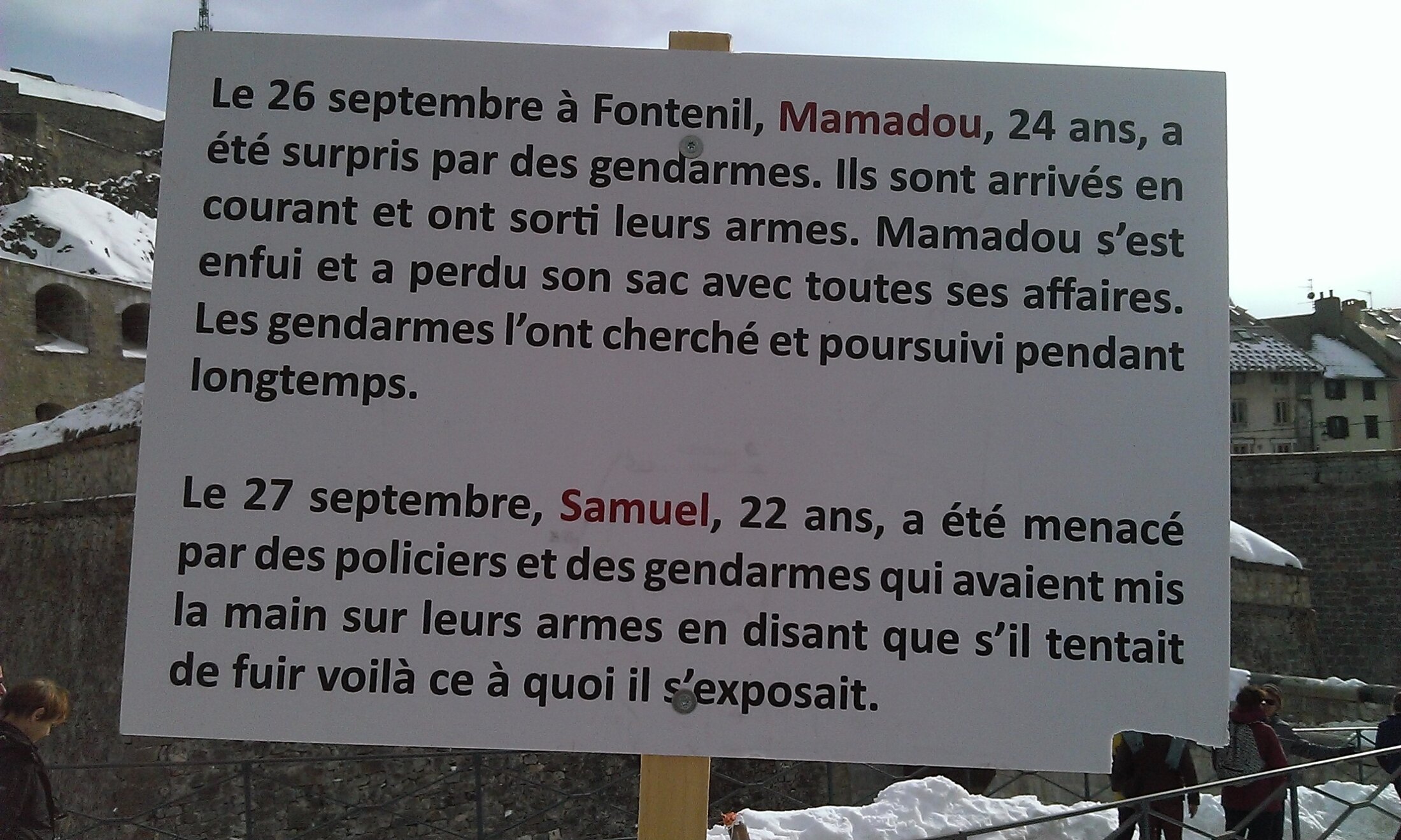 Dans la nuit du 6 au 7 février, Tamimou, jeune togolais, est mort d'hypothermie entre Montgenèvre et Briançon. La politique migratoire répressive mise en oeuvre par le gouvernement, au défi des droits fondamentaux des personnes, tue. Un rassemblement s'est tenu samedi à Briançon. Des panneaux évoquaient les traitements subis par ces personnes lors de leur périple.