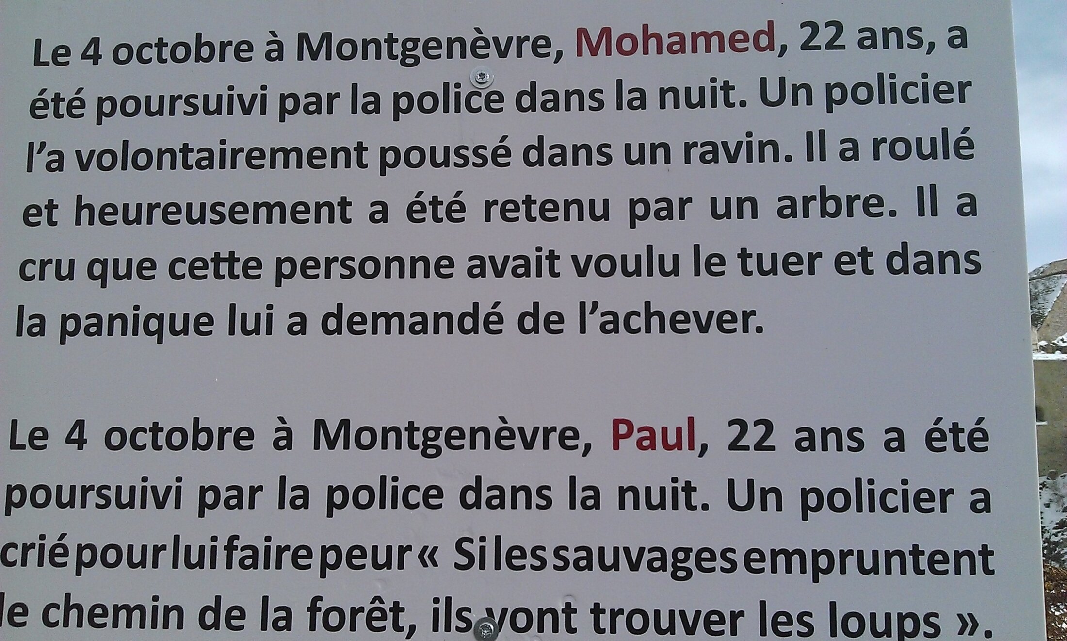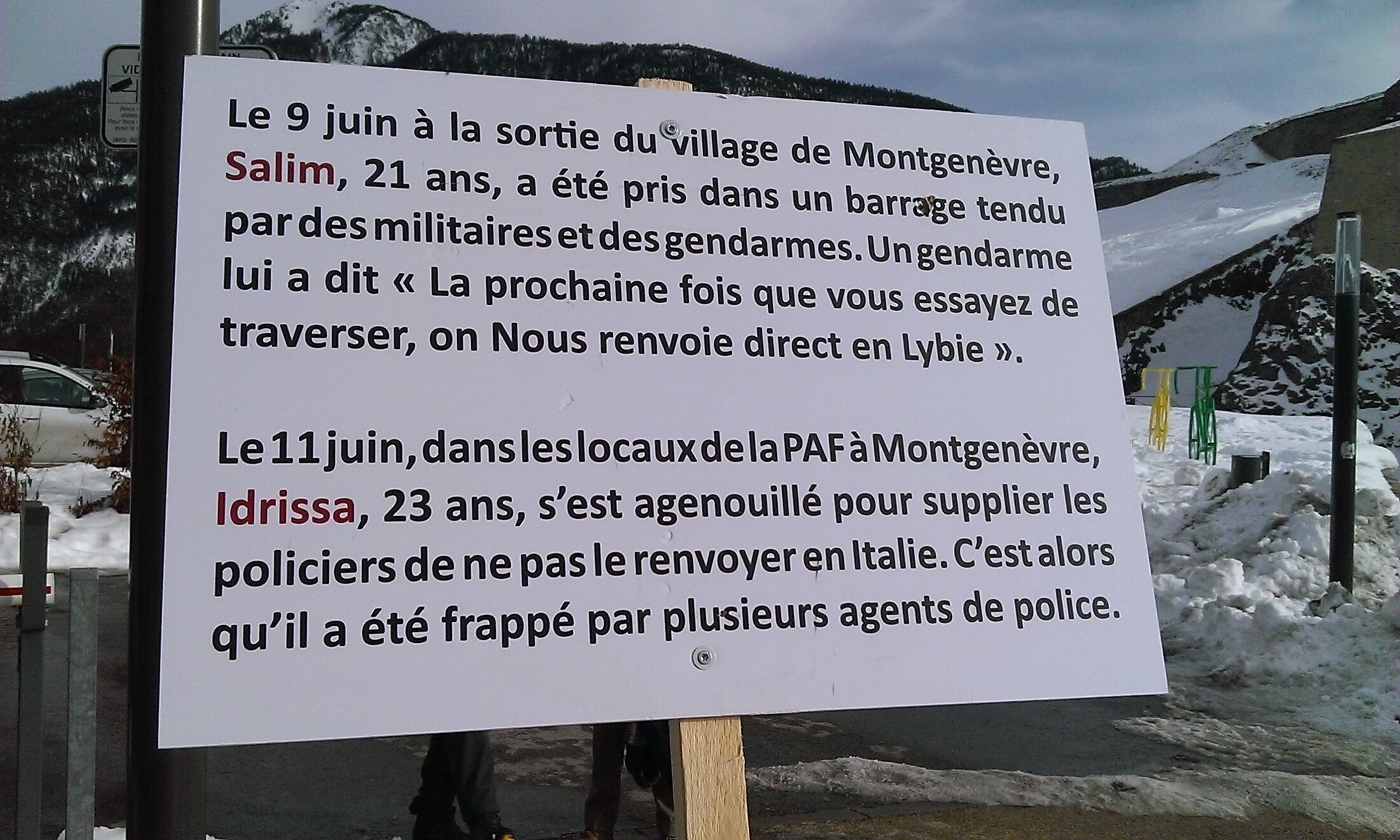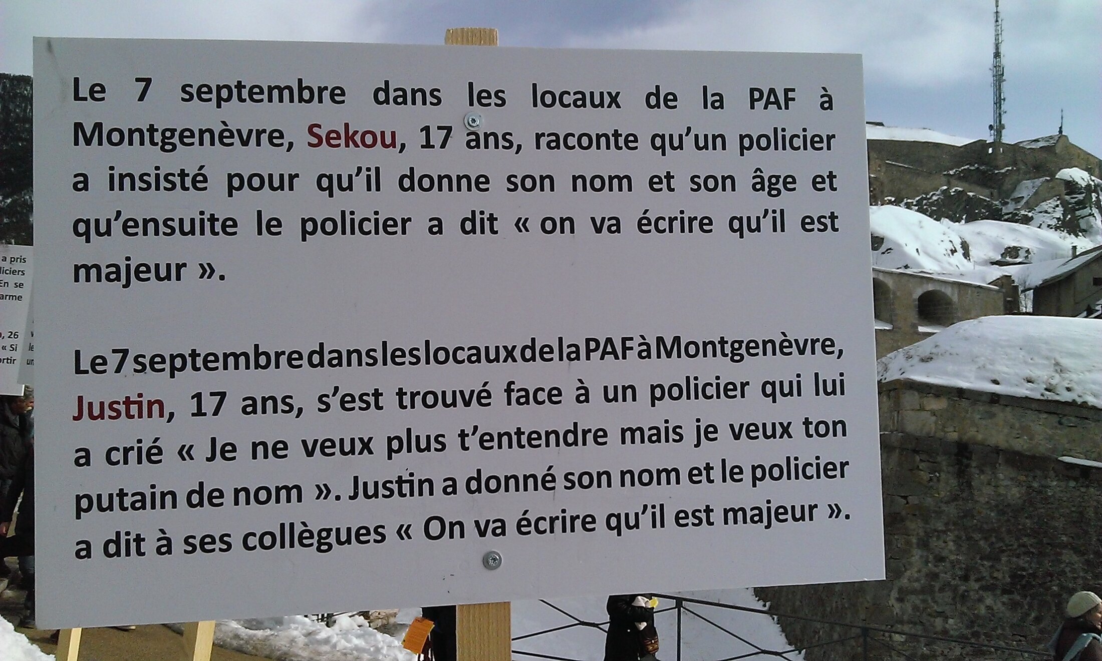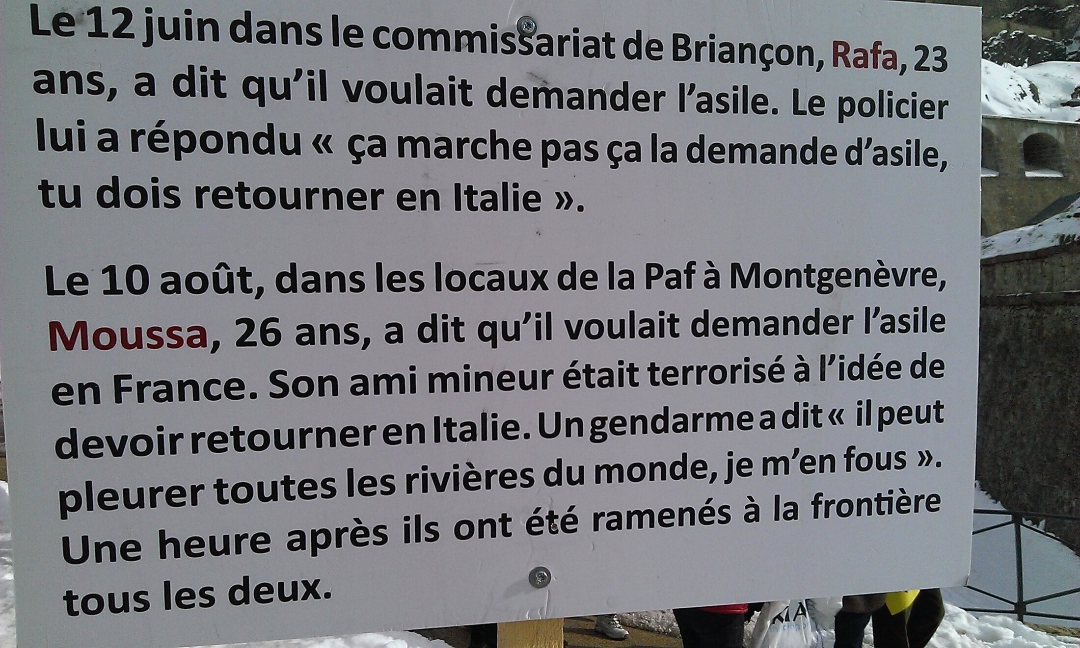 Dans la nuit du 6 au 7 février, Tamimou, jeune togolais, est mort d'hypothermie entre Montgenèvre et Briançon. La politique migratoire répressive mise en oeuvre par le gouvernement, au défi des droits fondamentaux des personnes, tue. Un rassemblement s'est tenu samedi à Briançon. Des panneaux évoquaient les traitements subis par ces personnes lors de leur périple.