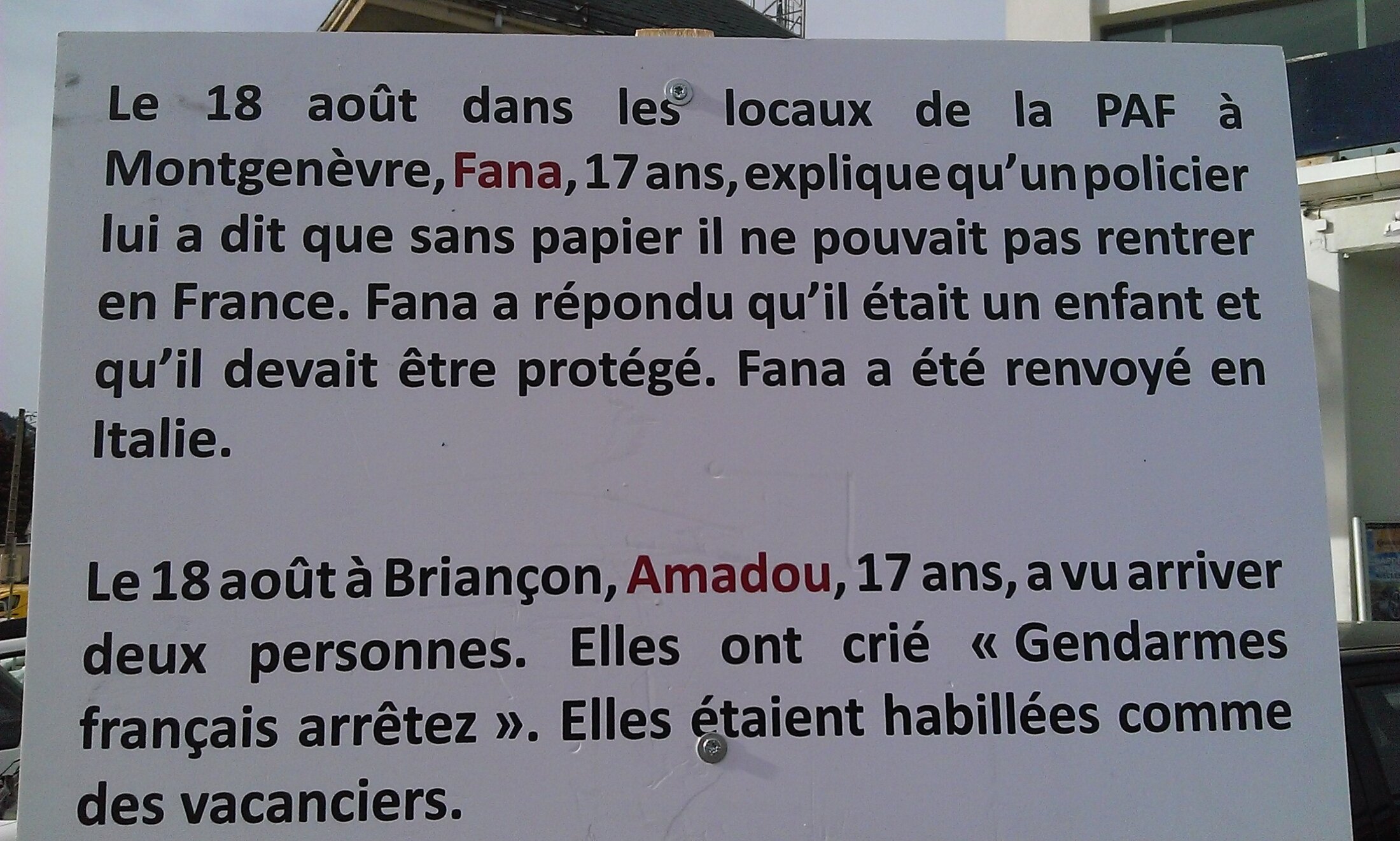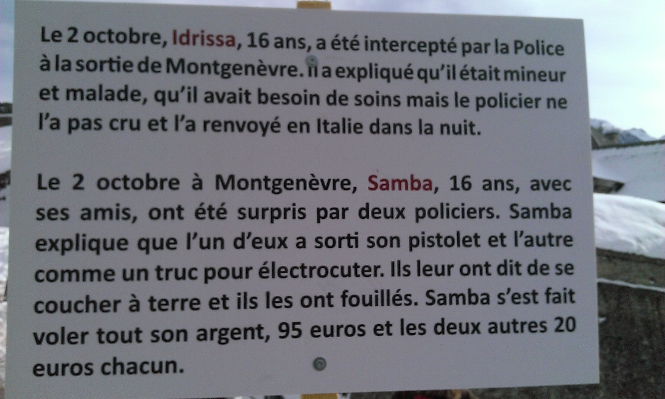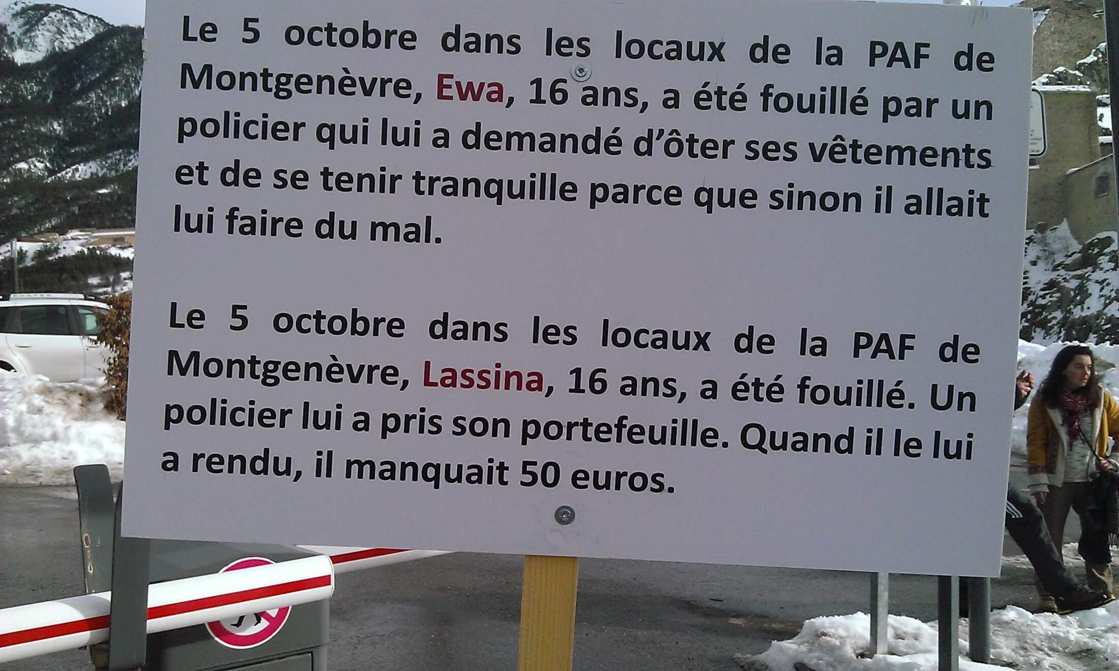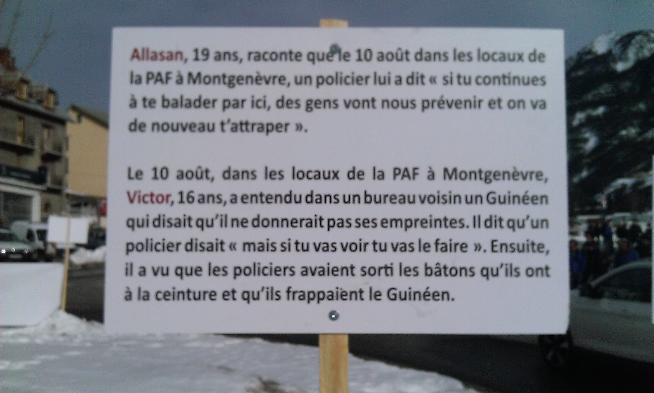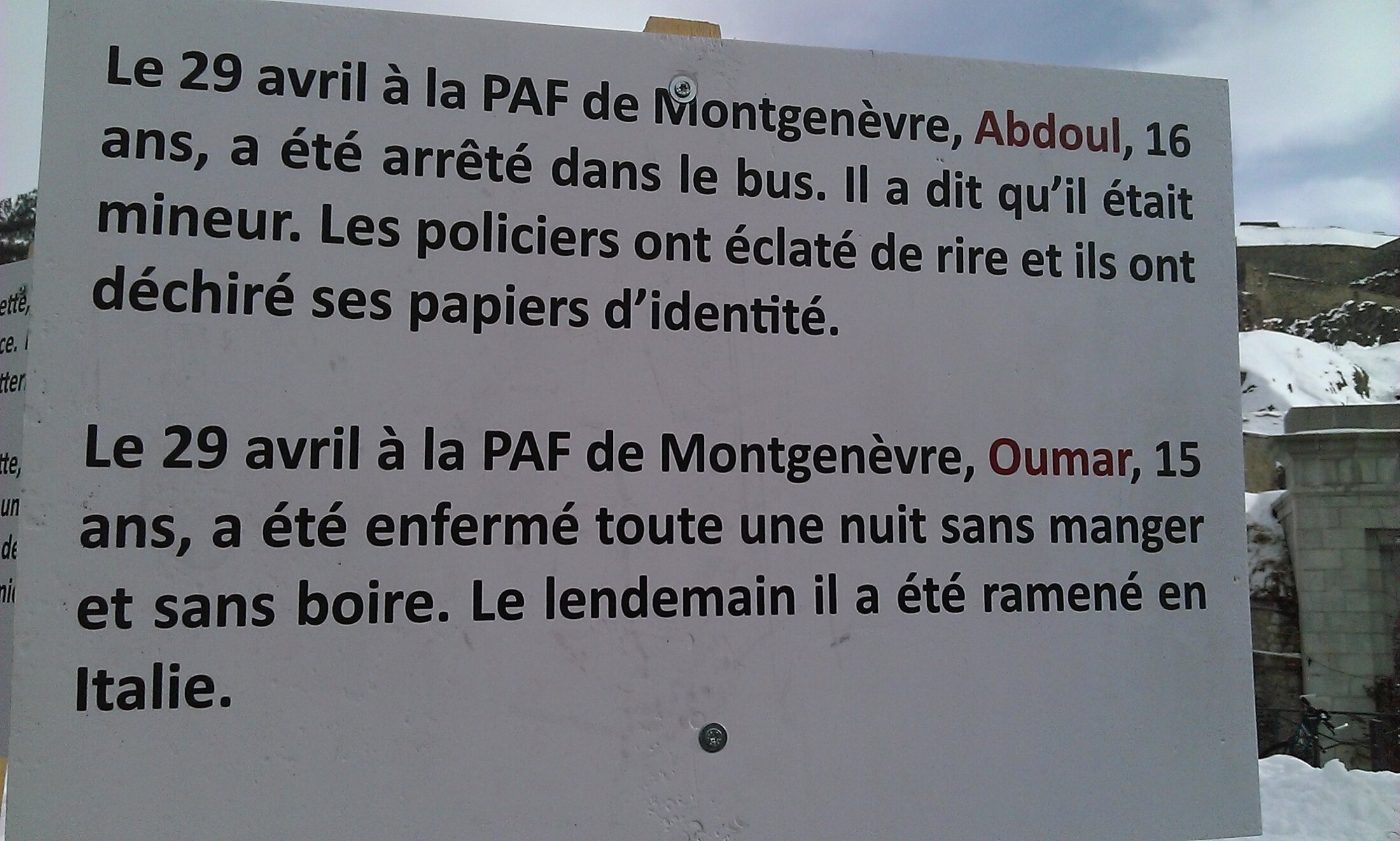 Dans la nuit du 6 au 7 février, Tamimou, jeune togolais, est mort d'hypothermie entre Montgenèvre et Briançon. La politique migratoire répressive mise en oeuvre par le gouvernement, au défi des droits fondamentaux des personnes, tue. Un rassemblement s'est tenu samedi à Briançon. Des panneaux évoquaient les traitements subis par ces personnes lors de leur périple.