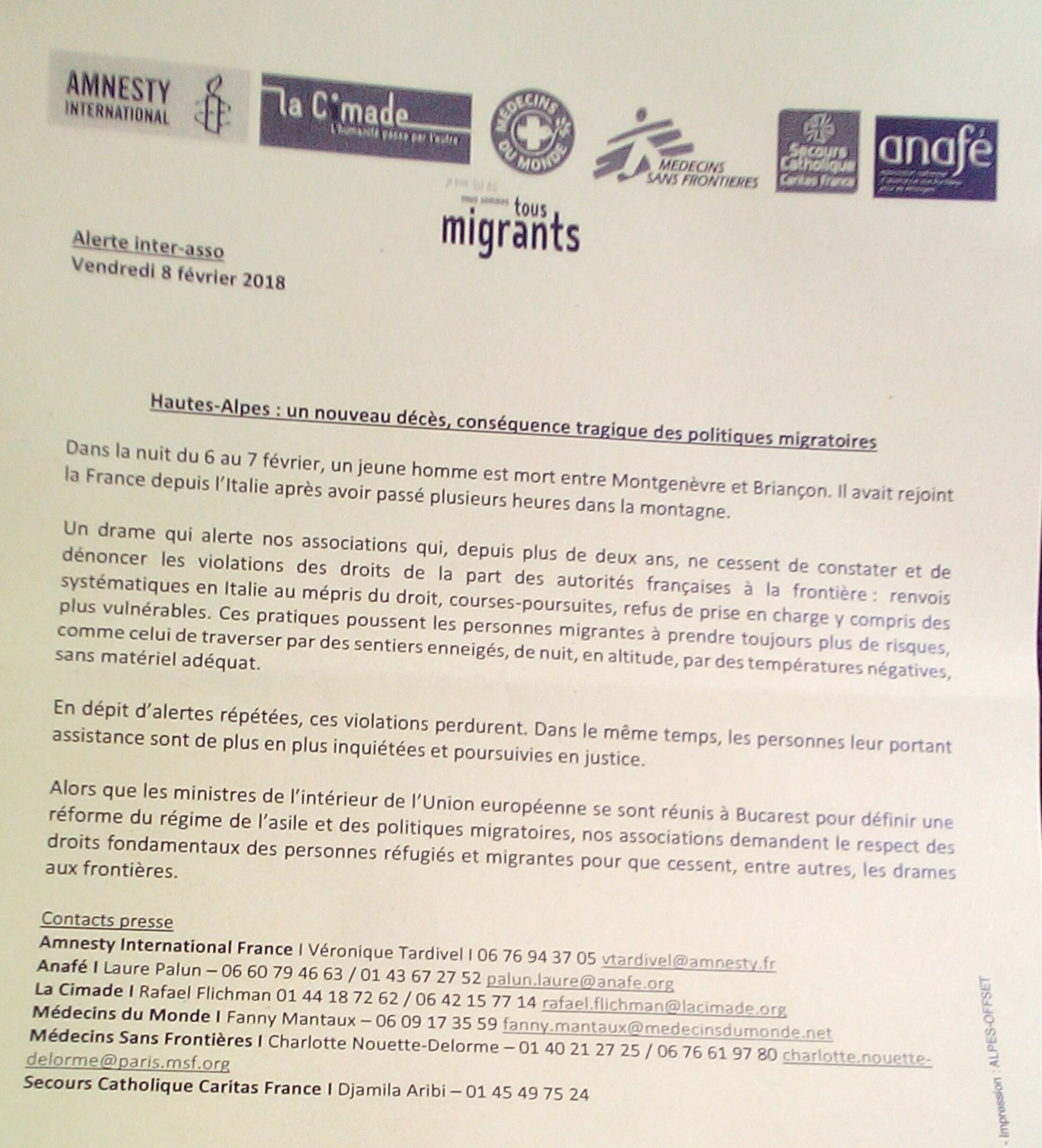 Encore un mort dans les montagnes du Briançonnais ! Cessons de nous taire ! Dans la nuit du 6 au 7 février, vers 3h30, Tamimou, un jeune togolais, est mort d'hypothermie sur la route entre Montgenèvre et Briançon. Cette nuit-là, un groupe de personnes a tenté de franchir la frontière franco-italienne à travers les montagnes. Le groupe a marché pendant des heures, s'enfonçant rapidement dans la neige. Tamimou a perdu ses bottes, a continué en chaussettes et s'est très vite retrouvé en hypothermie. Le groupe a porté Tamimou et rejoint la route pour appeler au secours. Postés au milieu de la chaussée pour tenter d'arrêter les voitures, celles-ci les ont contournés, personne ne s'est arrêté. Les secours appelés plusieurs fois sont finalement arrivés deux heures après le premier appel. Durant ce temps, Tamimou est mort au bord de la route. Depuis juin 2015, la France ferme et militarise ses frontières avec l'Italie. Briançon est la première ville refuge de ce côté-ci de la frontière pour beaucoup de personnes qui franchissent cette frontière. Nous ne voulons plus de personnes mises en danger dans nos montagnes, déclarent les associations solidaires, les bénévoles qui tentent de porter secours. Le renforcement et la militarisation des frontières européennes a tué des milliers de personnes. Le Sahara, la Méditerranée et maintenant nos montagnes sont des murs qui exposent les personnes à des dangers mortels pourtant évitables. L'augmentation de contrôles pousse les personnes à se mettre toujours plus en danger. Ces morts ne sont pas des accidents. Nous ne pouvons les ignorer et laisser les montagnes se transformer en cimetière.