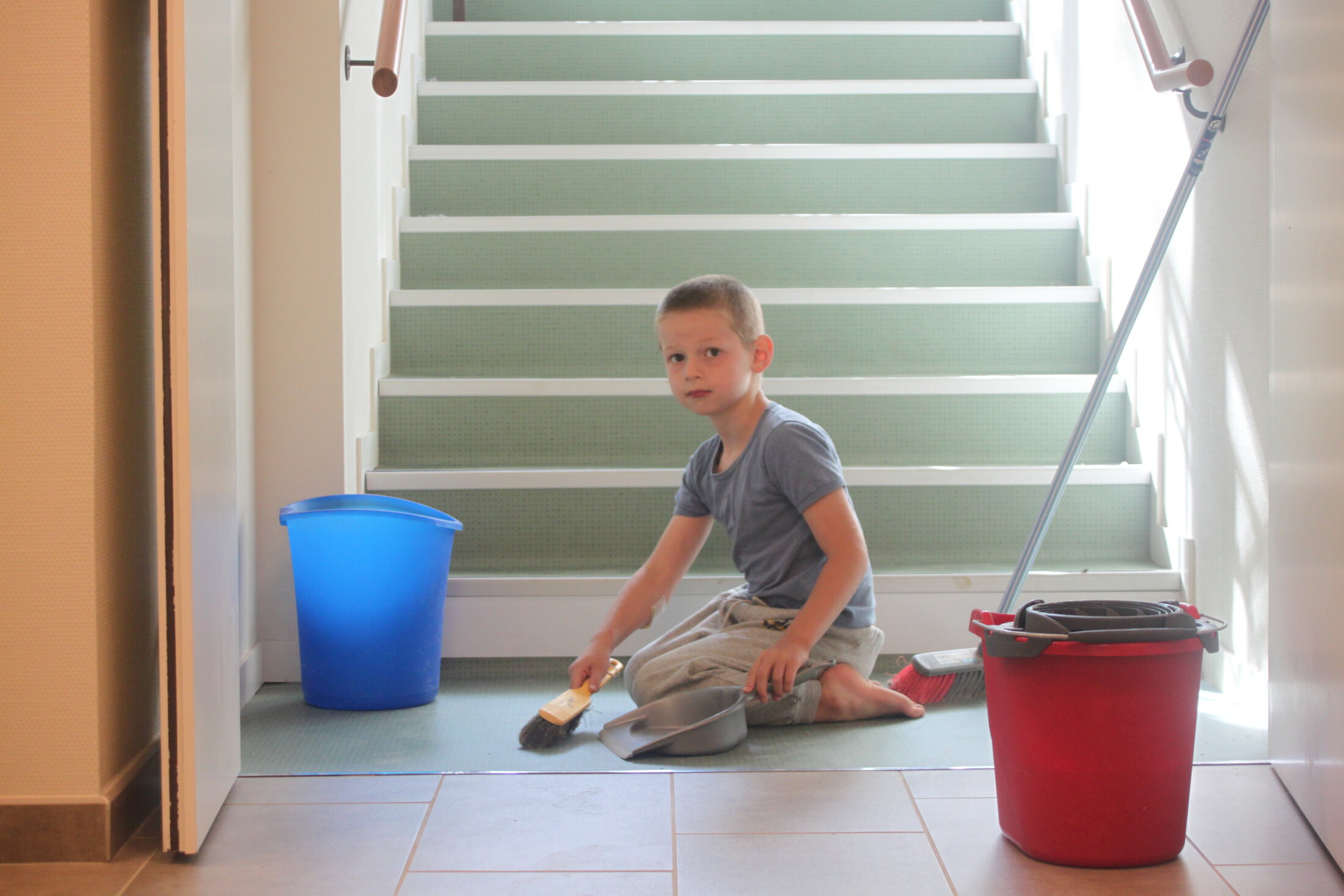Je vous ai dit que pendant le séjour, on cherche à estomper la différence entre vacanciers et accueillants. Mais il y a quand même toute une logistique à assurer quand on est 30 dans la maison, et entre accueillants on se répartit quelques taches pour être sûr que tout roule. Ce matin-là je devais passer un coup de balais dans la maison. Mathis s’ennuyait et s’excitait, ça n’annonçait rien de bon. Je lui ai proposé de m’aider en ramassant les tas de poussières, une façon d’être ensemble. Il était si fier de m’aider ! J’ai posé mon balais et couru chercher l’appareil photo pour, plus tard, partager ce moment avec sa maman, je voulais qu’elle aussi puisse être fière de lui. (ça fait tellement du bien d’être fier de son enfant, combien plus quand on vous fait douter de votre capacité à être parent!)