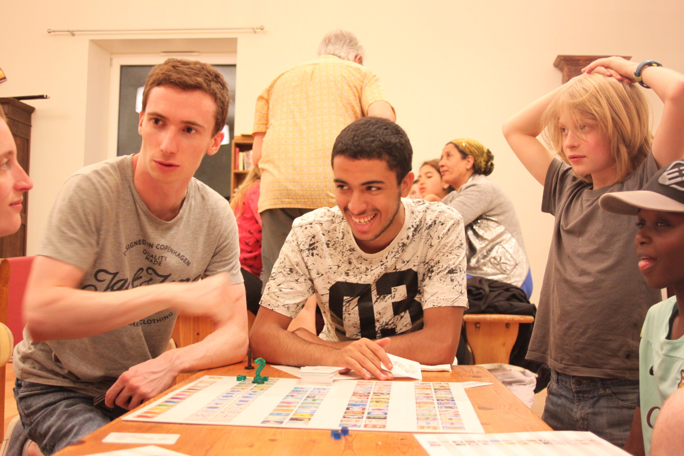 Au fond on voit Tom et Samir sur un banc. Ils se sont connus quelques semaines plus tôt lors d’un chantier-jeunes à la Bise. Tom est revenu comme accueillant, et Samir qui n’habite pas loin vient souvent filer des coups de main. Samir est afghan, il vient d’obtenir le statut de réfugié. Il était de passage ce jour là et c’est le genre d’imprévu que j’aime ; que tout le monde sente qu’il n’y a rien de plus naturel que d’être bien ensemble.