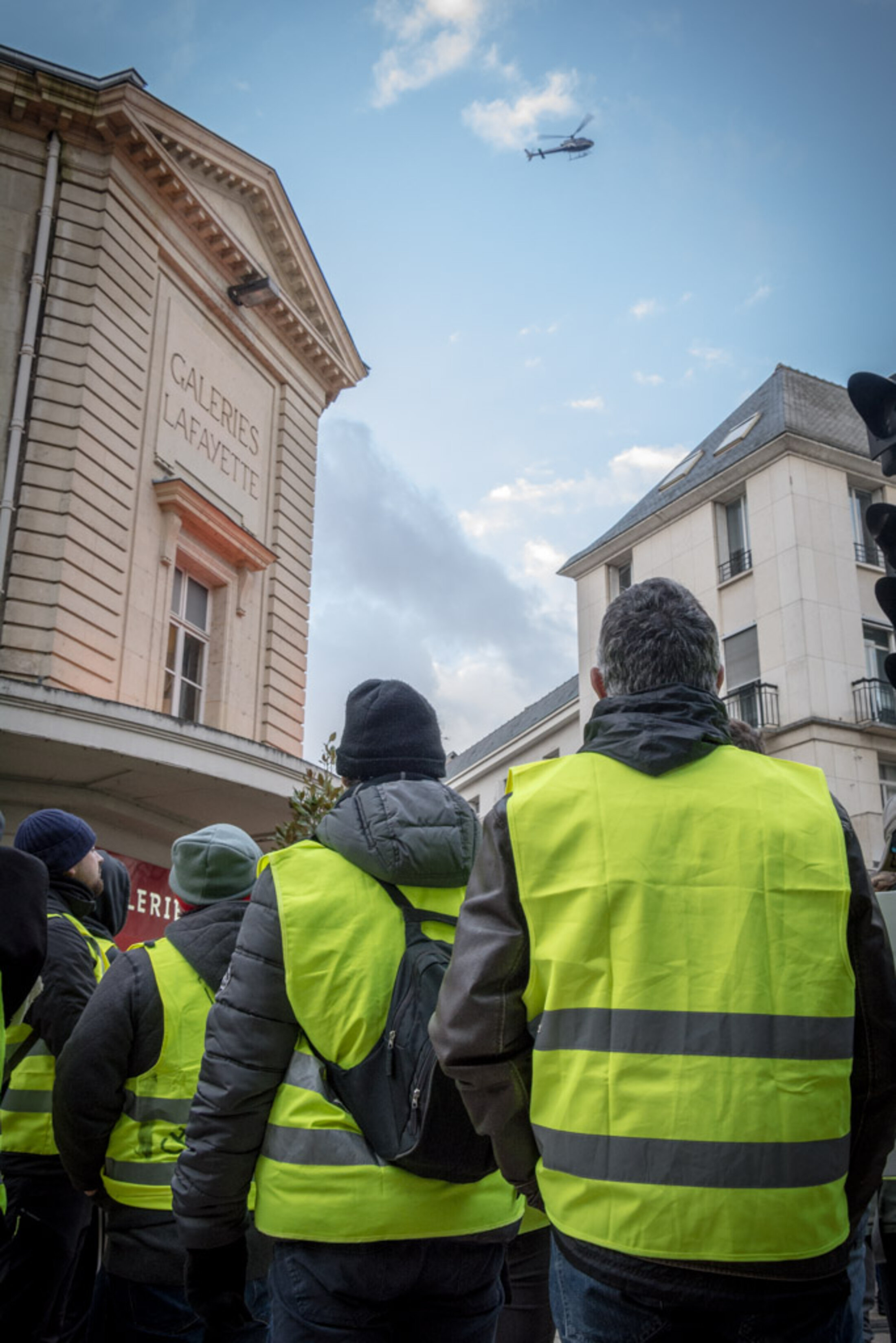 Rue nationale, l'hélicoptère de la gendarmerie survole la foule.