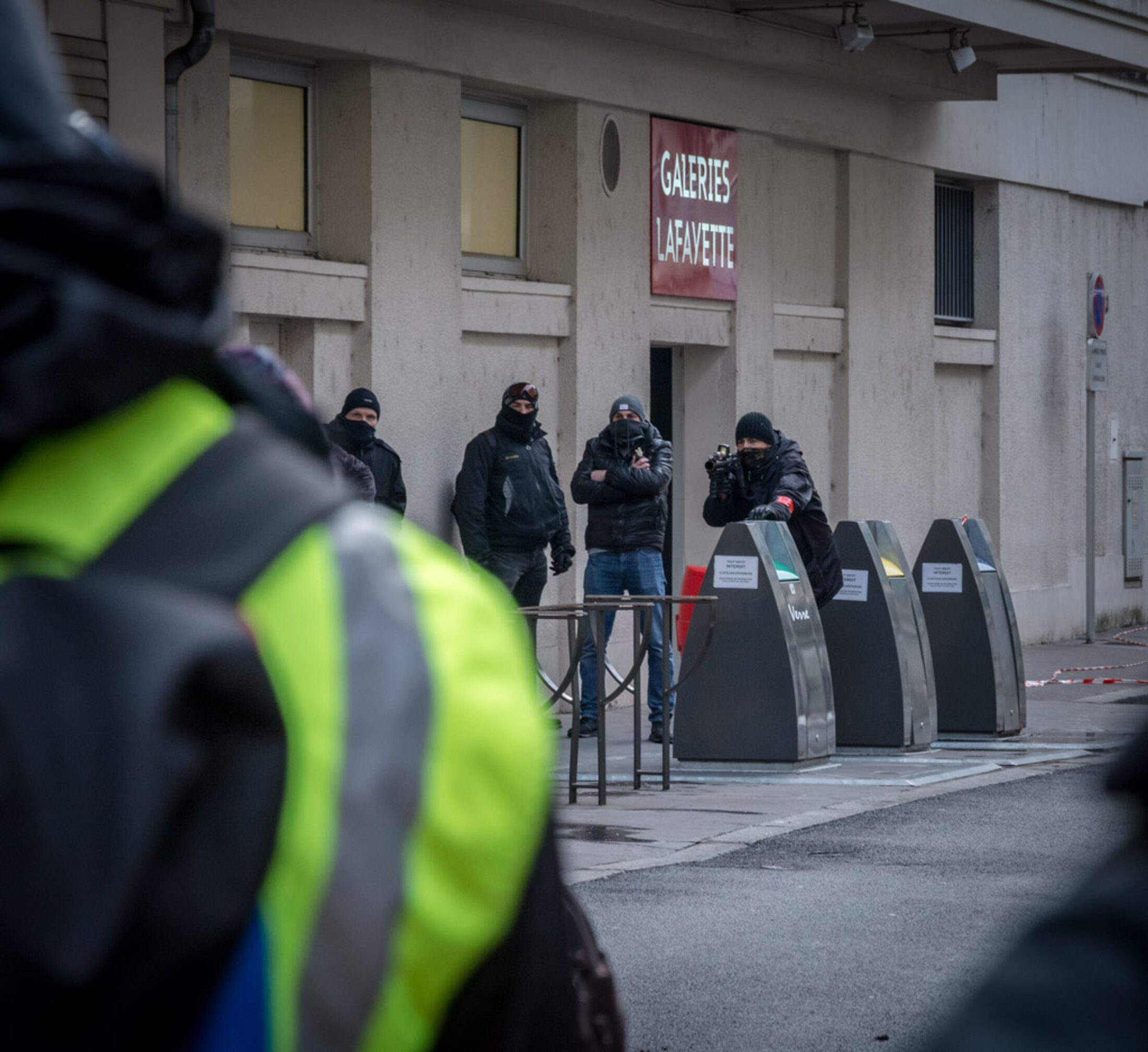 Rue nationale. Un policier de la BAC braque son lanceur de balles de défense sur la foule.